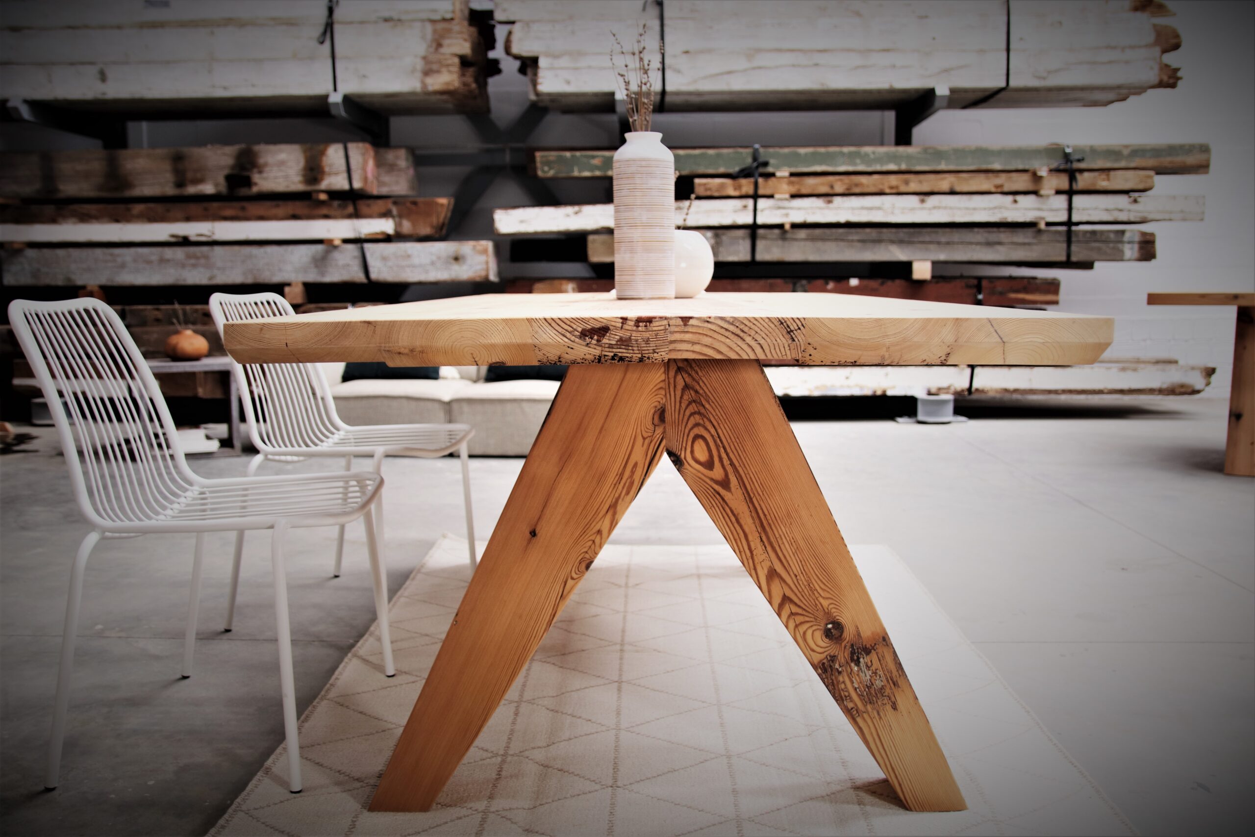Esta mesa se realizó en madera de Tea Antigua recuperada de un edificio histórico del S.XVIII de la ciudad de Cádiz. Lleva un acabado natural que da la impresión de que la madera está cruda, aunque en realidad lleva 3 capas de protección.