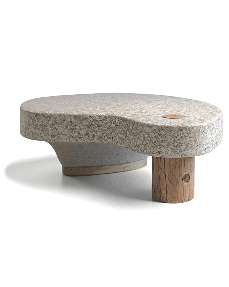 black marble, emperador marble, reclaimed oak & chestnut, woodchip and shredded carton mortar