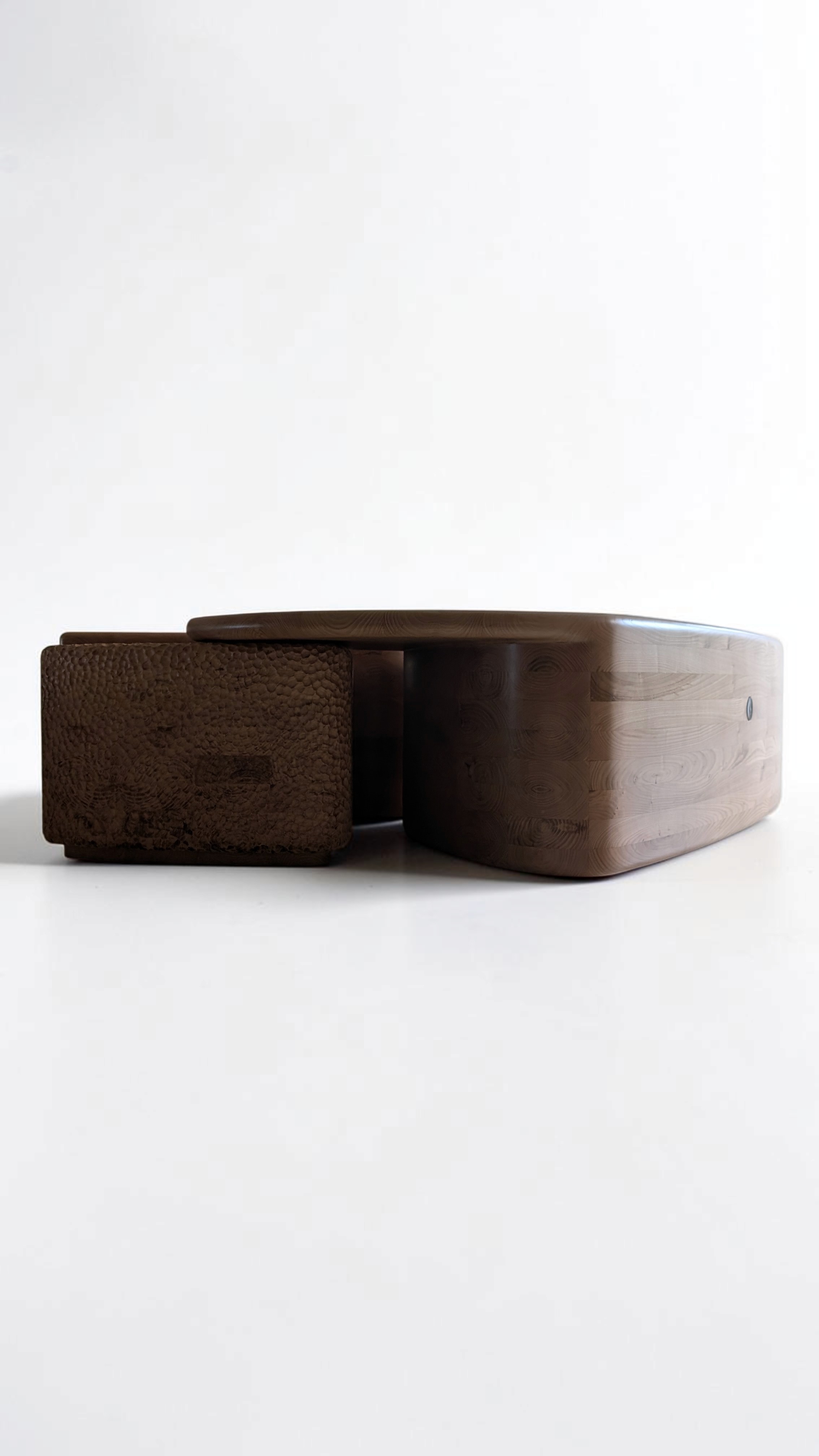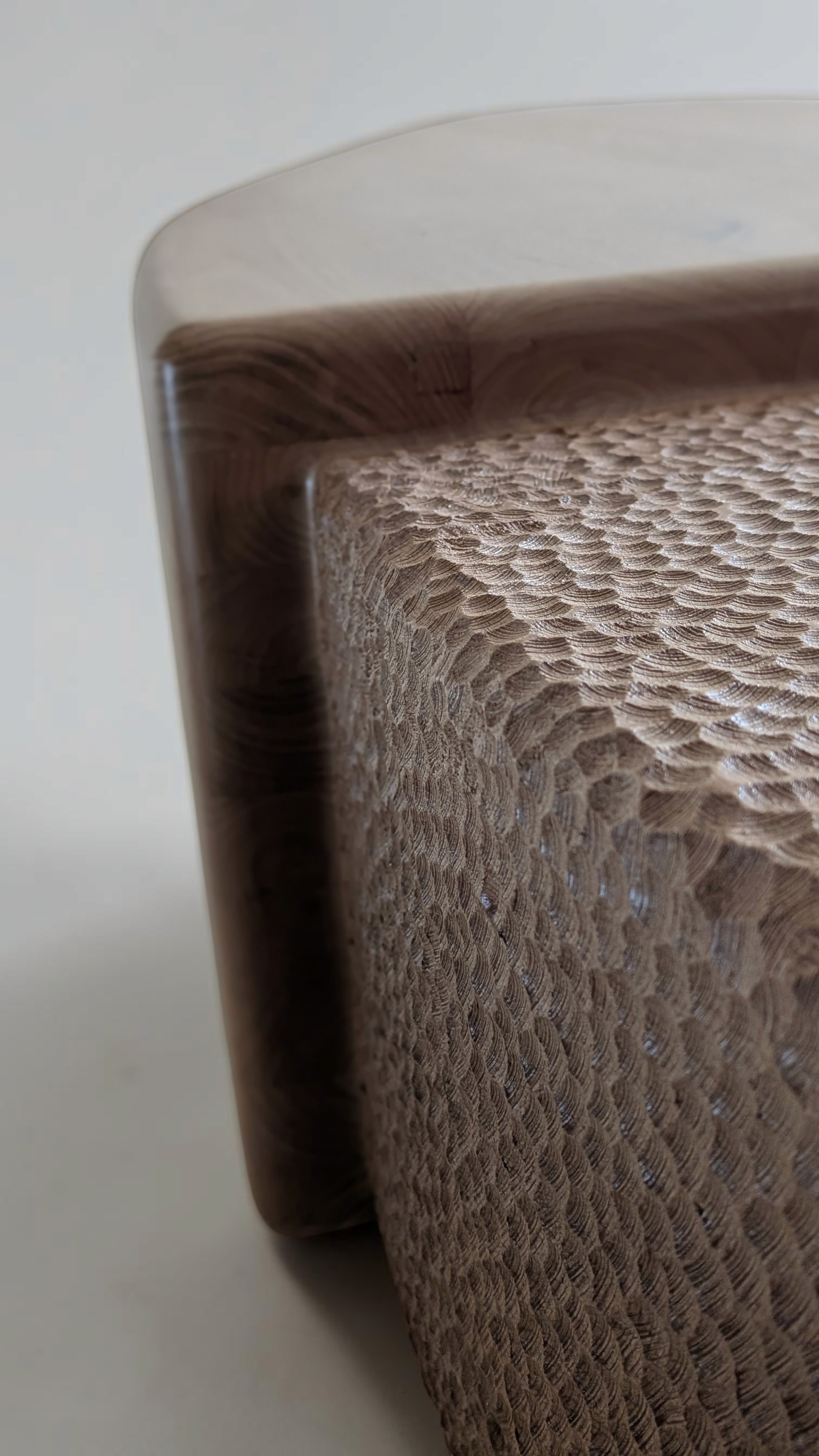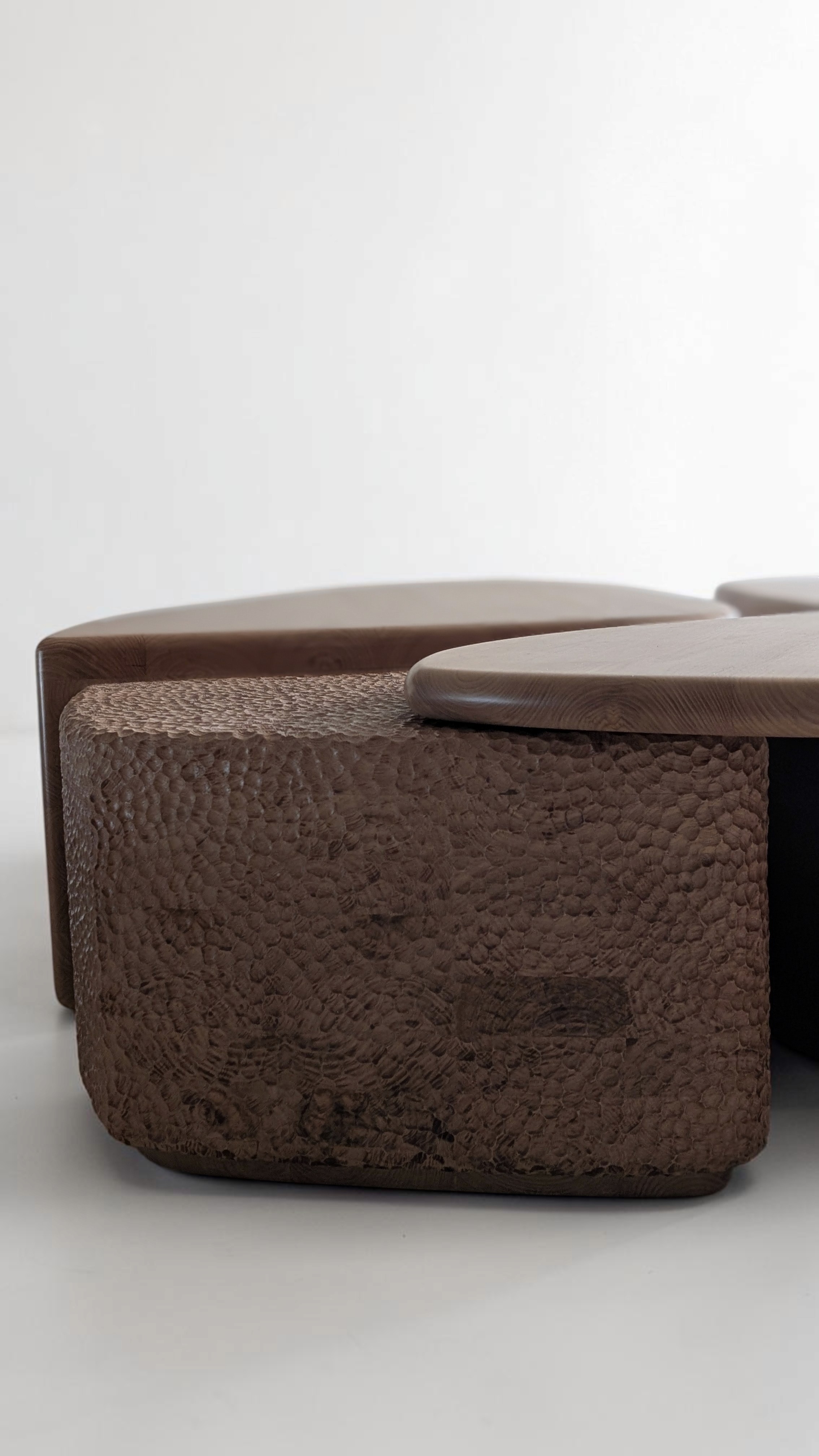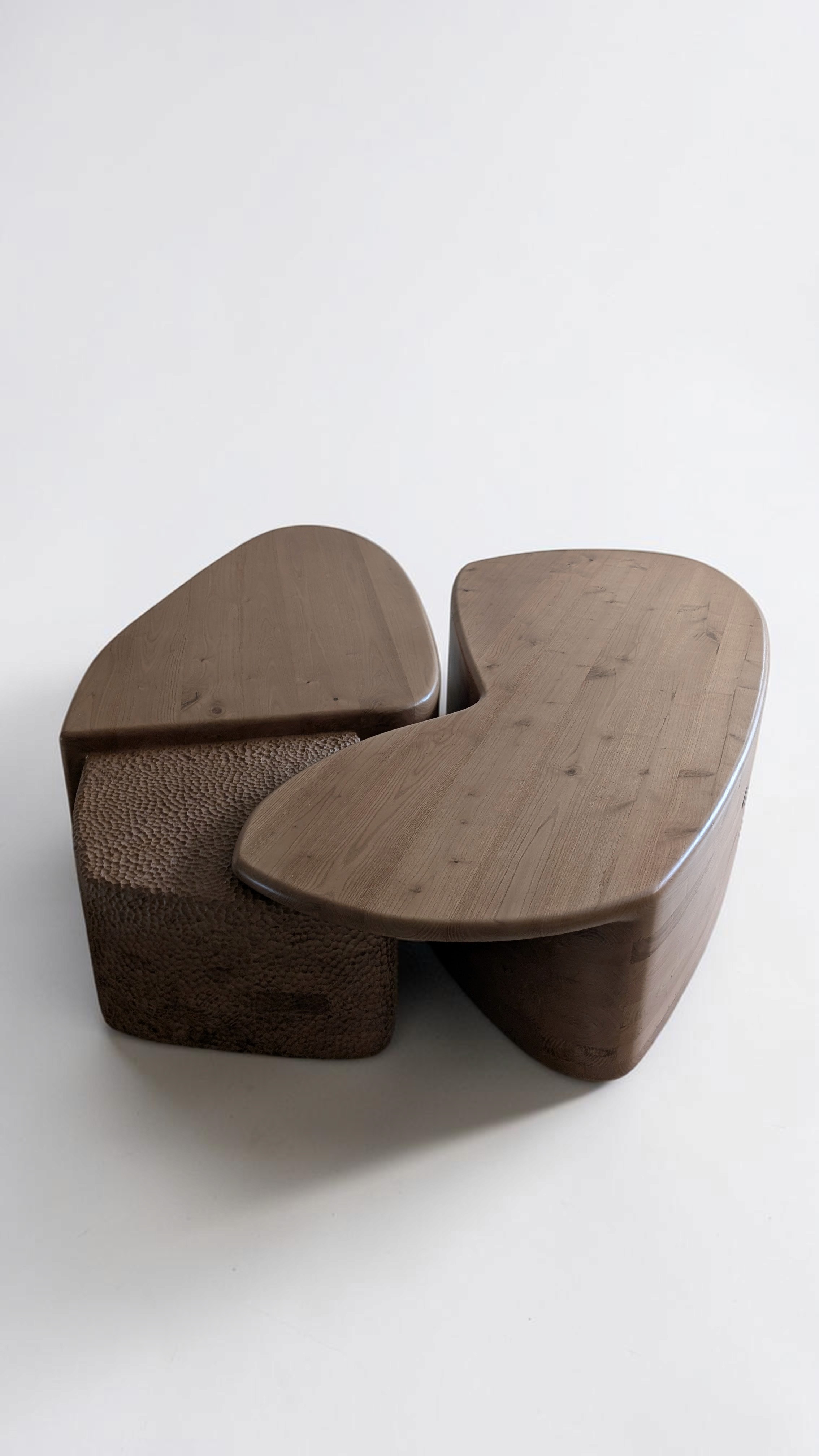 He took that seriously. Two sinuous, solid-wood tables — each complete on its own, each more interesting next to the other. They fit together with a precision that feels accidental, the way things in nature fit together: the top of one piece overlapping the carved, deliberately impractical surface of the other, leaving a gap between them. A space that catches shadow. A space that does nothing useful and everything right.