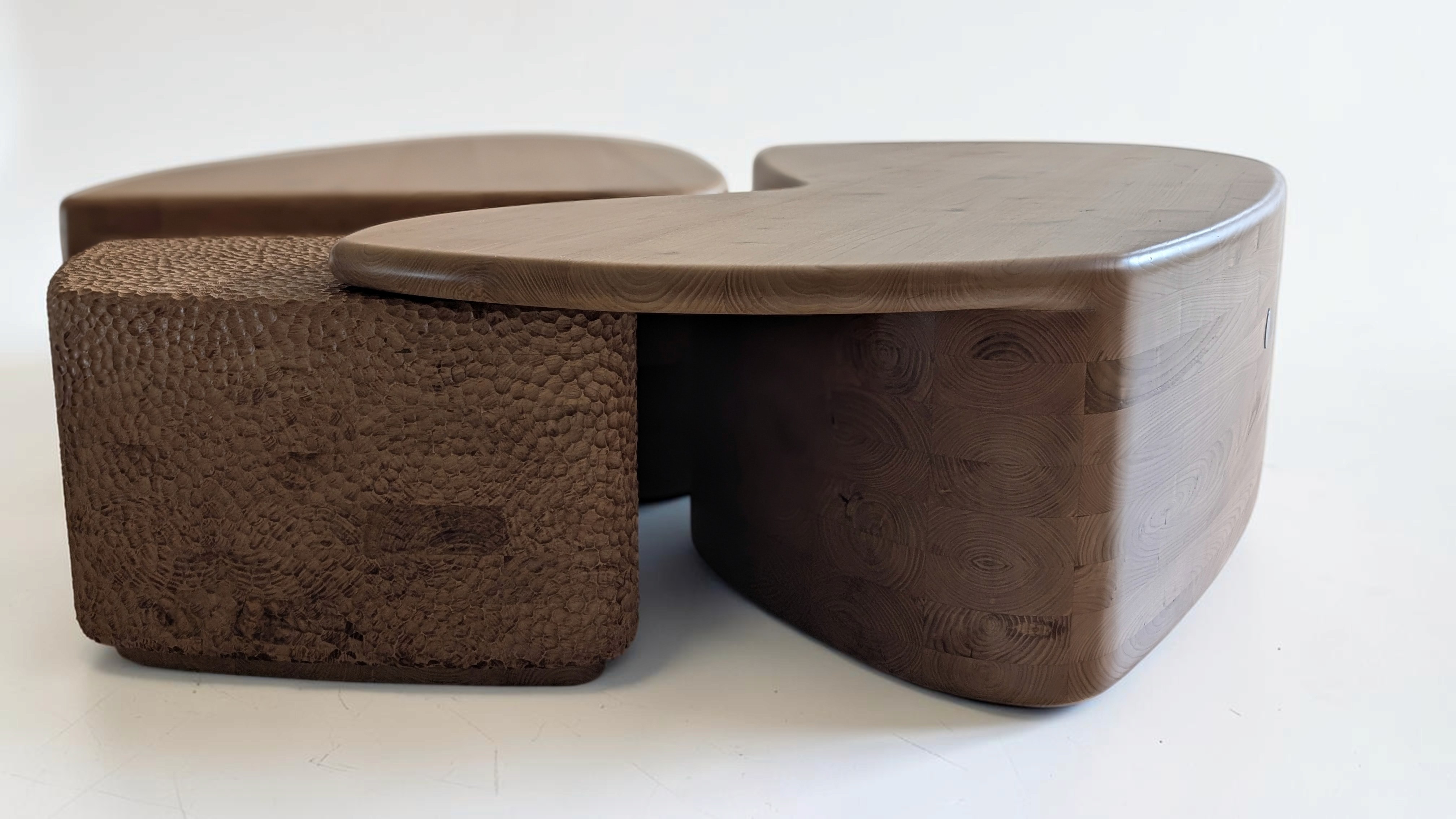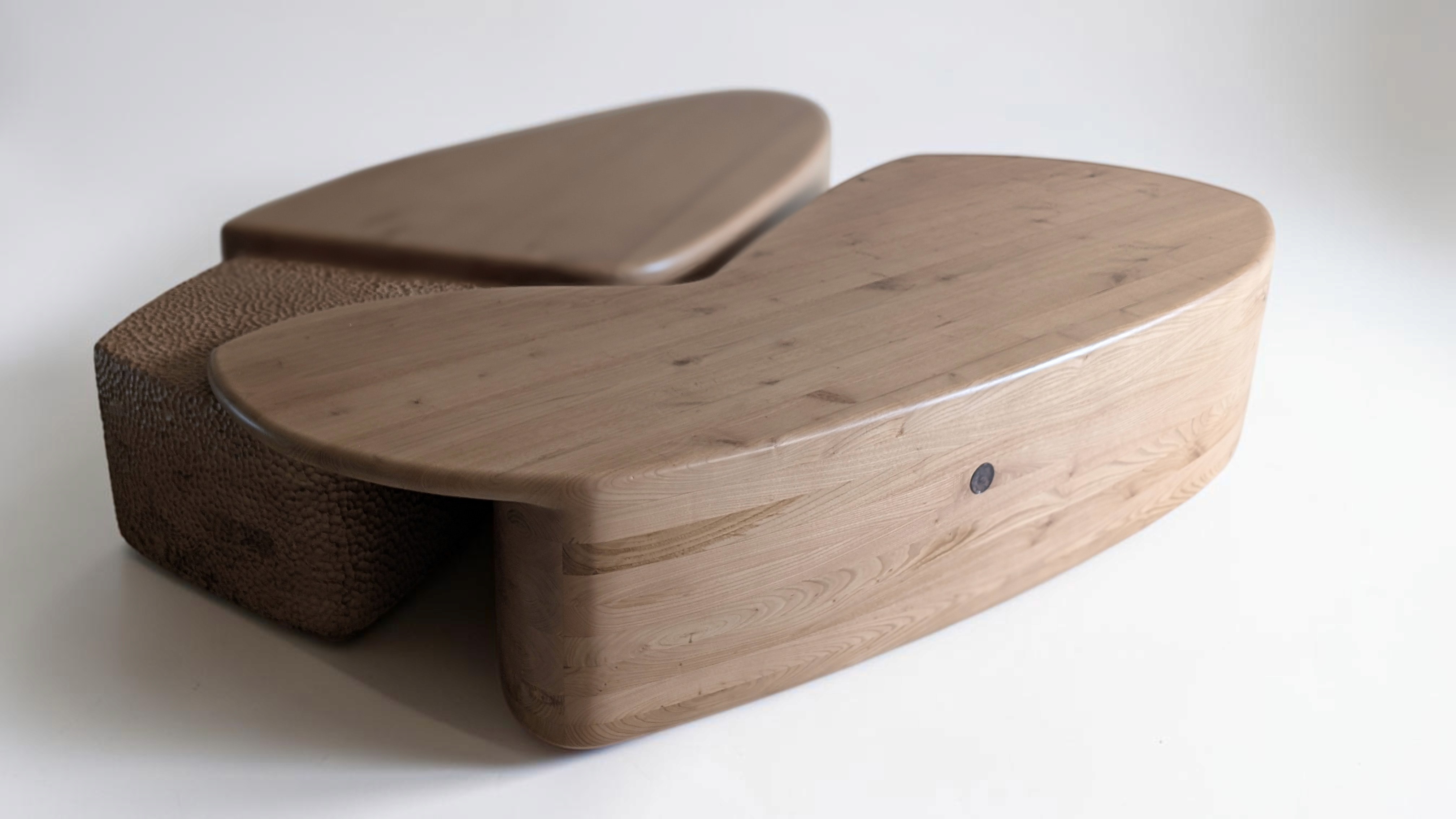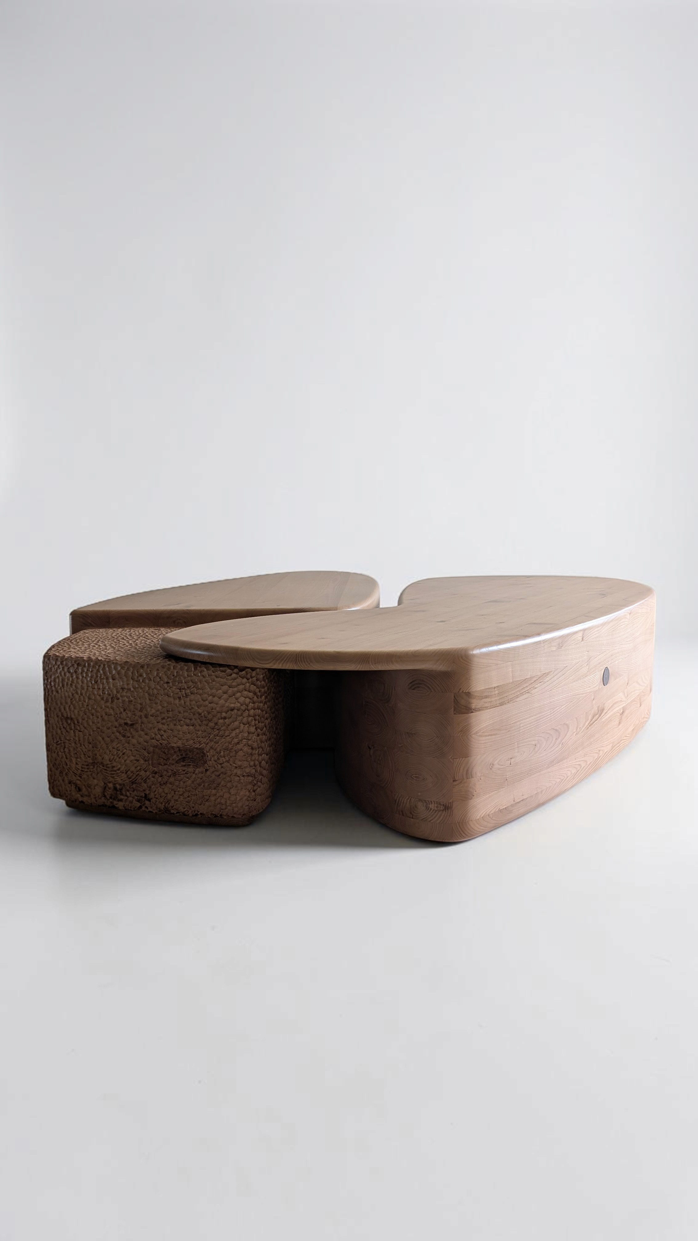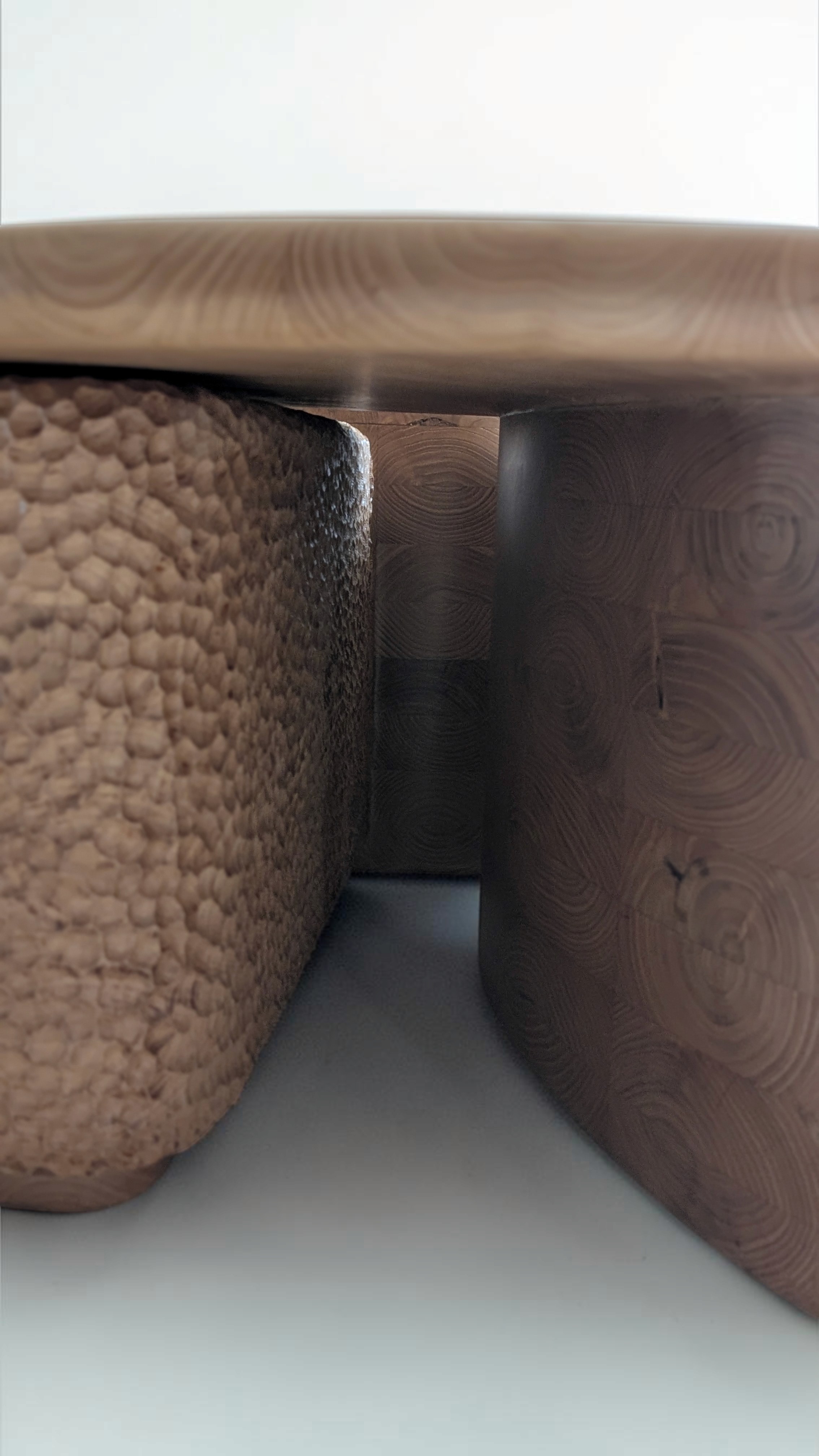 He took that seriously. Two sinuous, solid-wood tables — each complete on its own, each more interesting next to the other. They fit together with a precision that feels accidental, the way things in nature fit together: the top of one piece overlapping the carved, deliberately impractical surface of the other, leaving a gap between them. A space that catches shadow. A space that does nothing useful and everything right.