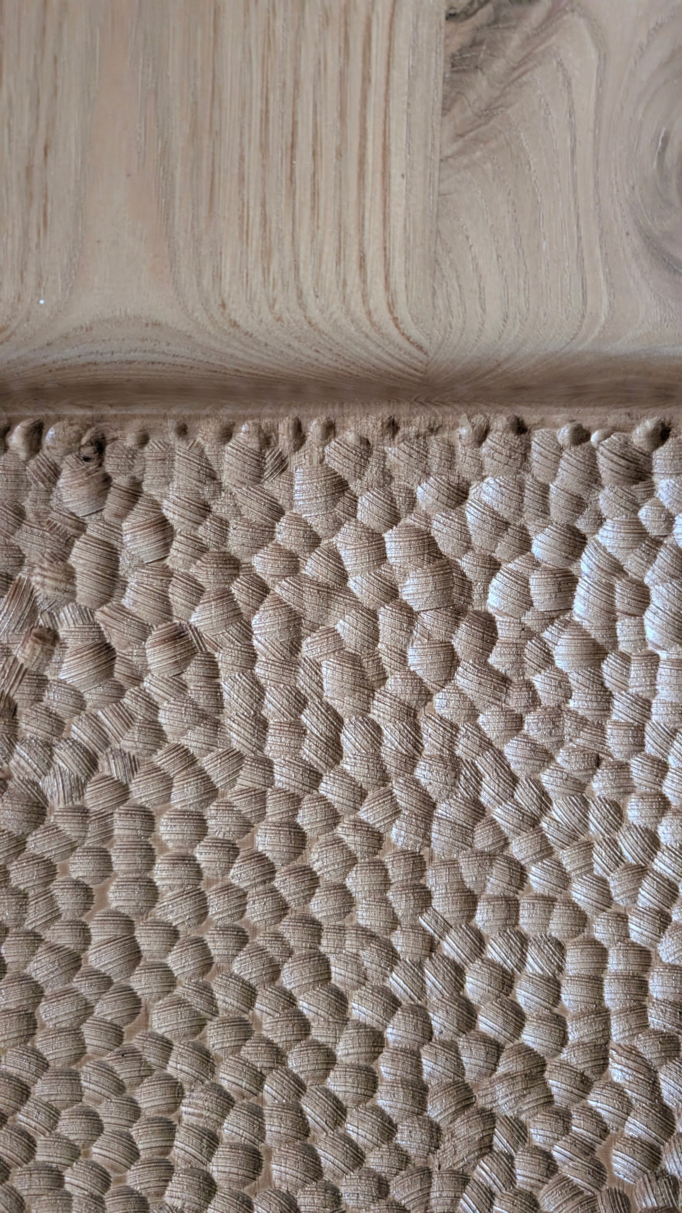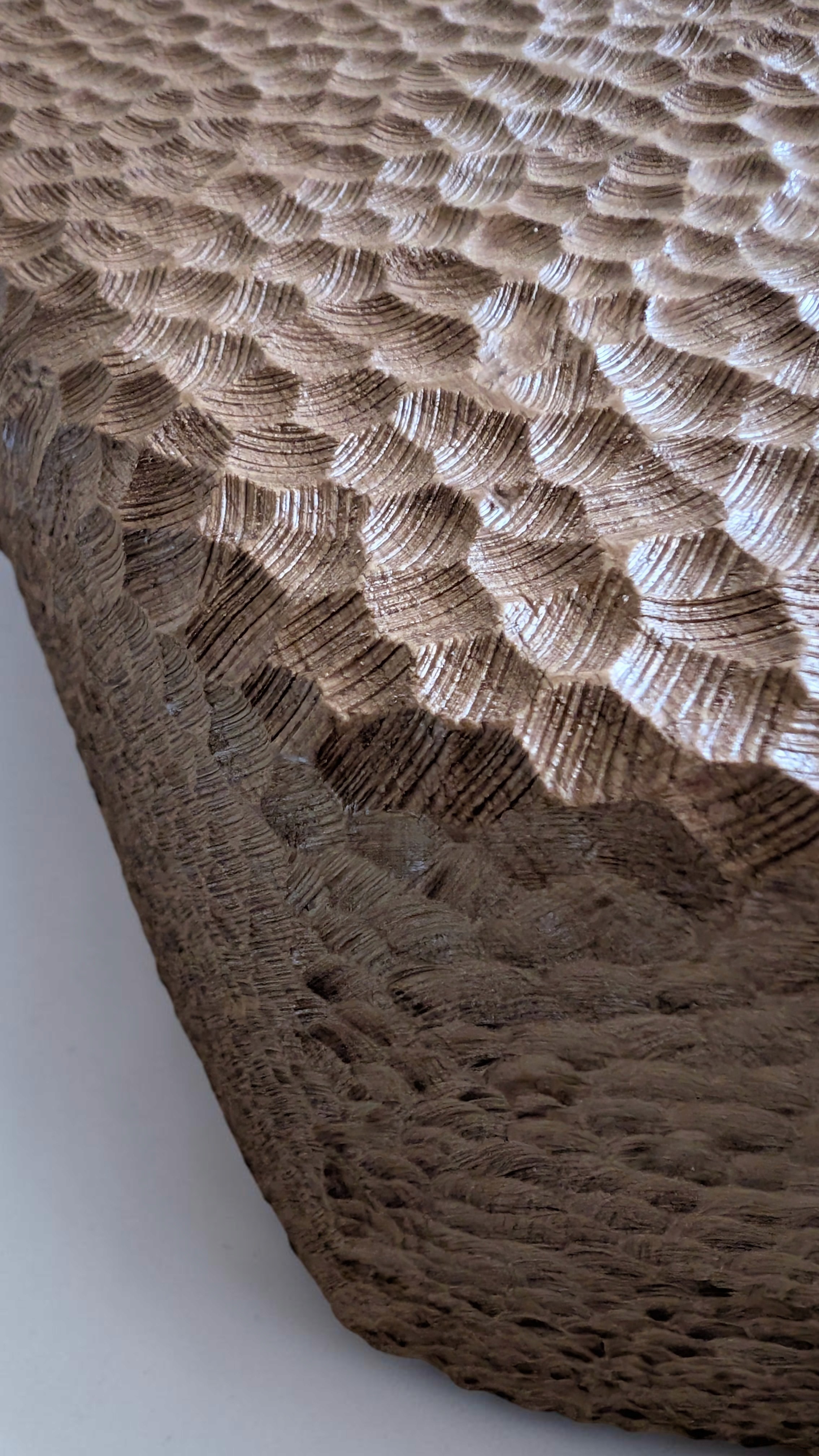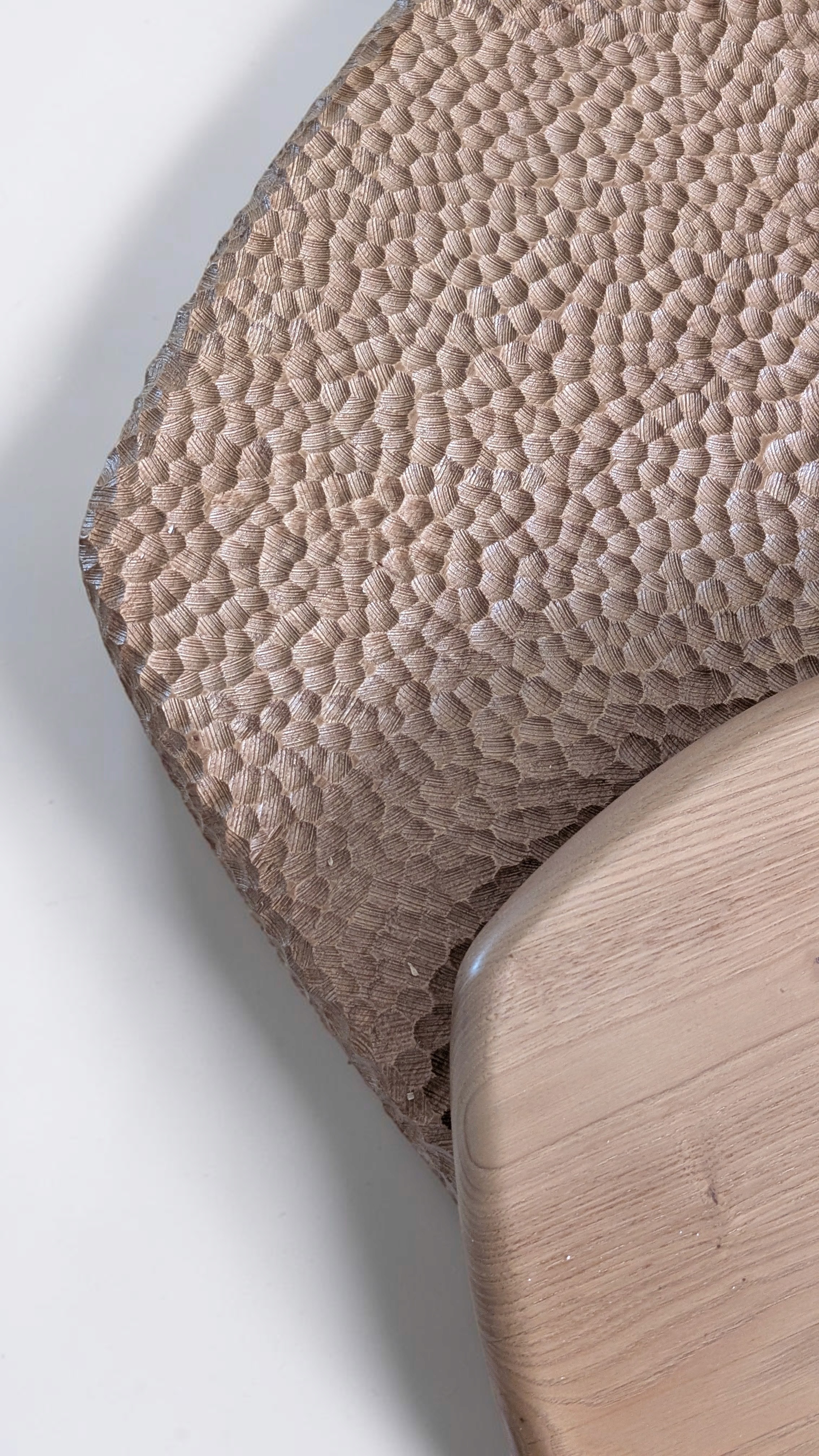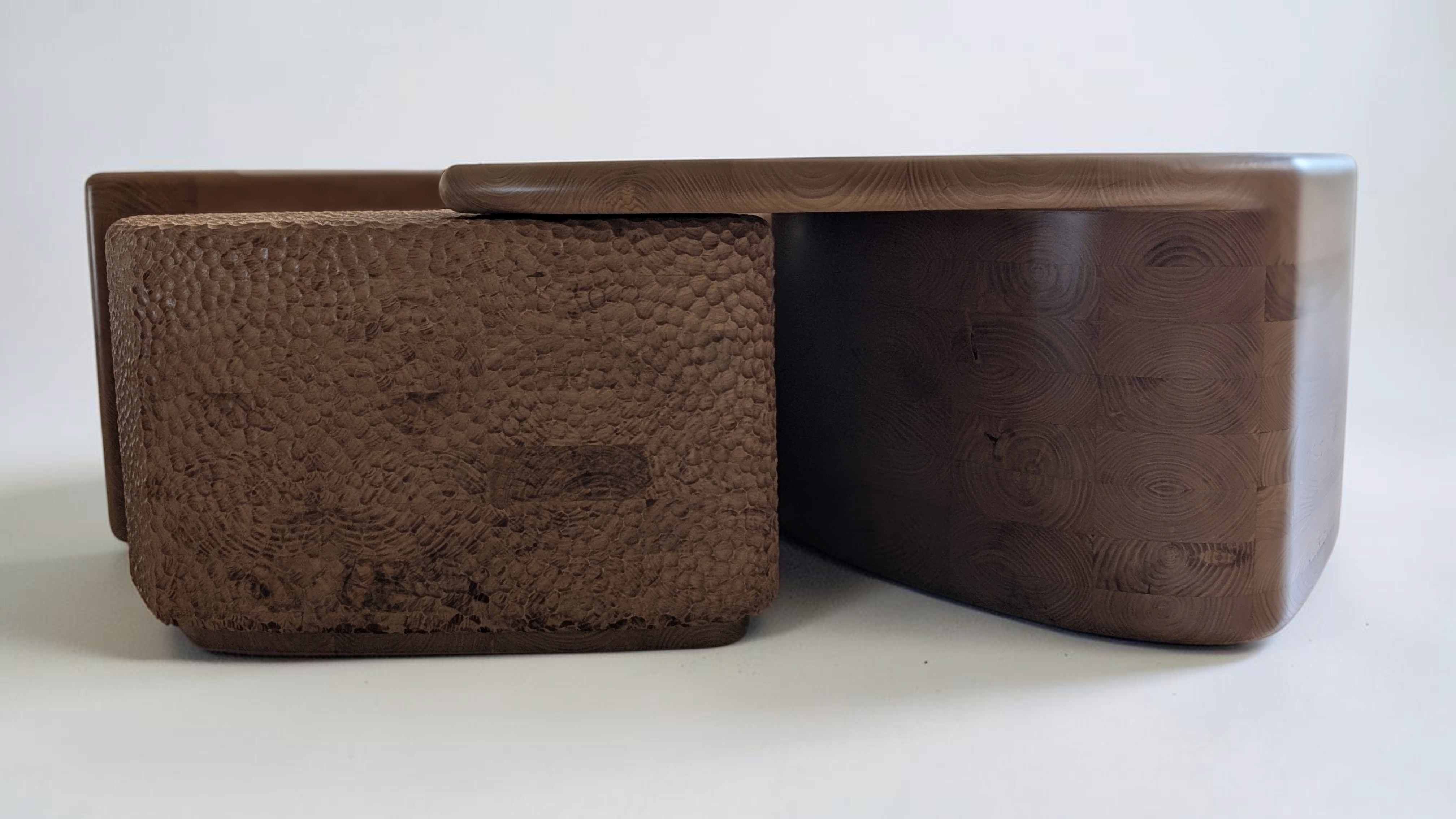 He took that seriously. Two sinuous, solid-wood tables — each complete on its own, each more interesting next to the other. They fit together with a precision that feels accidental, the way things in nature fit together: the top of one piece overlapping the carved, deliberately impractical surface of the other, leaving a gap between them. A space that catches shadow. A space that does nothing useful and everything right.