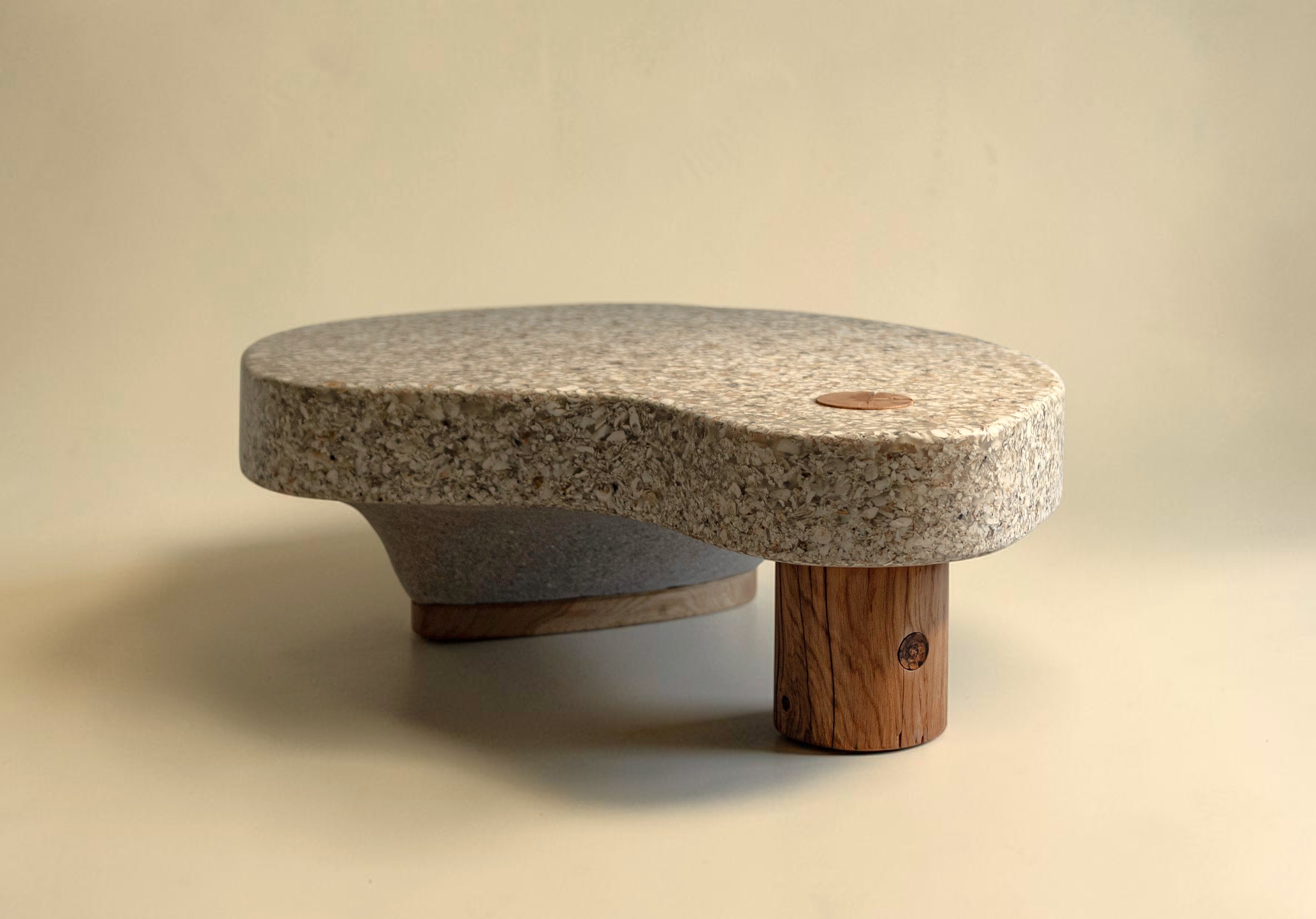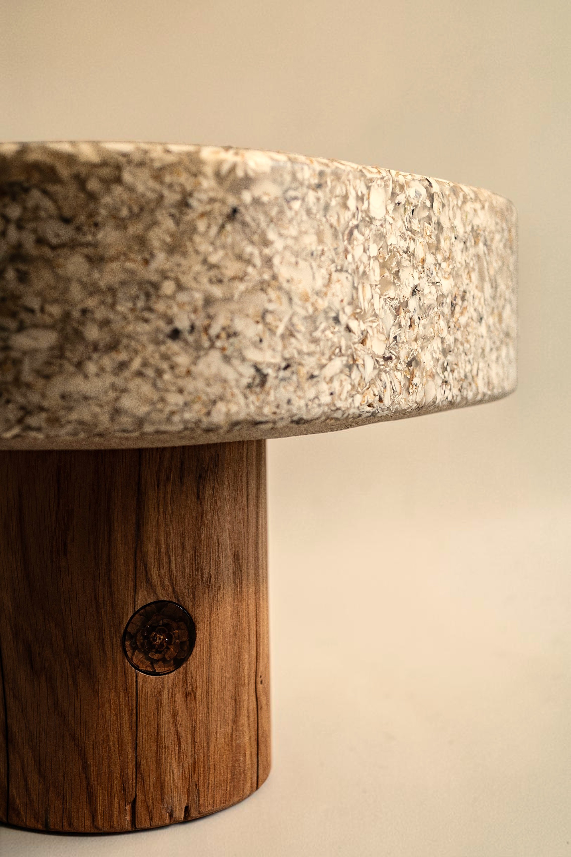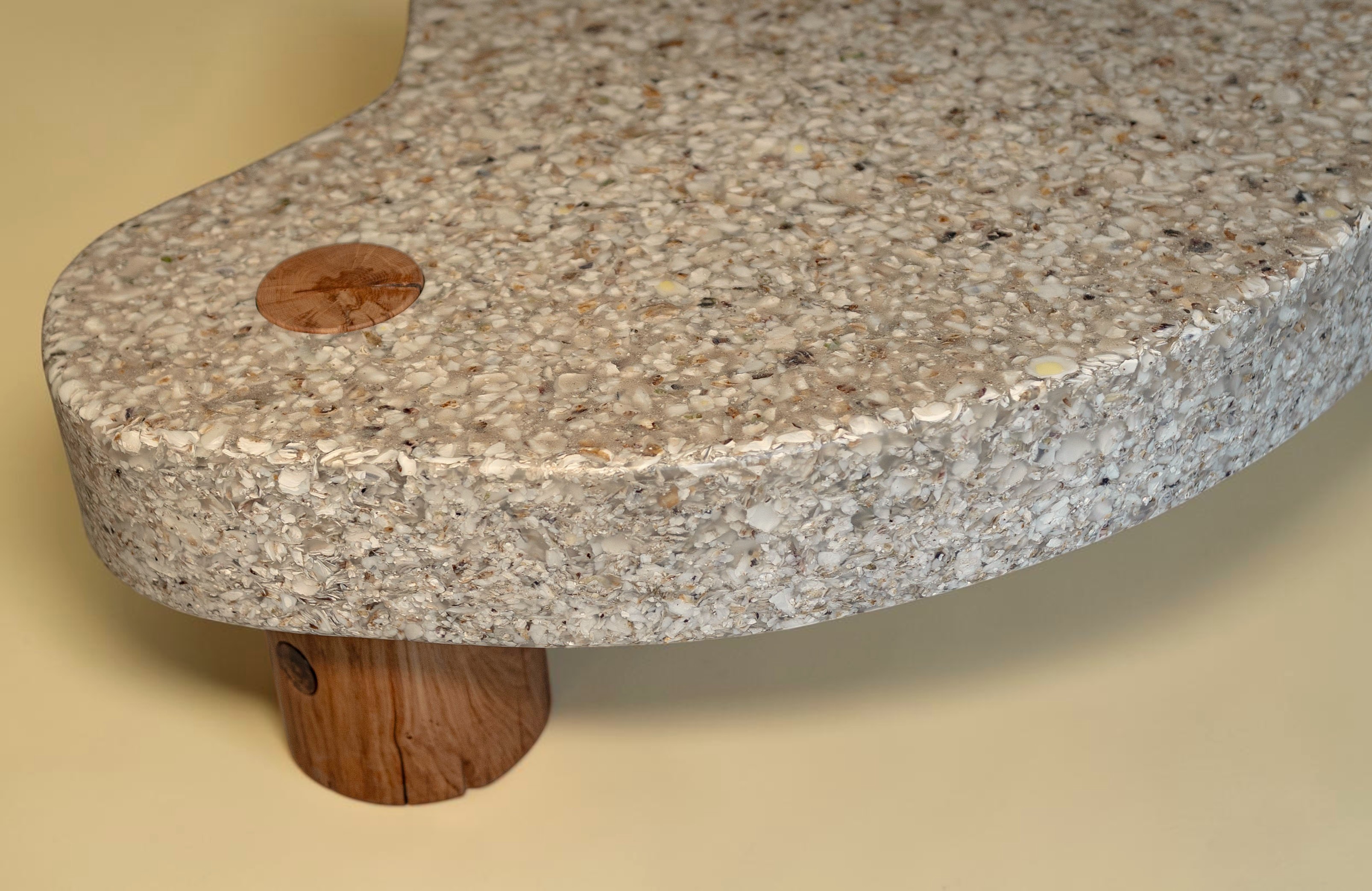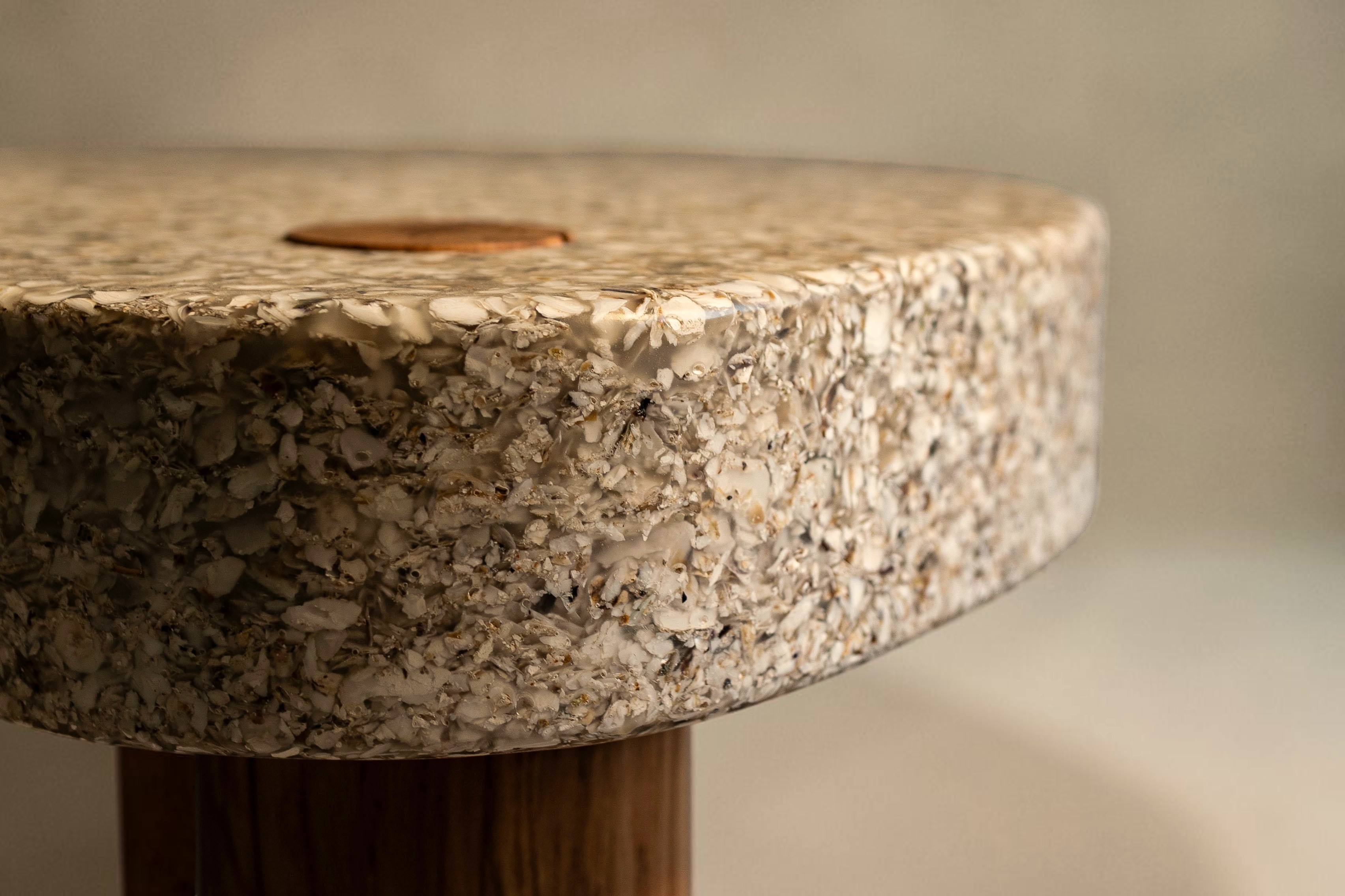 Several experimental rounds of crafting with crushed oysters later, this side table pairs a recovered old oak base with a shell surface that turns a kitchen byproduct into something permanently, quietly beautiful.