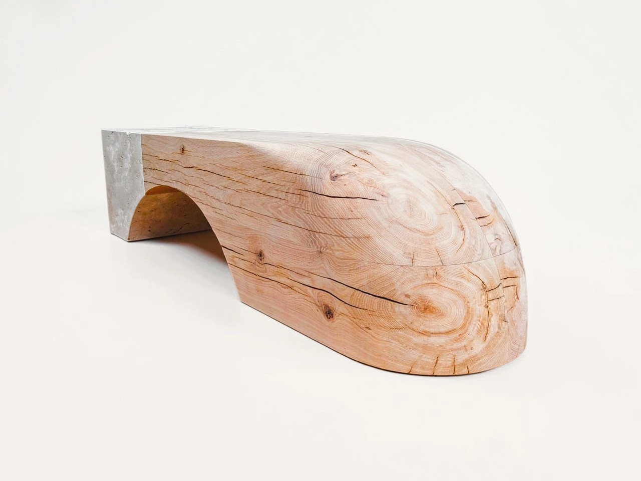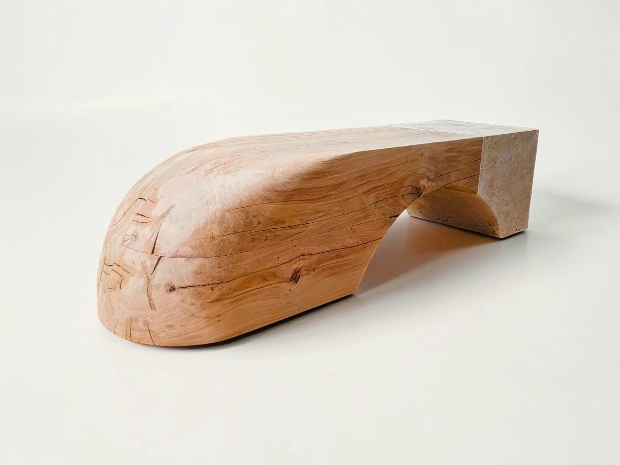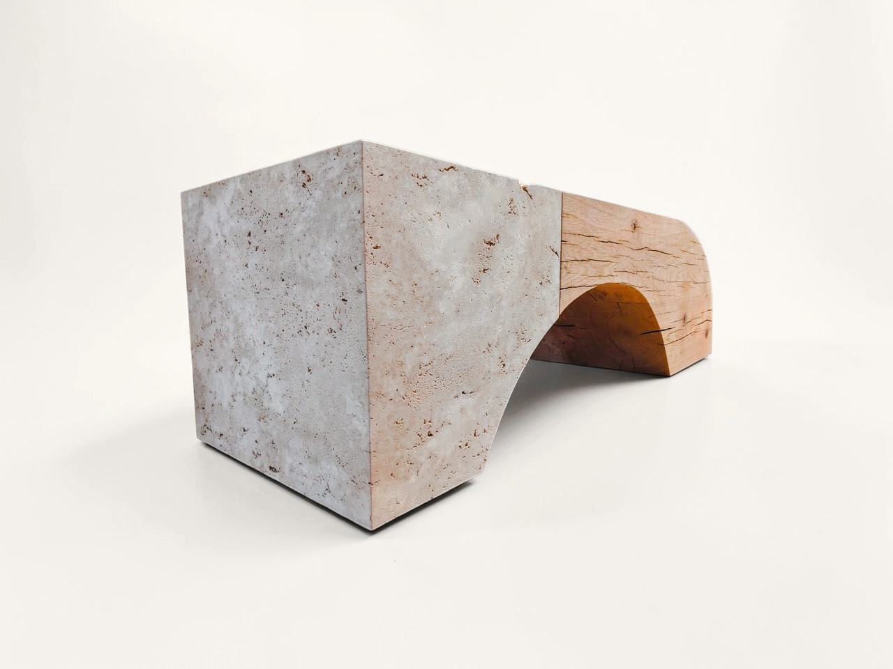 Until that point we had finished a number of pieces with conventional 20mm stone slabs. We wanted to do something different. Iñigo had an idea: instead of two materials sitting alongside each other, what if they became geometrically inseparable — not a wood piece with a stone top, but a single form where neither material could exist without the other.