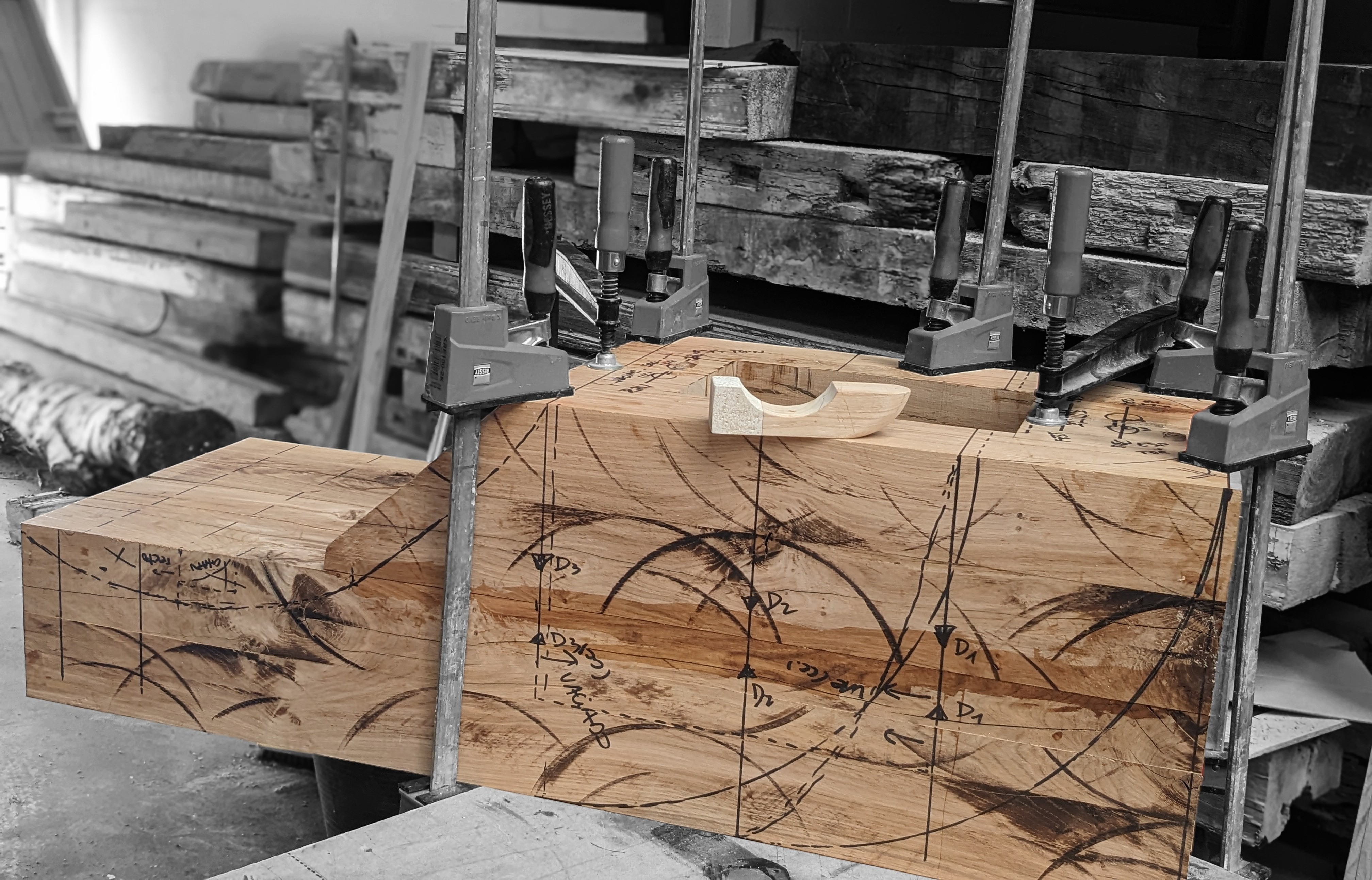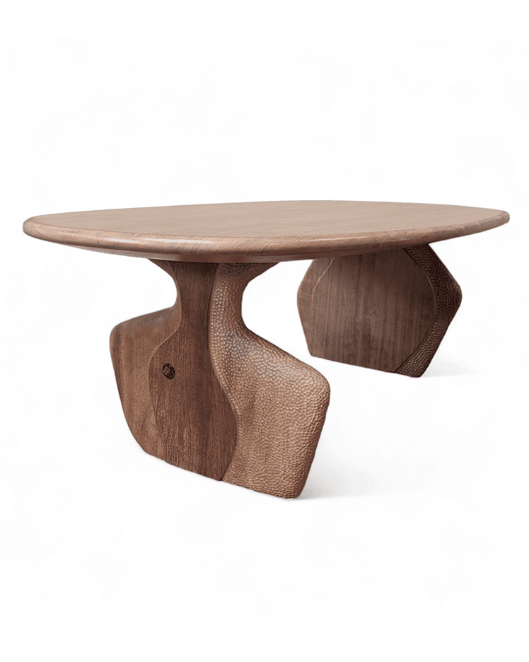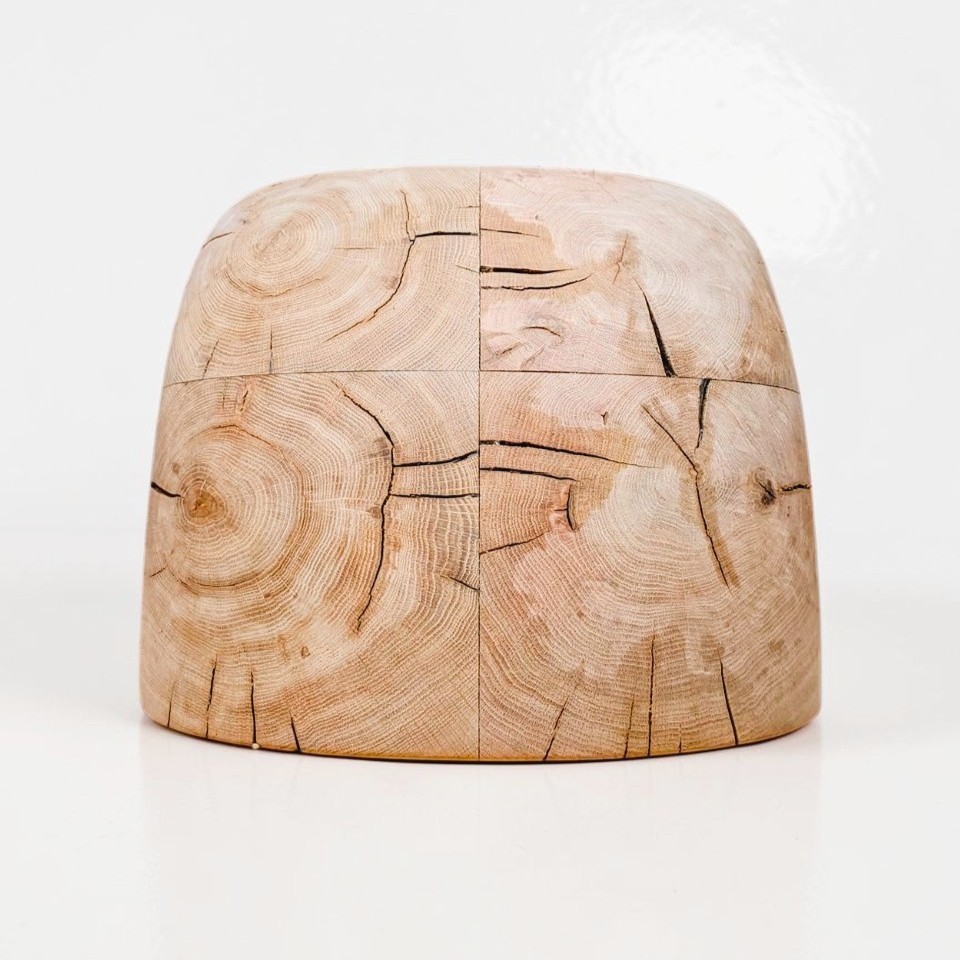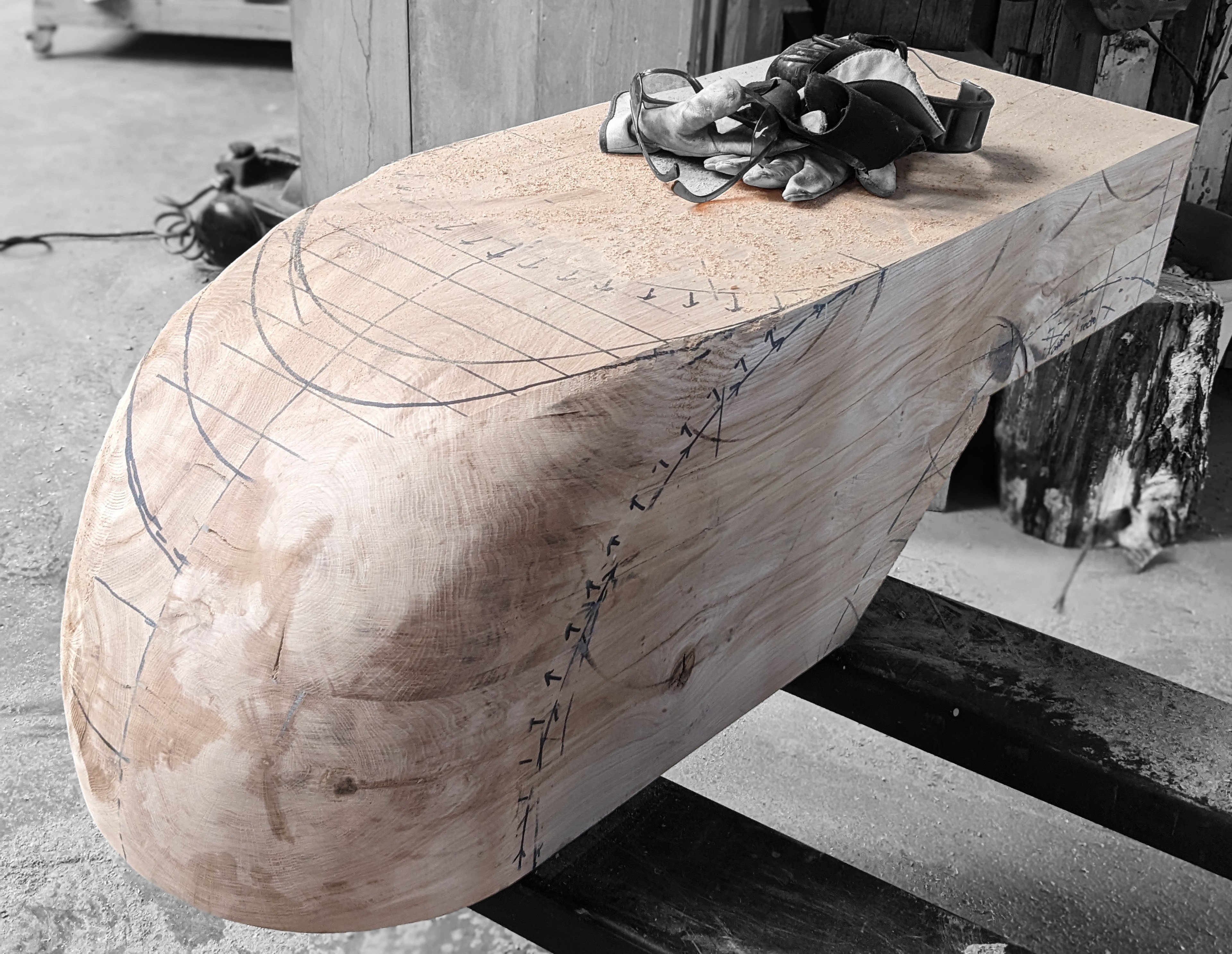 Until that point we had finished a number of pieces with conventional 20mm stone slabs. We wanted to do something different. Iñigo had an idea: instead of two materials sitting alongside each other, what if they became geometrically inseparable — not a wood piece with a stone top, but a single form where neither material could exist without the other.
