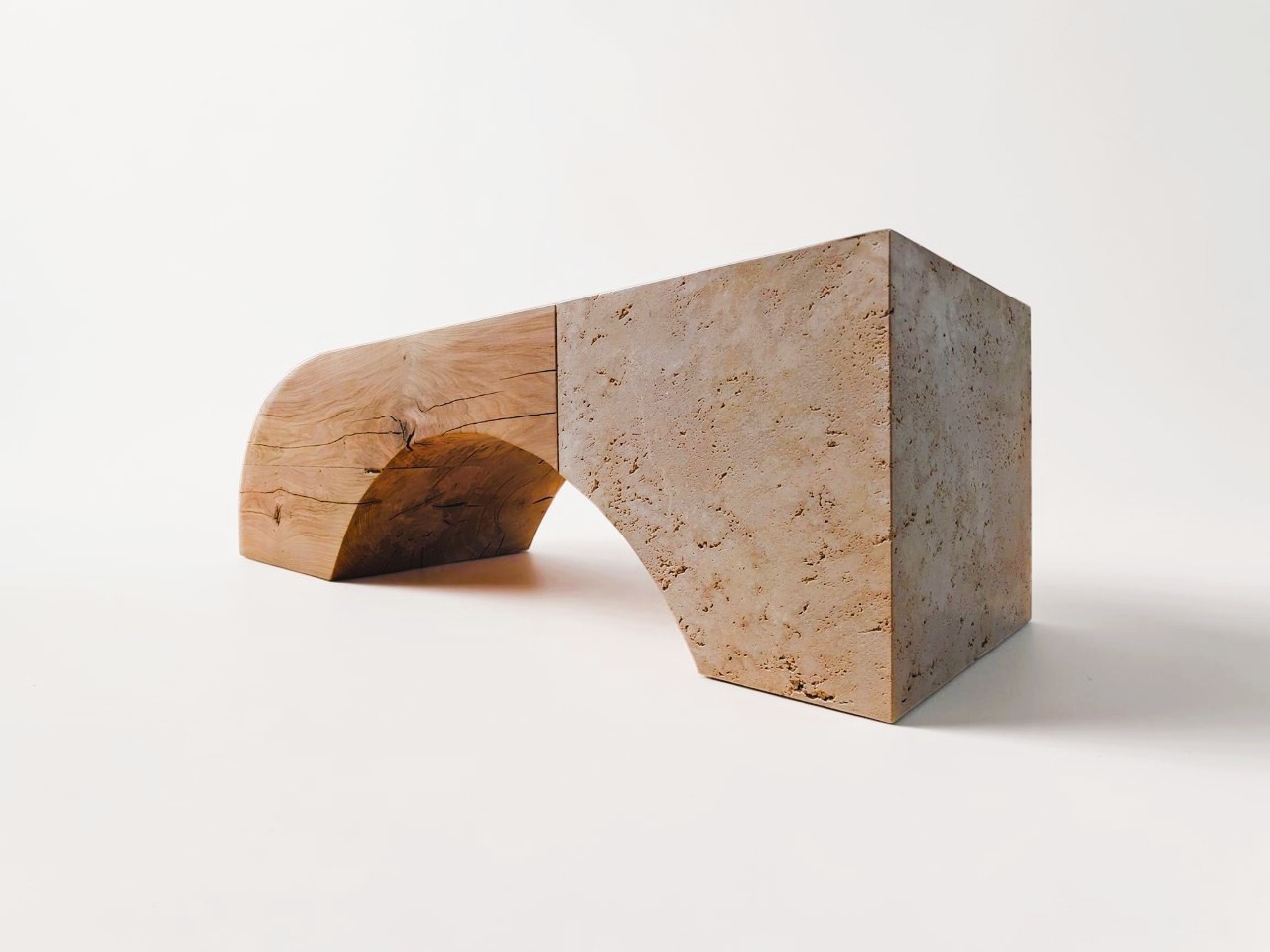 From above, UC57 reads as a rectangular block in two colours: white travertine followed by the warm blonde of oak. From the front, a perfect square. But viewed from the side, something unexpected happens — on the interior face of the joint between the two materials, a wide frame is drawn, and somewhere within that frame the transition between stone and wood takes place. Wood we accept as shapeable. Stone, less so. Both together, shaped into a continuous geometric form — that is something else entirely.