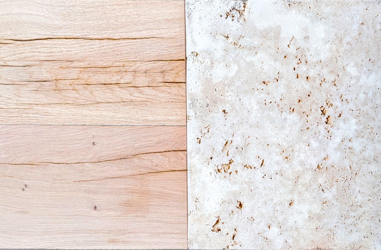 The travertine was machined on an industrial five-axis CNC belonging to our workshop neighbours — an expensive process, but the only way to achieve that precision in stone. The oak we sculpted by hand. When you see the finished piece, what is remarkable is how two materials made by such opposing processes manage to disguise each other so completely.