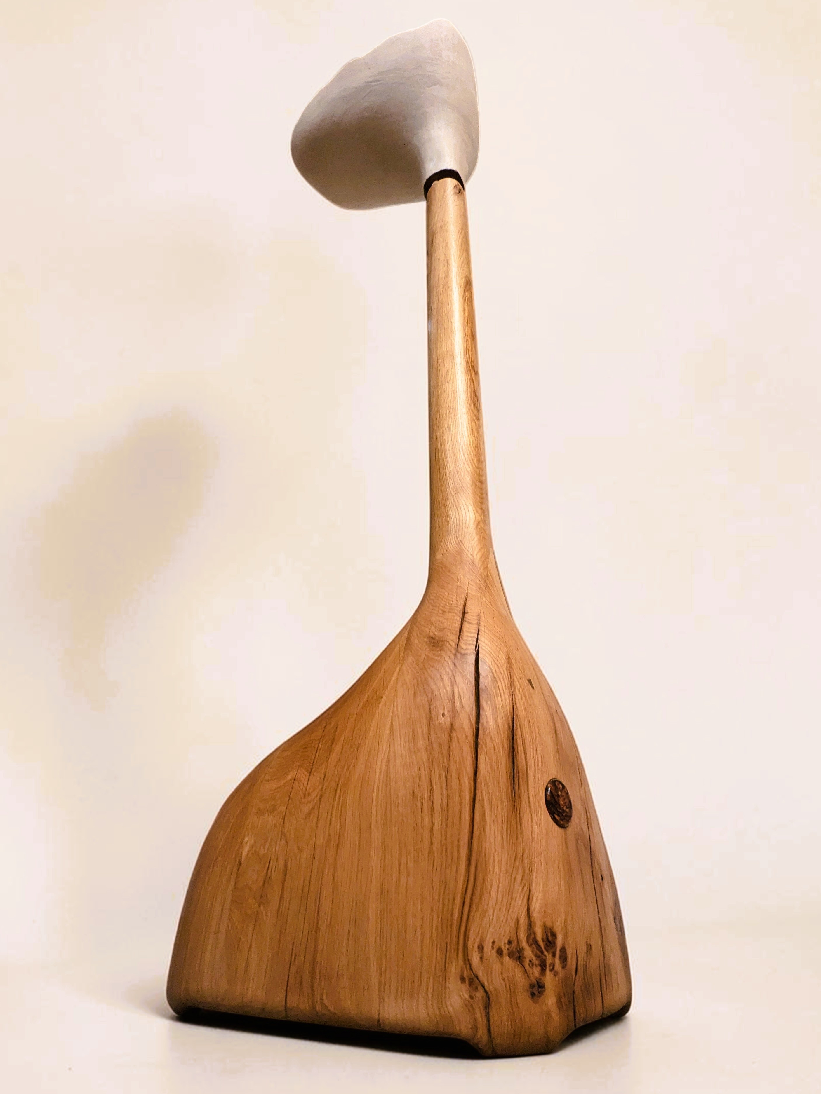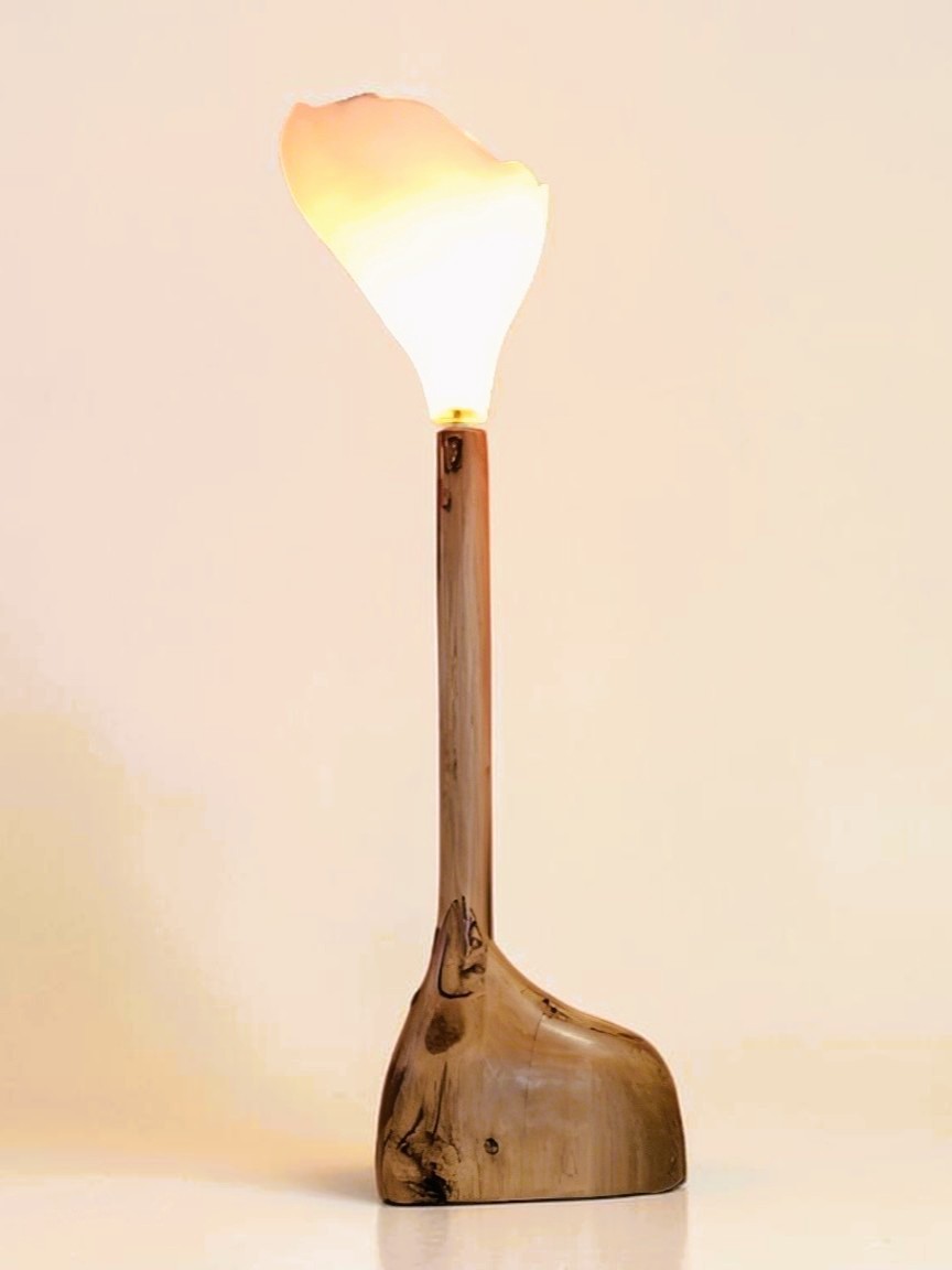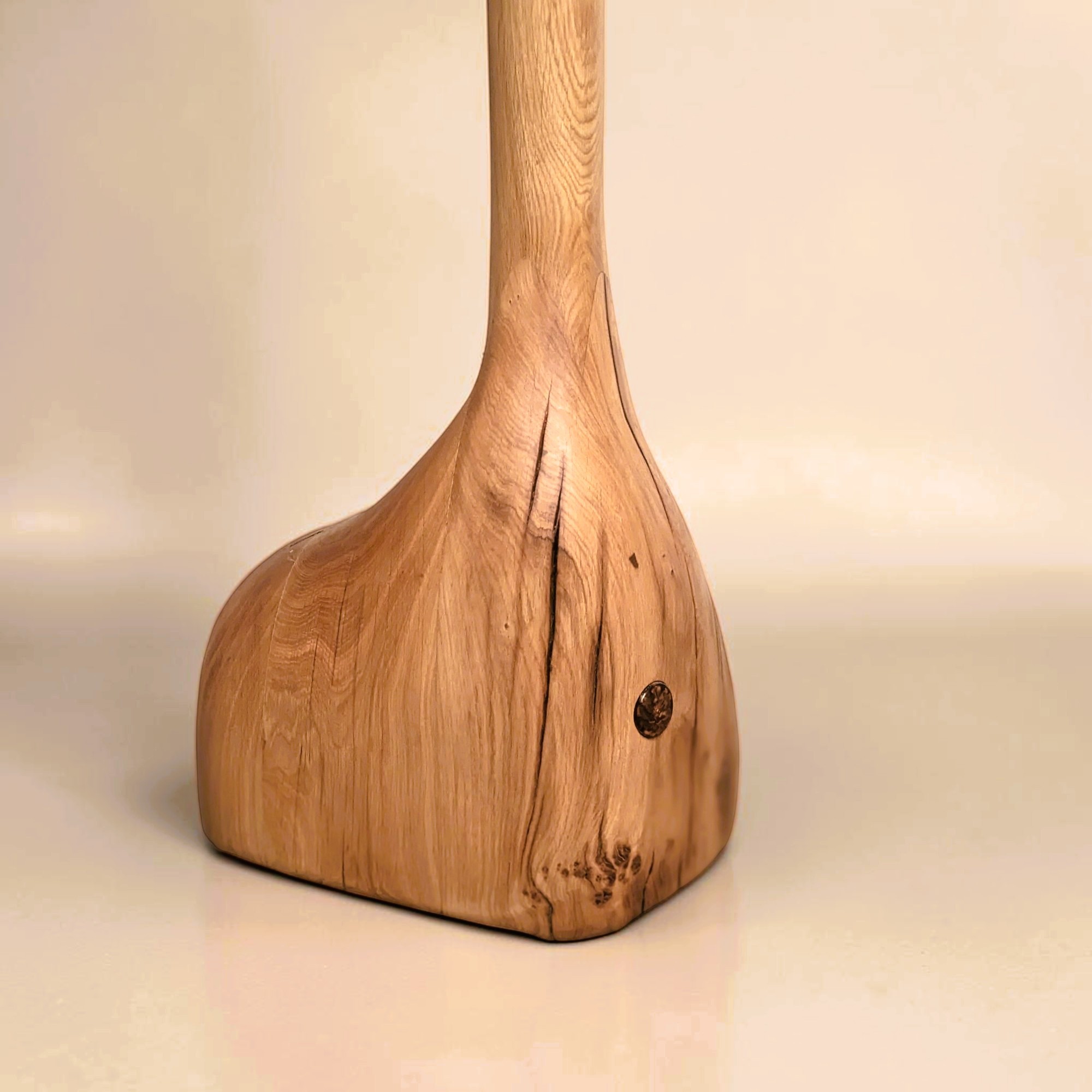 A solid floor lamp with a strong, sculptural AMBER base in recovered French oak — a long neck rising toward the top. A base that sculptural was never going to accept a conventional shade. But at the time we had no way of making anything translucent.