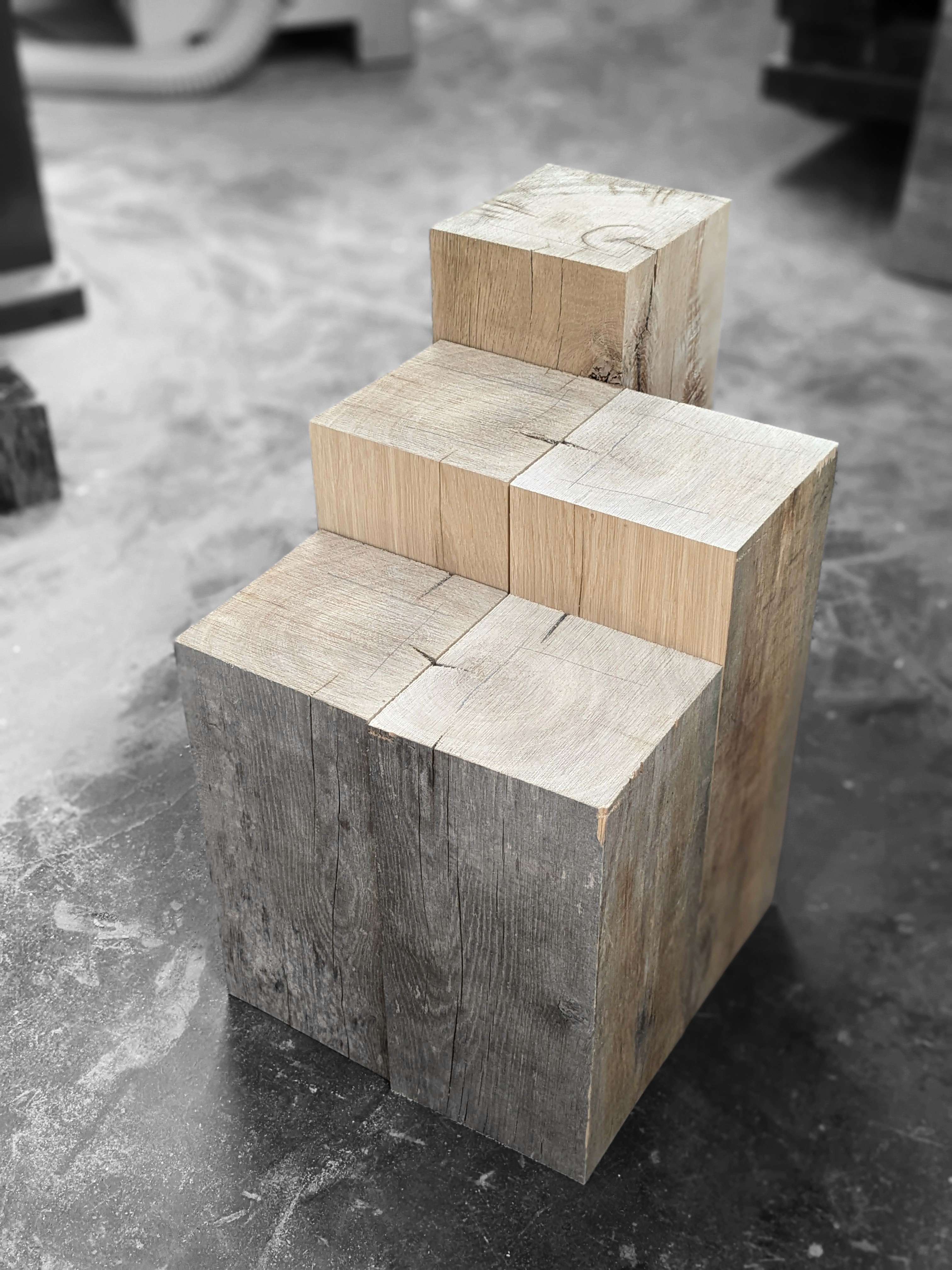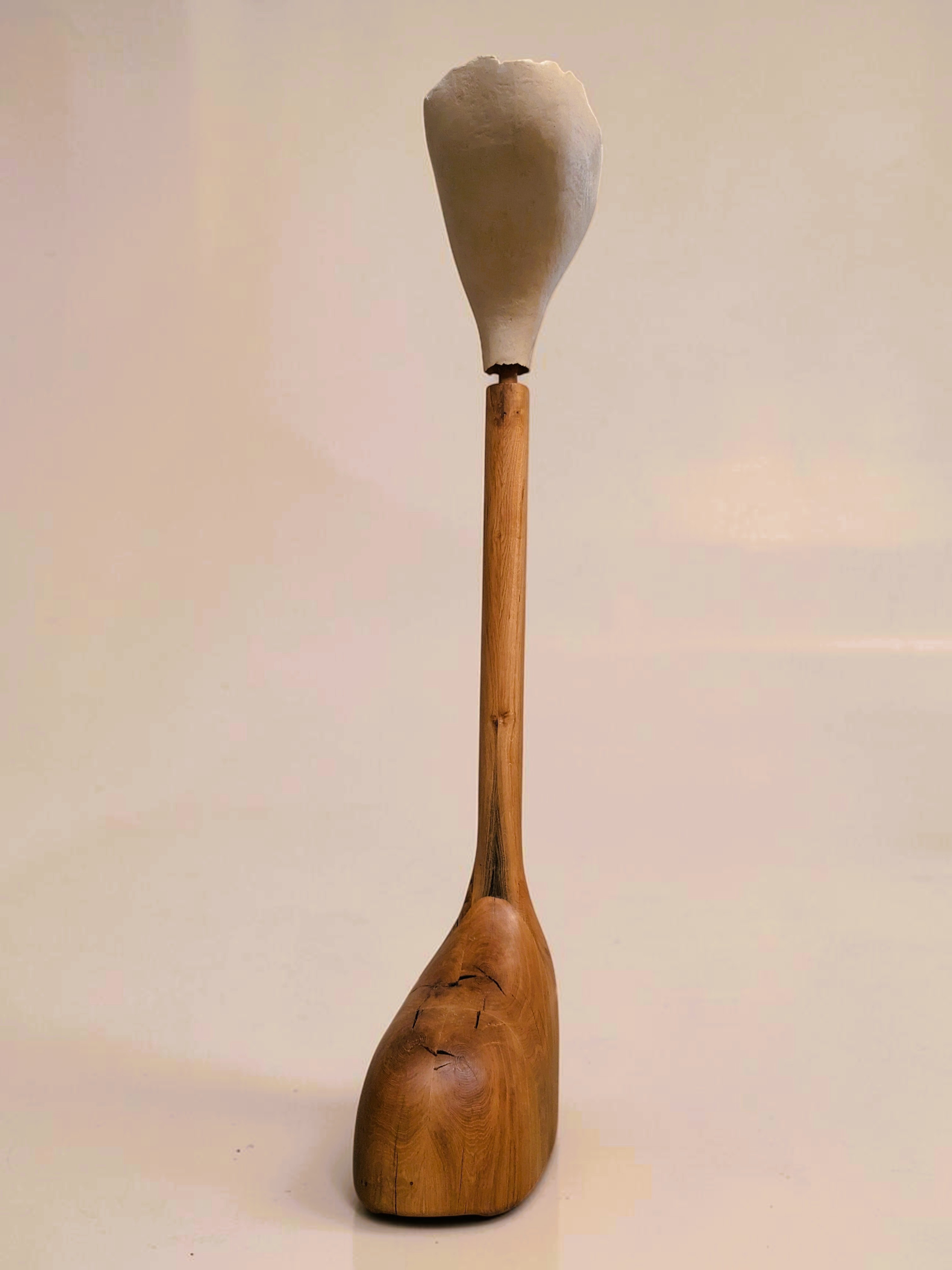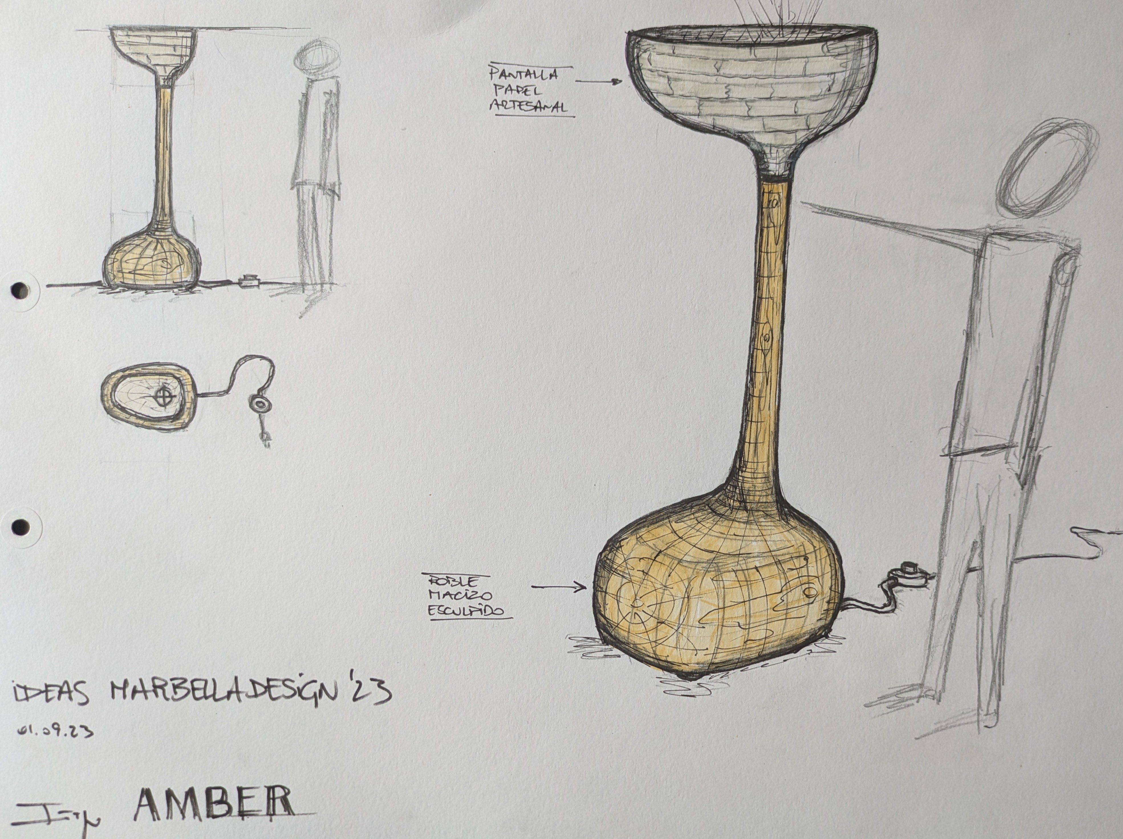 A solid floor lamp with a strong, sculptural AMBER base in recovered French oak — a long neck rising toward the top. A base that sculptural was never going to accept a conventional shade. But at the time we had no way of making anything translucent.