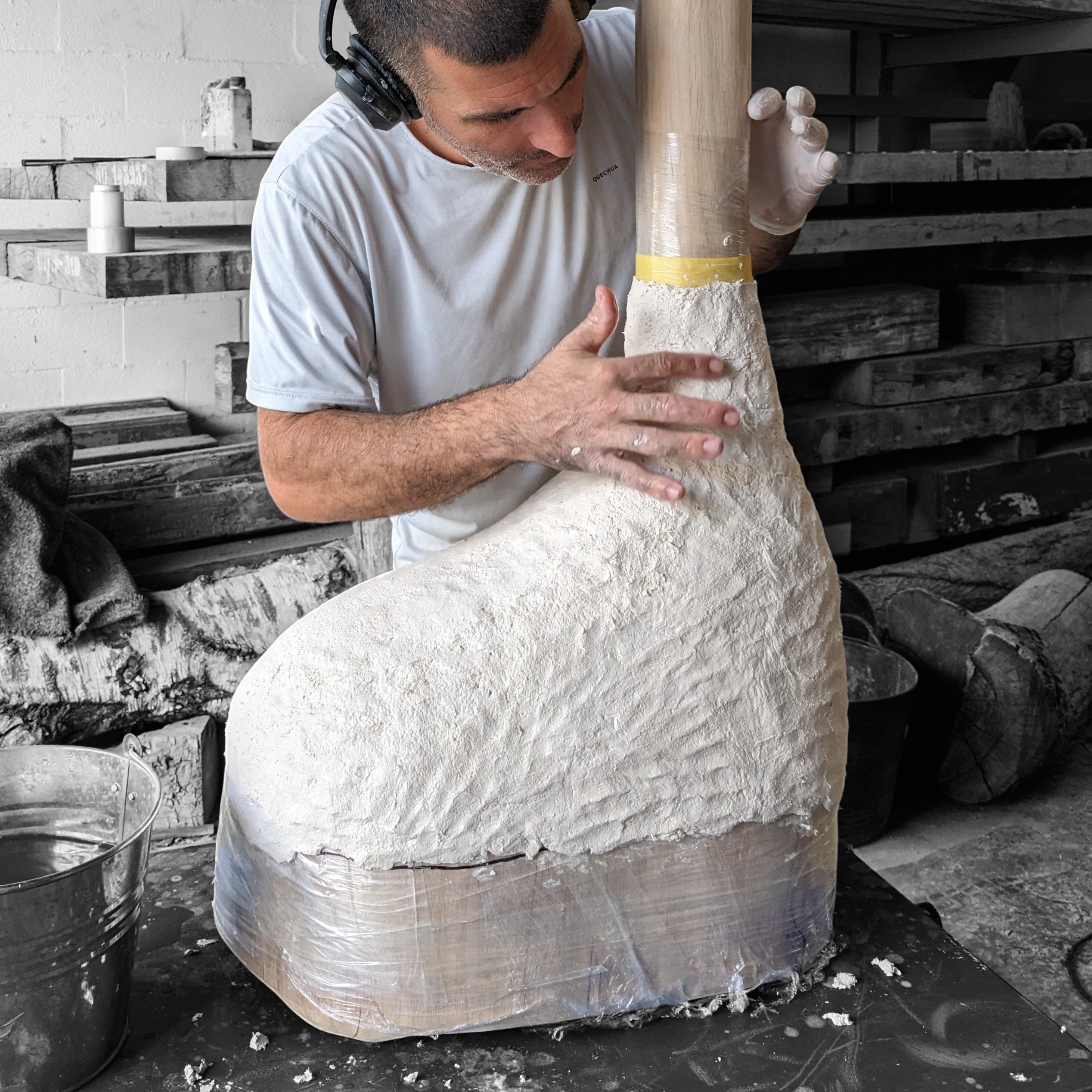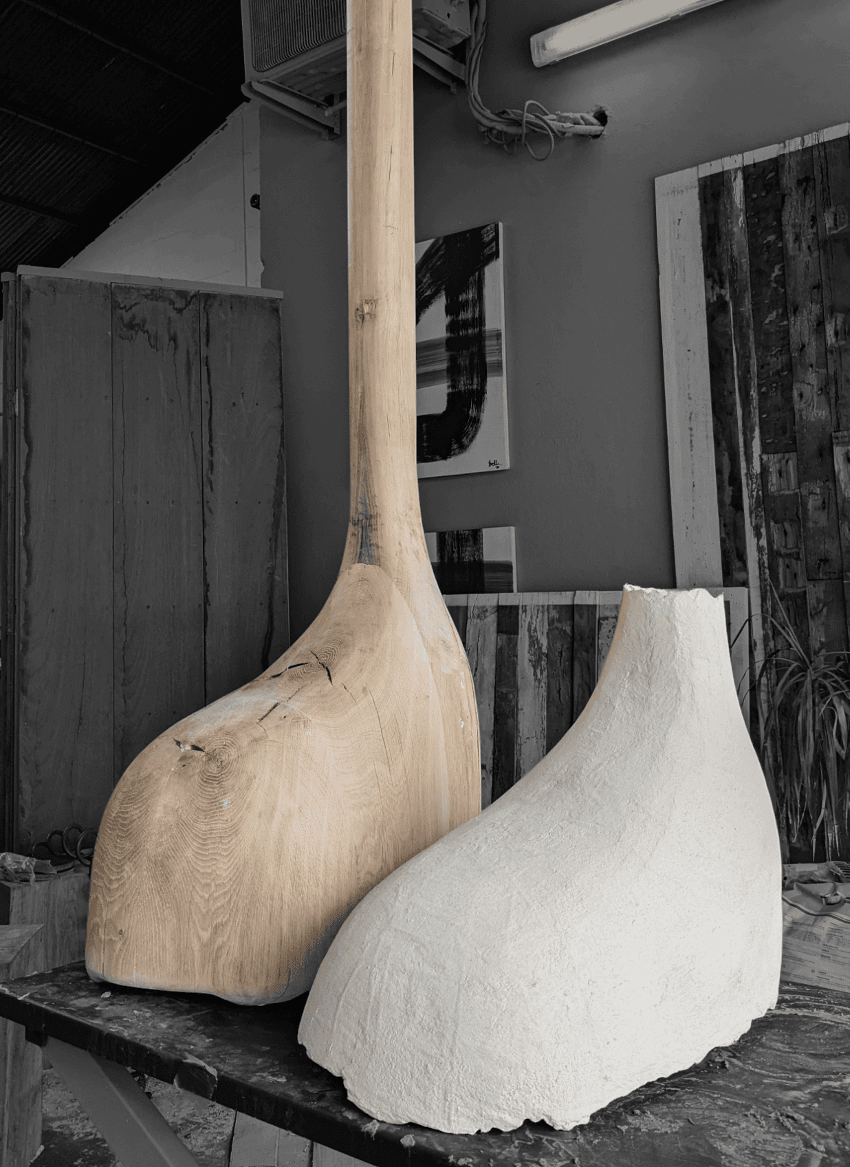 The solution came from the base itself. We used it as a positive mould and built up the lampshade through layers of laminated paper — a material that holds its form while letting light through.