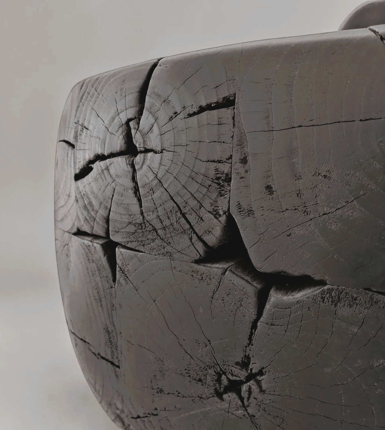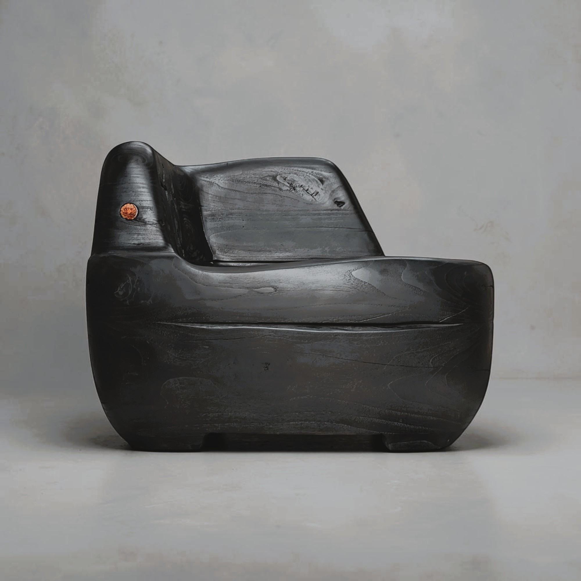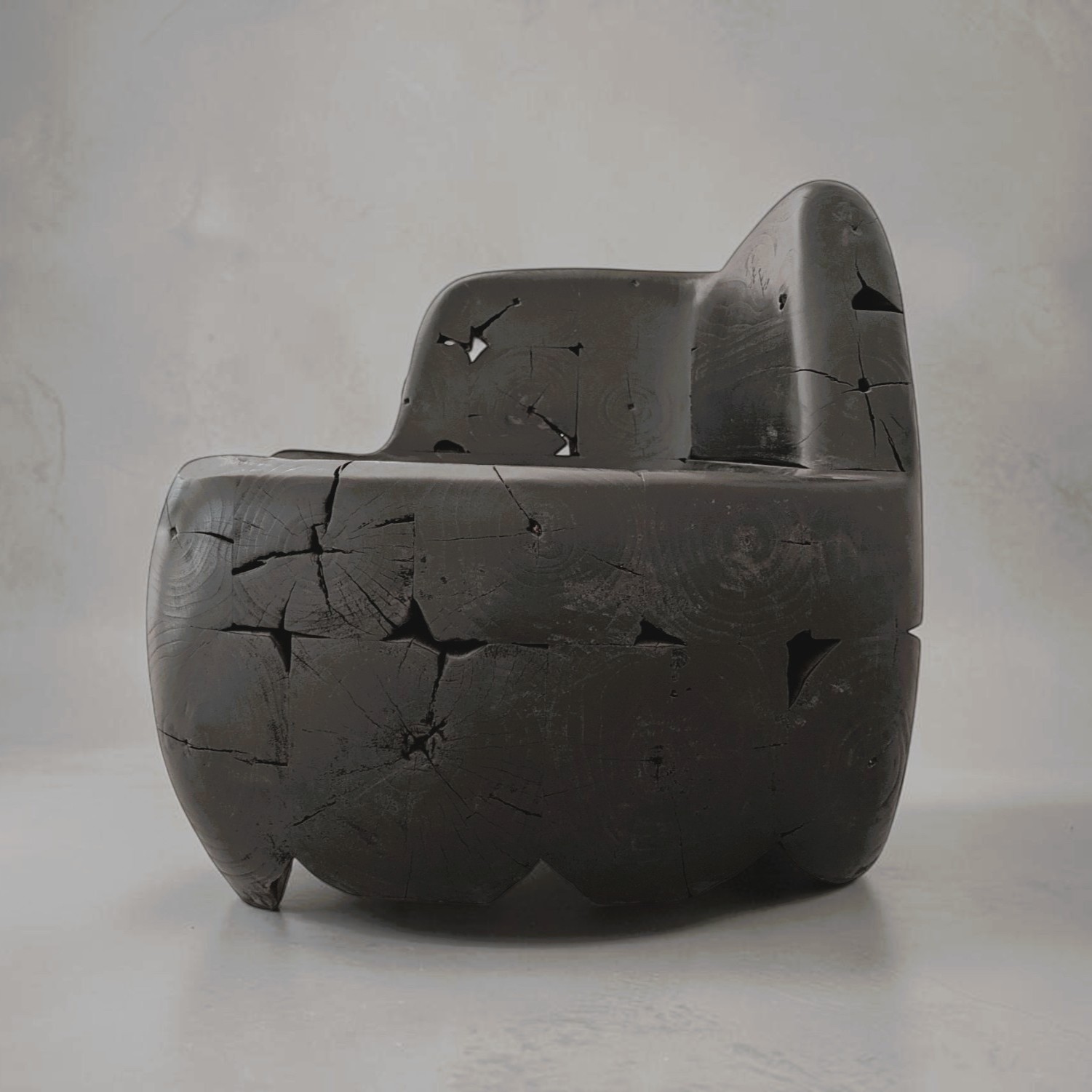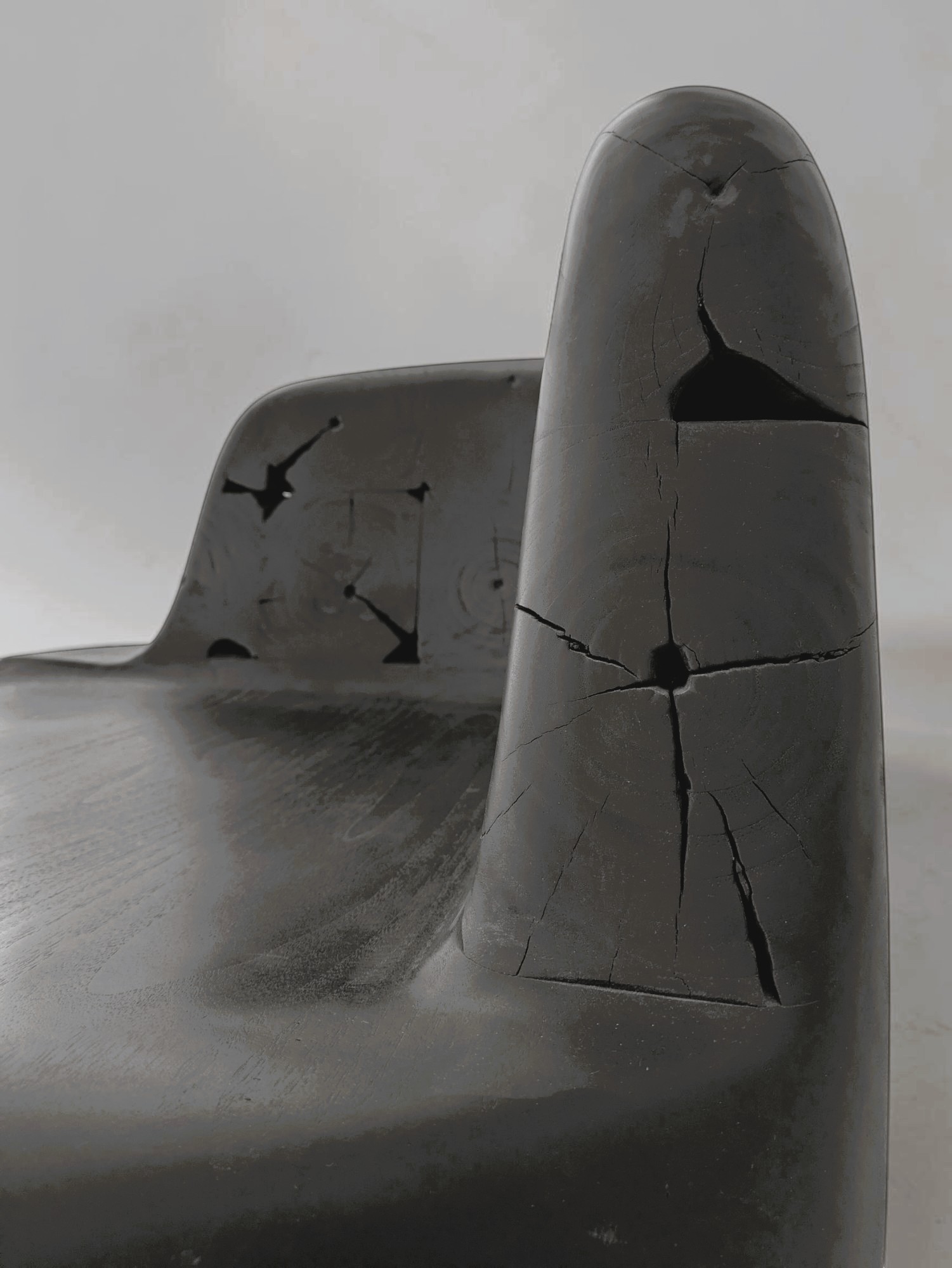 The structural challenge was real. Filling the geometries of a piece with that much mass moving in so many directions — using irregular teak trunks — without building something unmanageable. The solution was a kind of Jenga construction: blocks assembled with structural confidence but deliberately not squared off at every joint, so that small gaps open up where the trunks meet. Viewed from the side, those gaps are one of the most distinctive features of the piece — an honest record of how it was built.