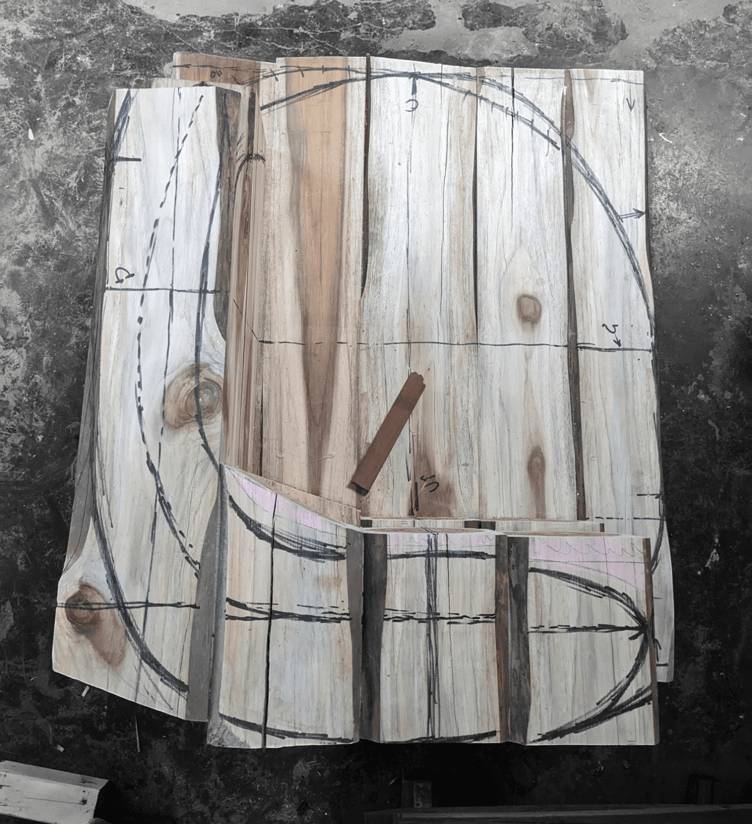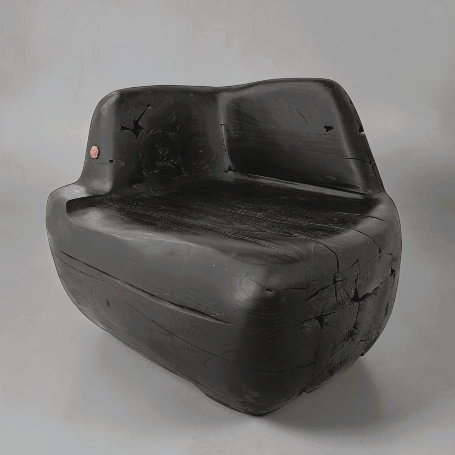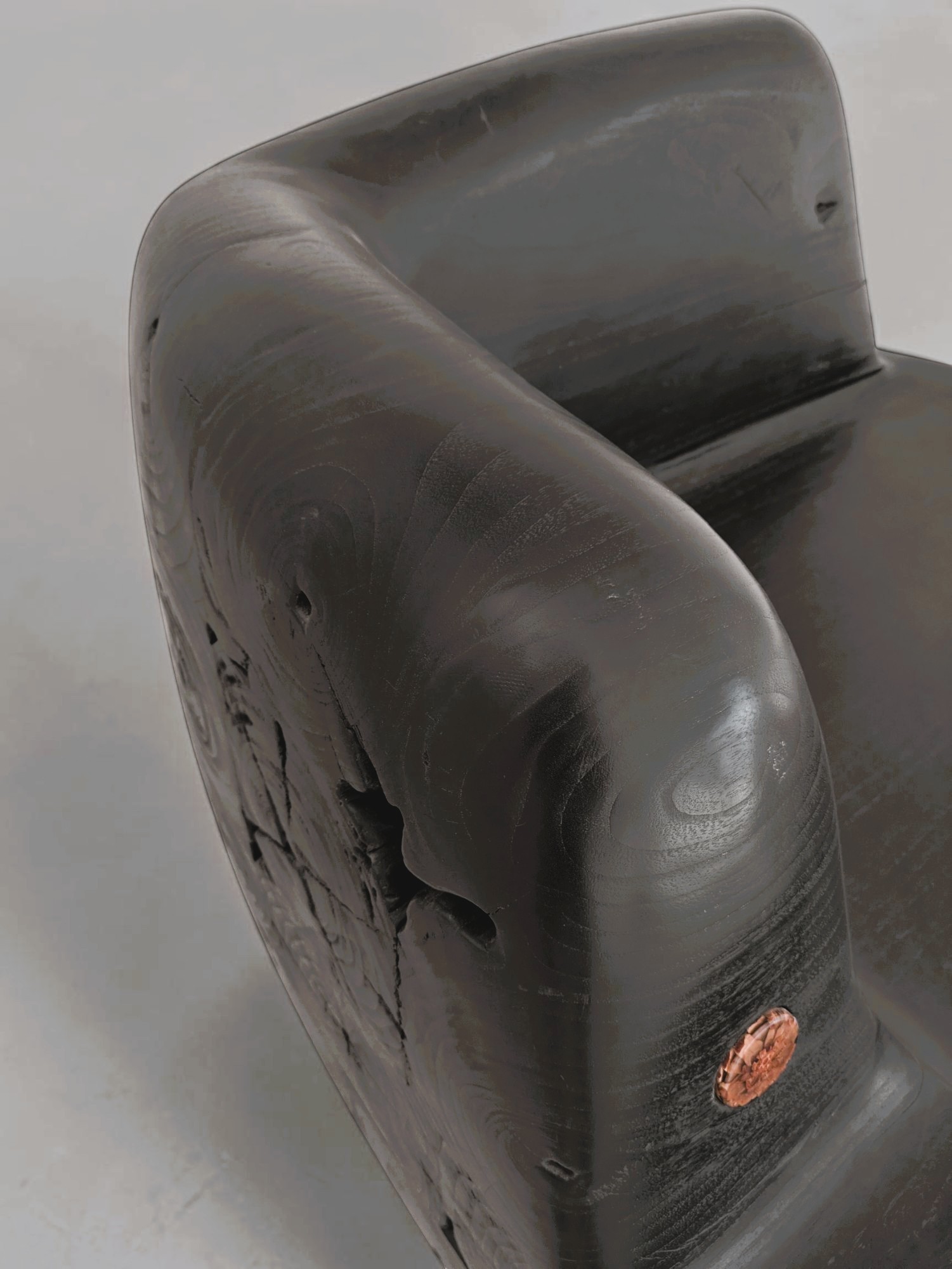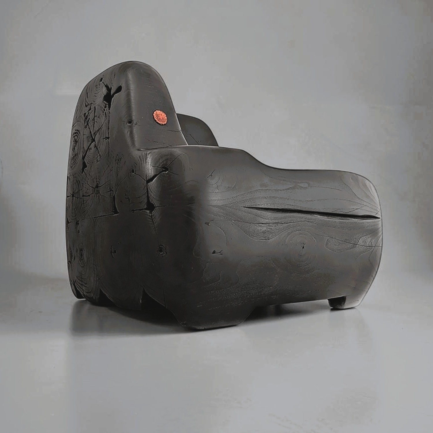 The structural challenge was real. Filling the geometries of a piece with that much mass moving in so many directions — using irregular teak trunks — without building something unmanageable. The solution was a kind of Jenga construction: blocks assembled with structural confidence but deliberately not squared off at every joint, so that small gaps open up where the trunks meet. Viewed from the side, those gaps are one of the most distinctive features of the piece — an honest record of how it was built.