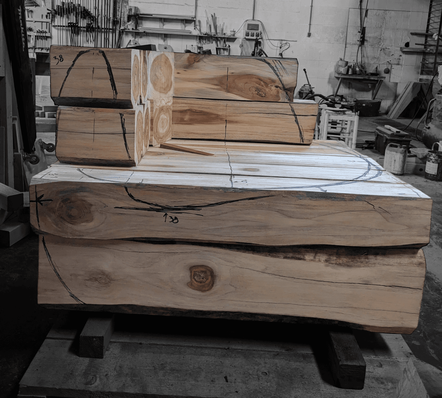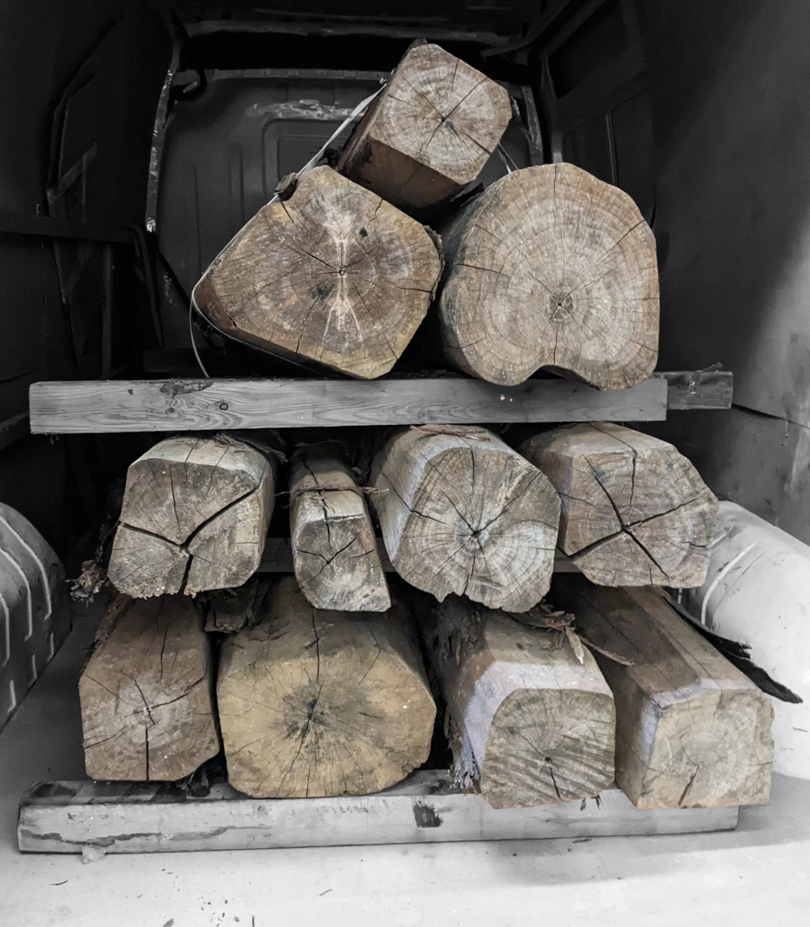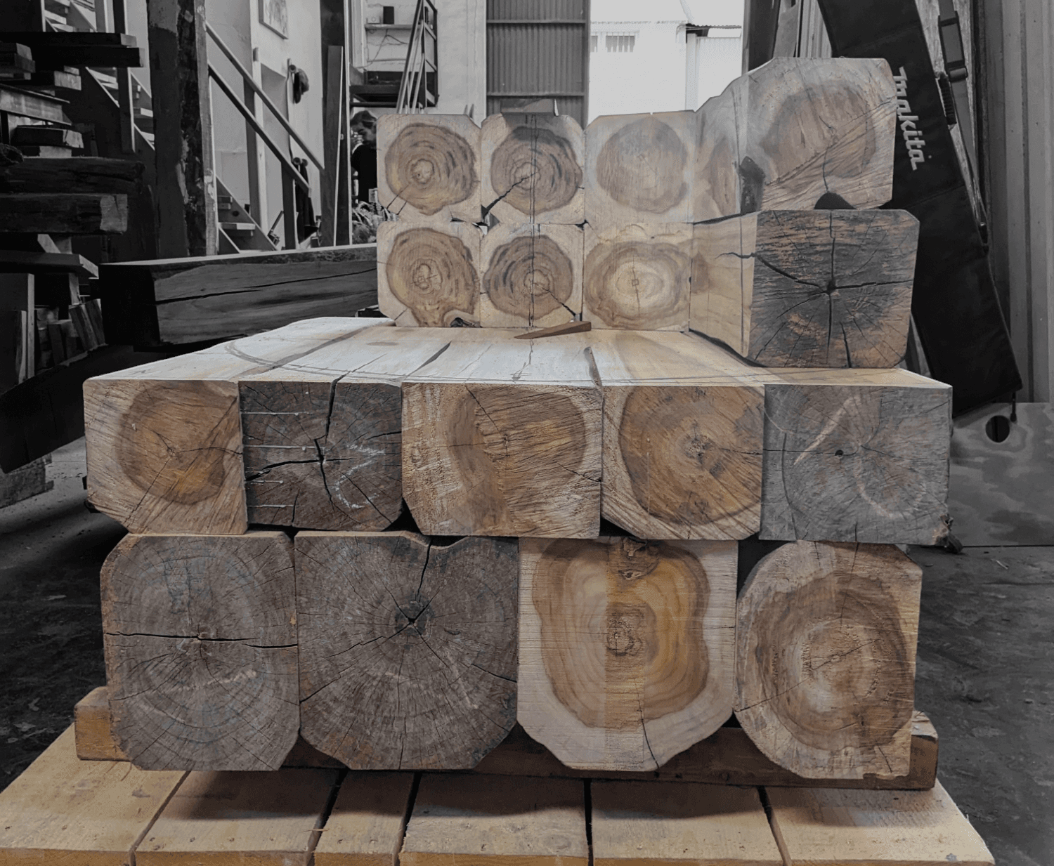 For most workshops, raw logs are an inconvenience — not a standard working format, not directly usable in conventional carpentry. For AMBER, a batch of dry, massive teak trunks is a luxury. The wood itself is extraordinary: expensive, dense, with beautiful grain, and almost never worked in raw form in Spain — it arrives here as finished furniture, not as material.