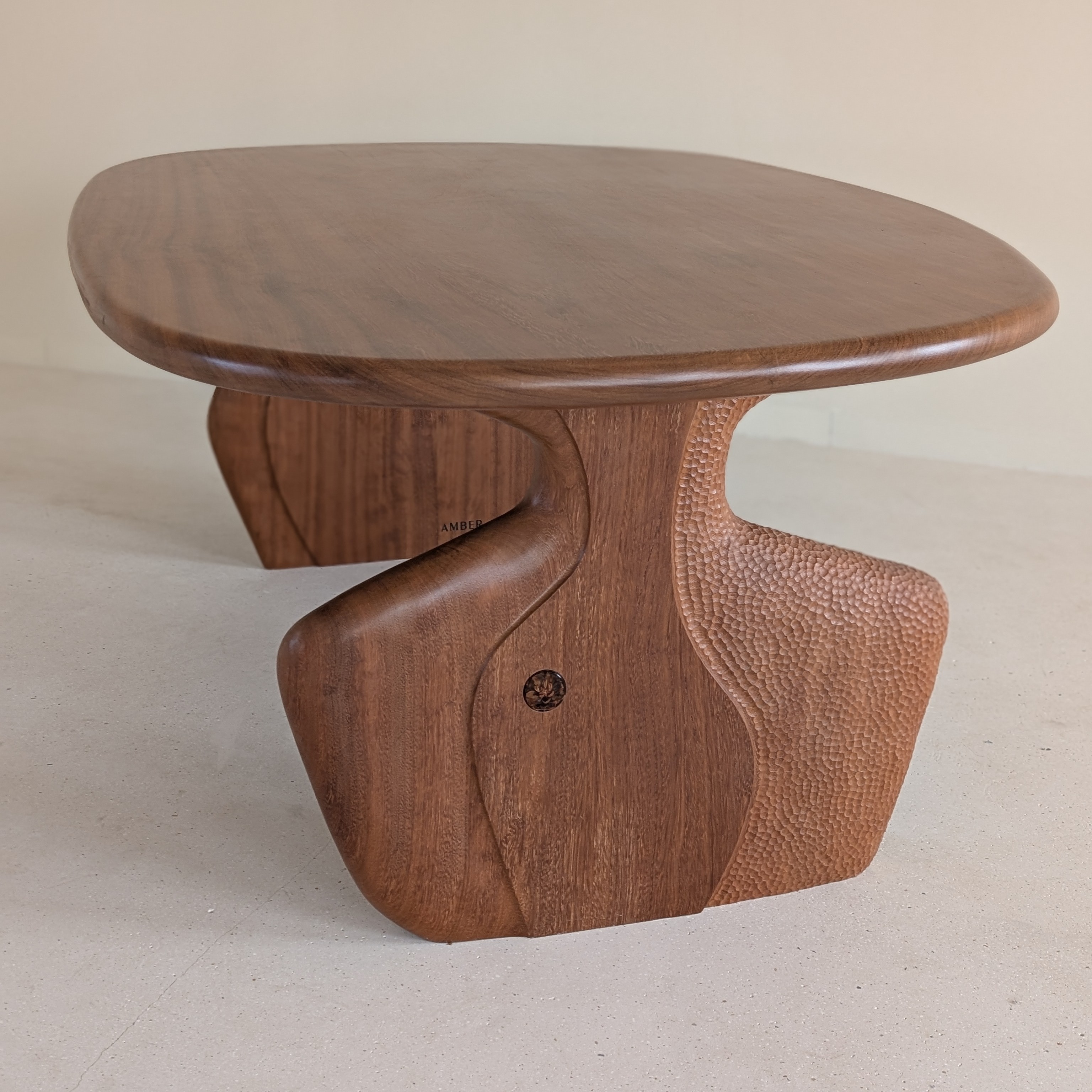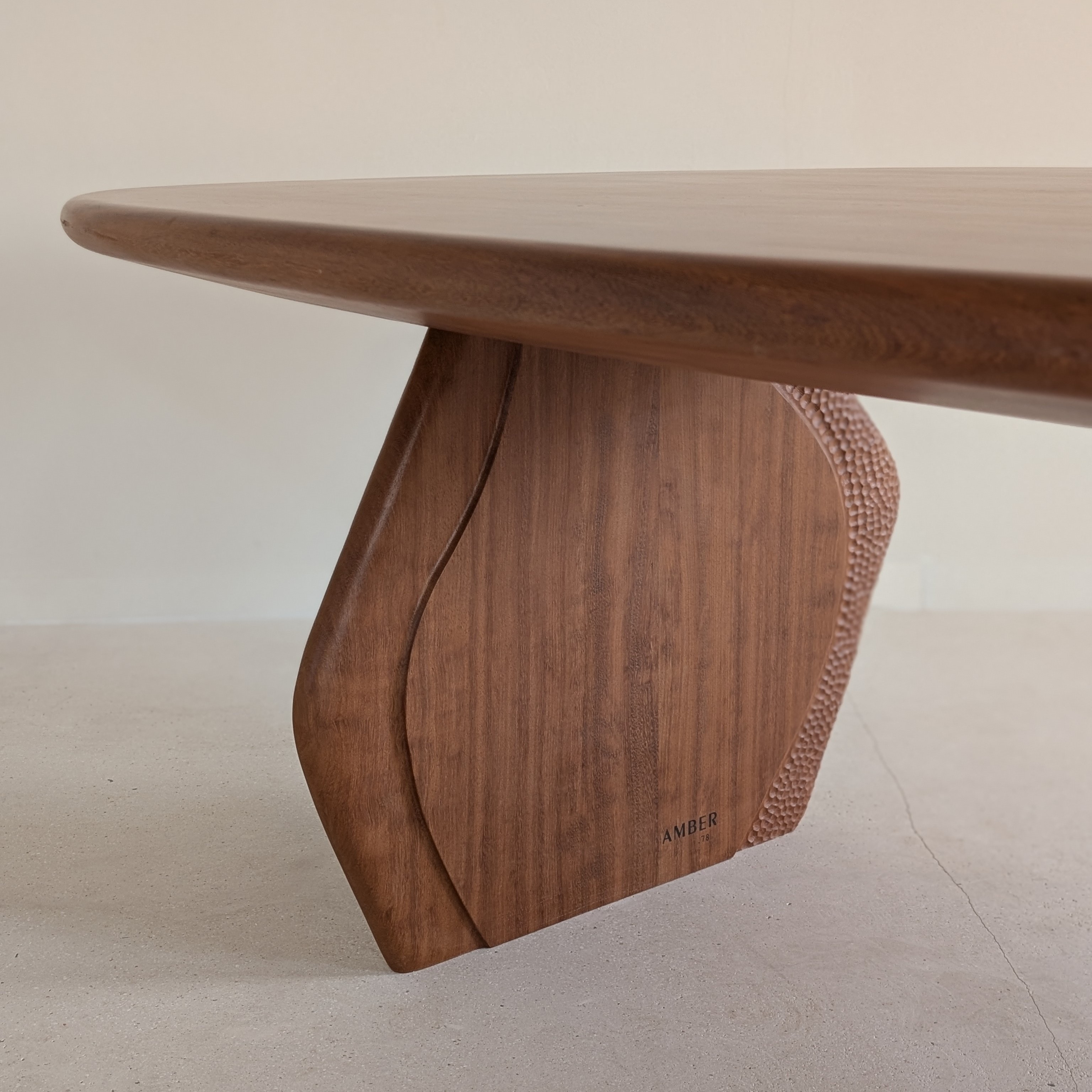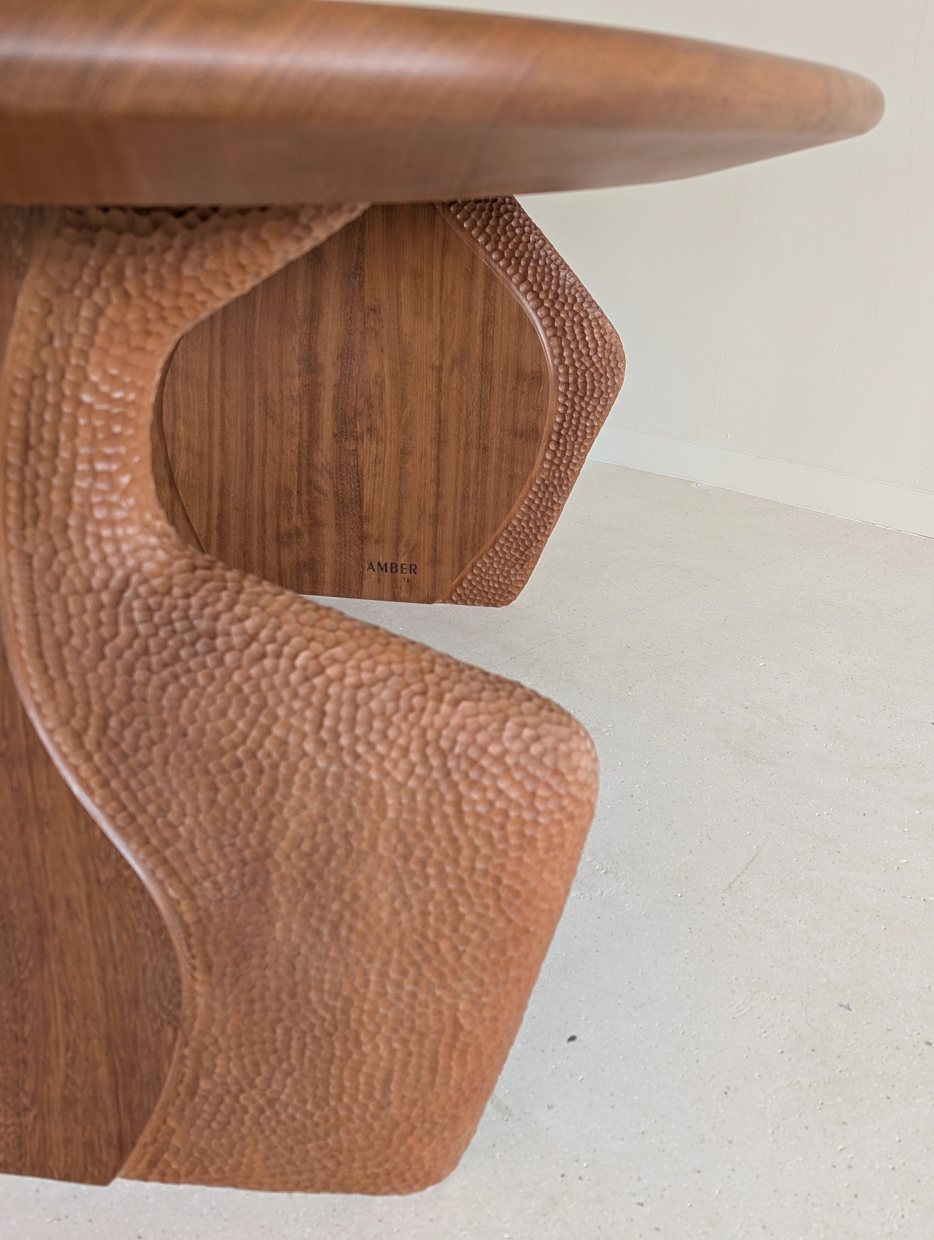 The original designs were low-poly in spirit — straight sections, sharp edges, planes meeting at hard angles in different directions. When the piece was finished it didn't fully convince us. Without losing the connection to those stone forms, we softened it: smoother transitions, more approachable surfaces, and bas-relief details carved into the wood — rounded, exuberant forms that are unmistakably AMBER against the austerity of the overall structure.