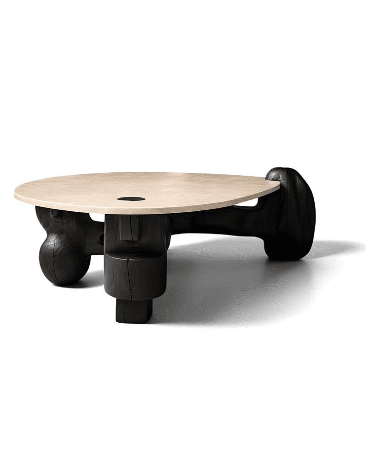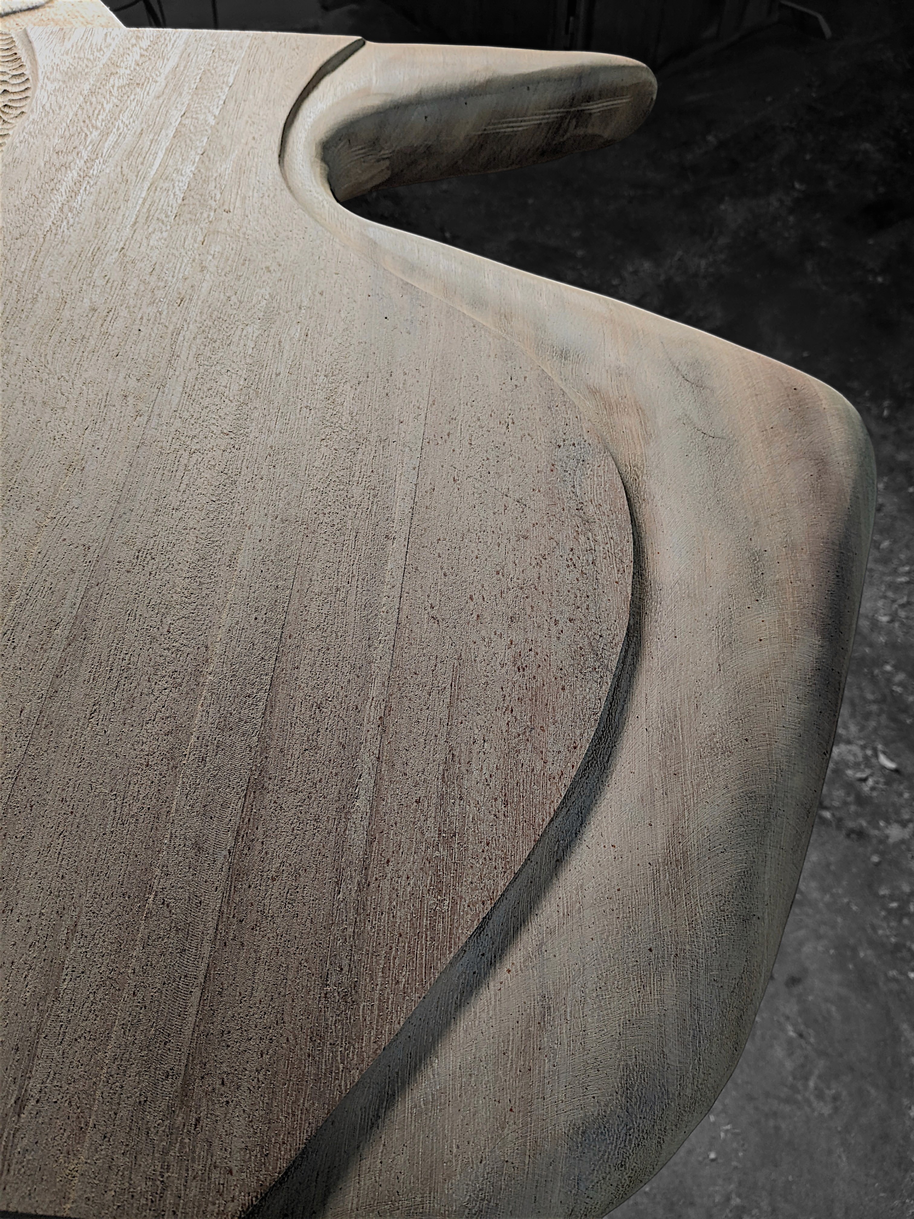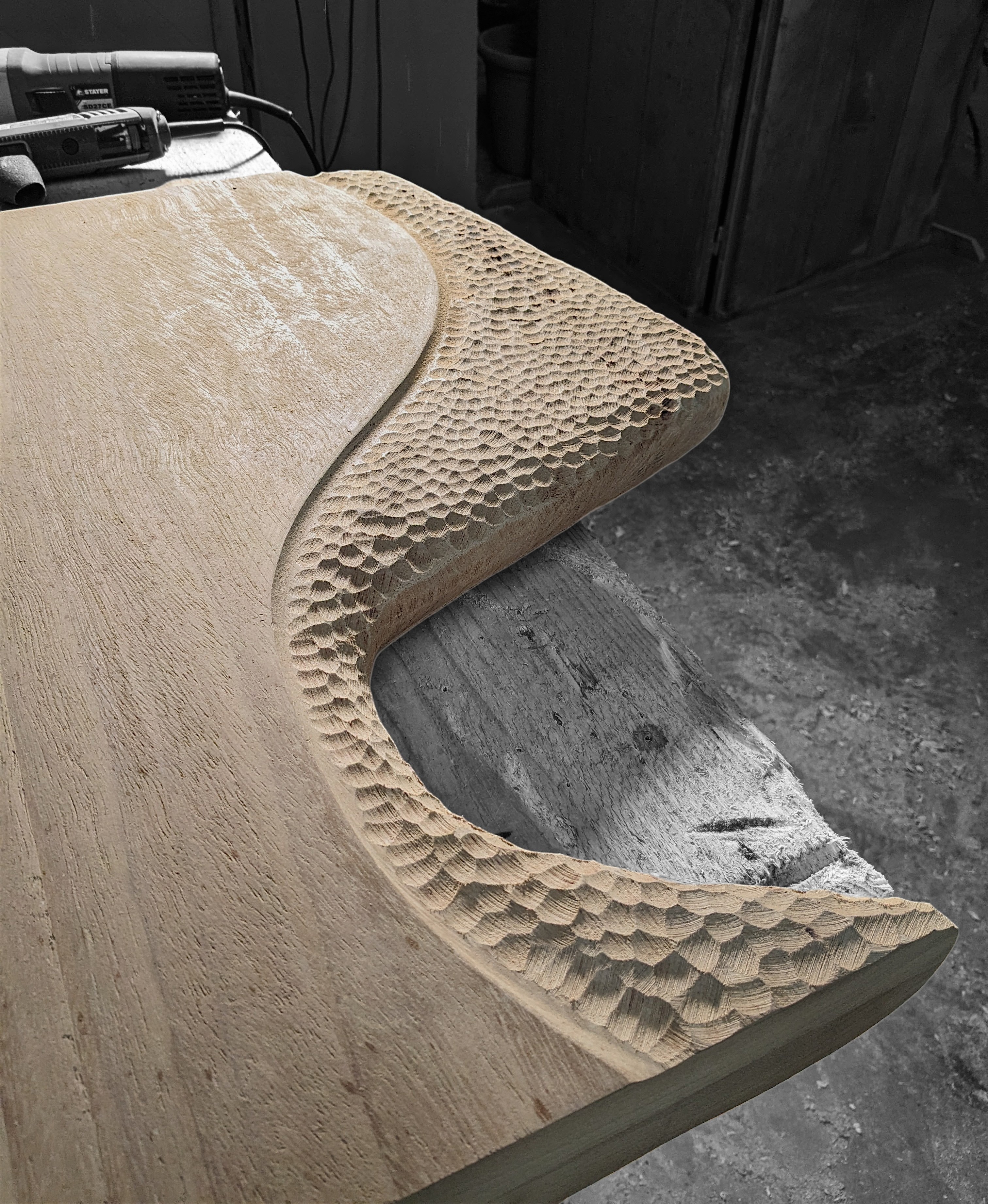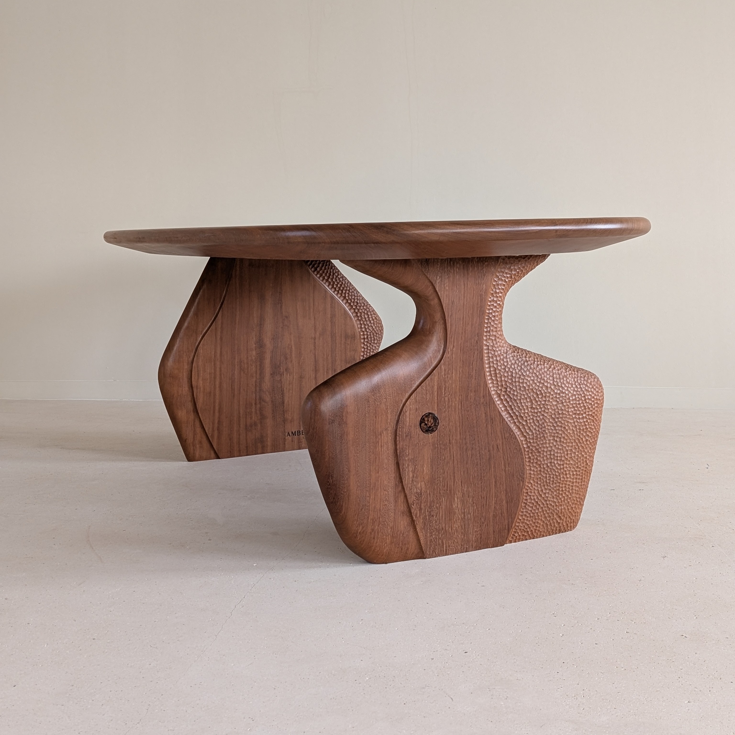 The original designs were low-poly in spirit — straight sections, sharp edges, planes meeting at hard angles in different directions. When the piece was finished it didn't fully convince us. Without losing the connection to those stone forms, we softened it: smoother transitions, more approachable surfaces, and bas-relief details carved into the wood — rounded, exuberant forms that are unmistakably AMBER against the austerity of the overall structure.
