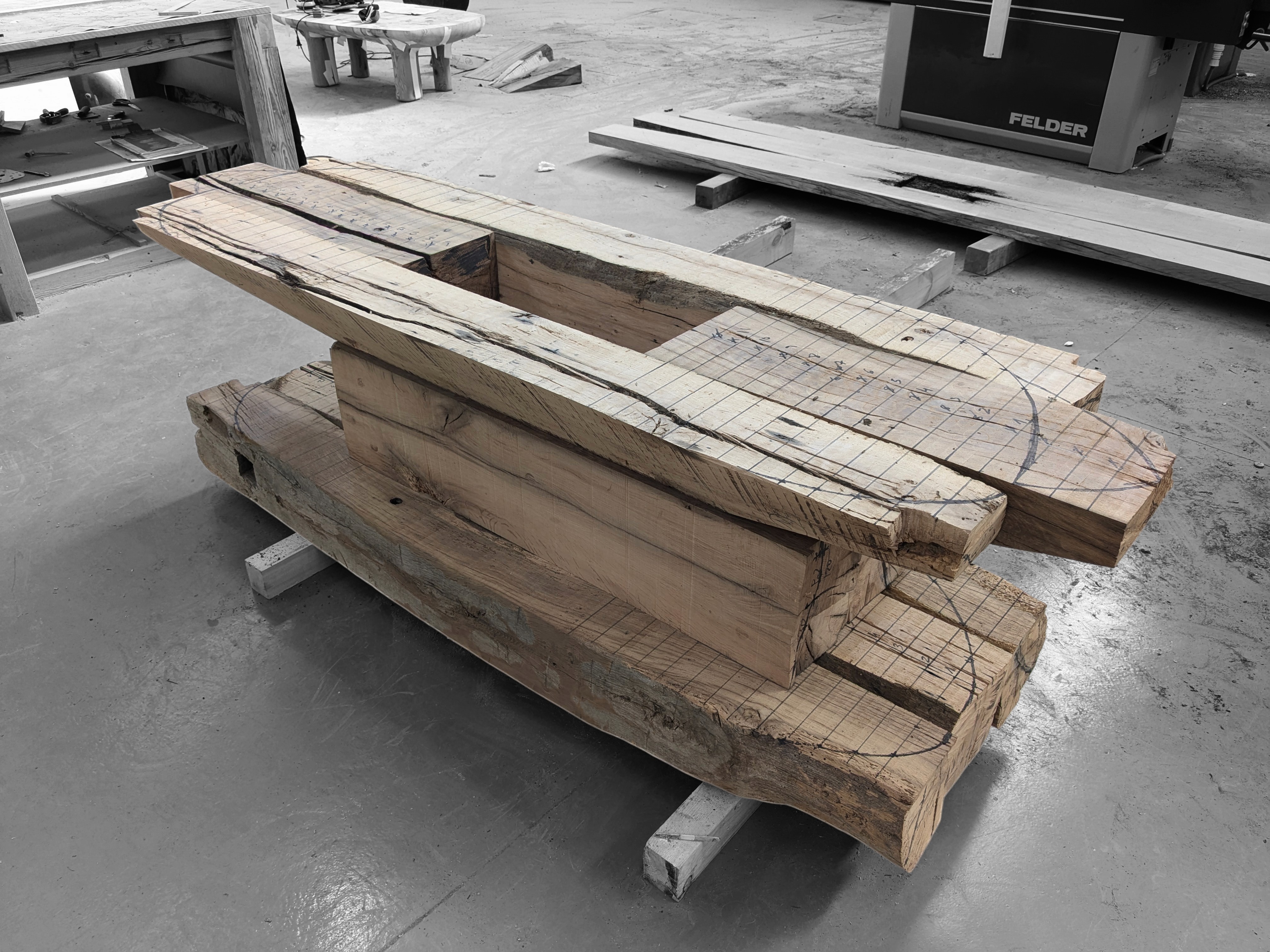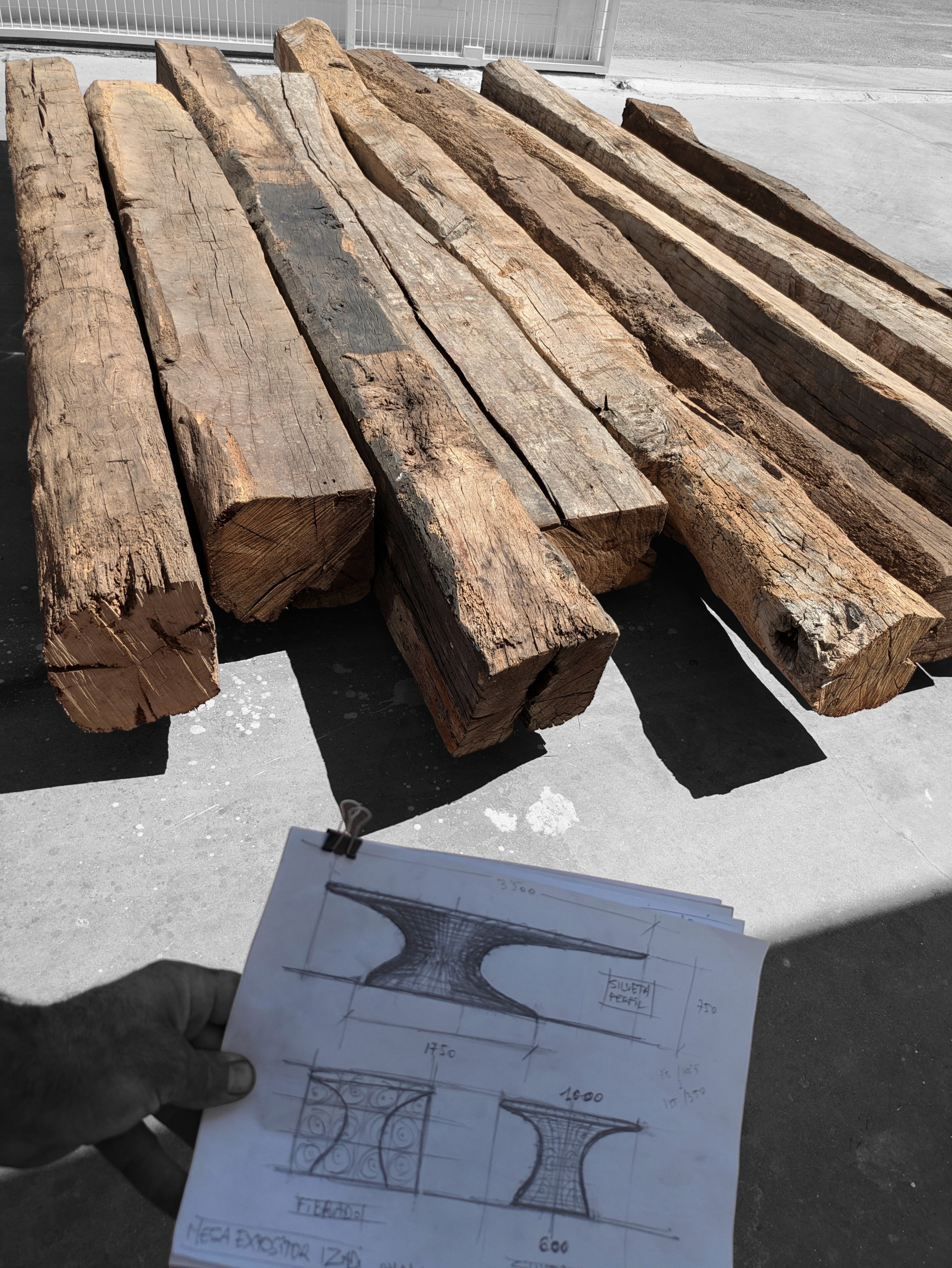 We sourced a batch of those beams from caseríos in the region. They were heavily damaged — but Spanish oak is a resilient tree, and even in that state the structural timber still had everything it needed to become something extraordinary.