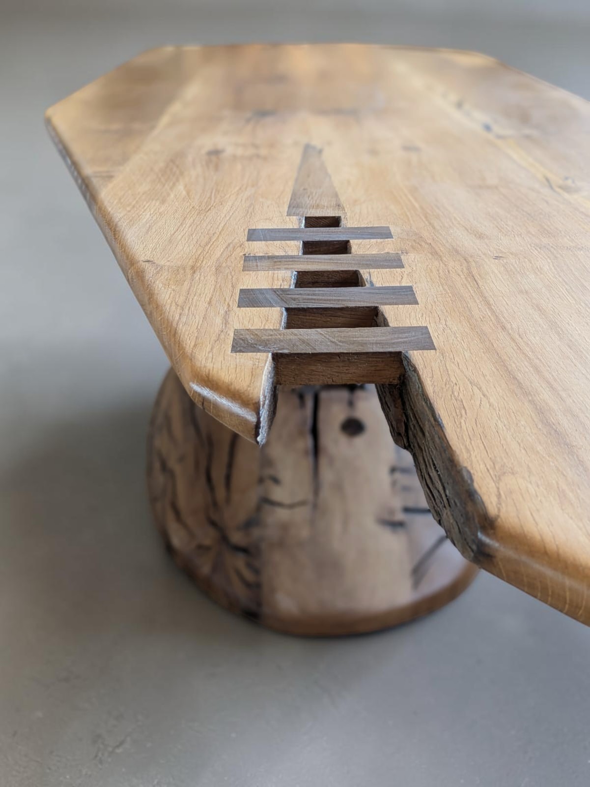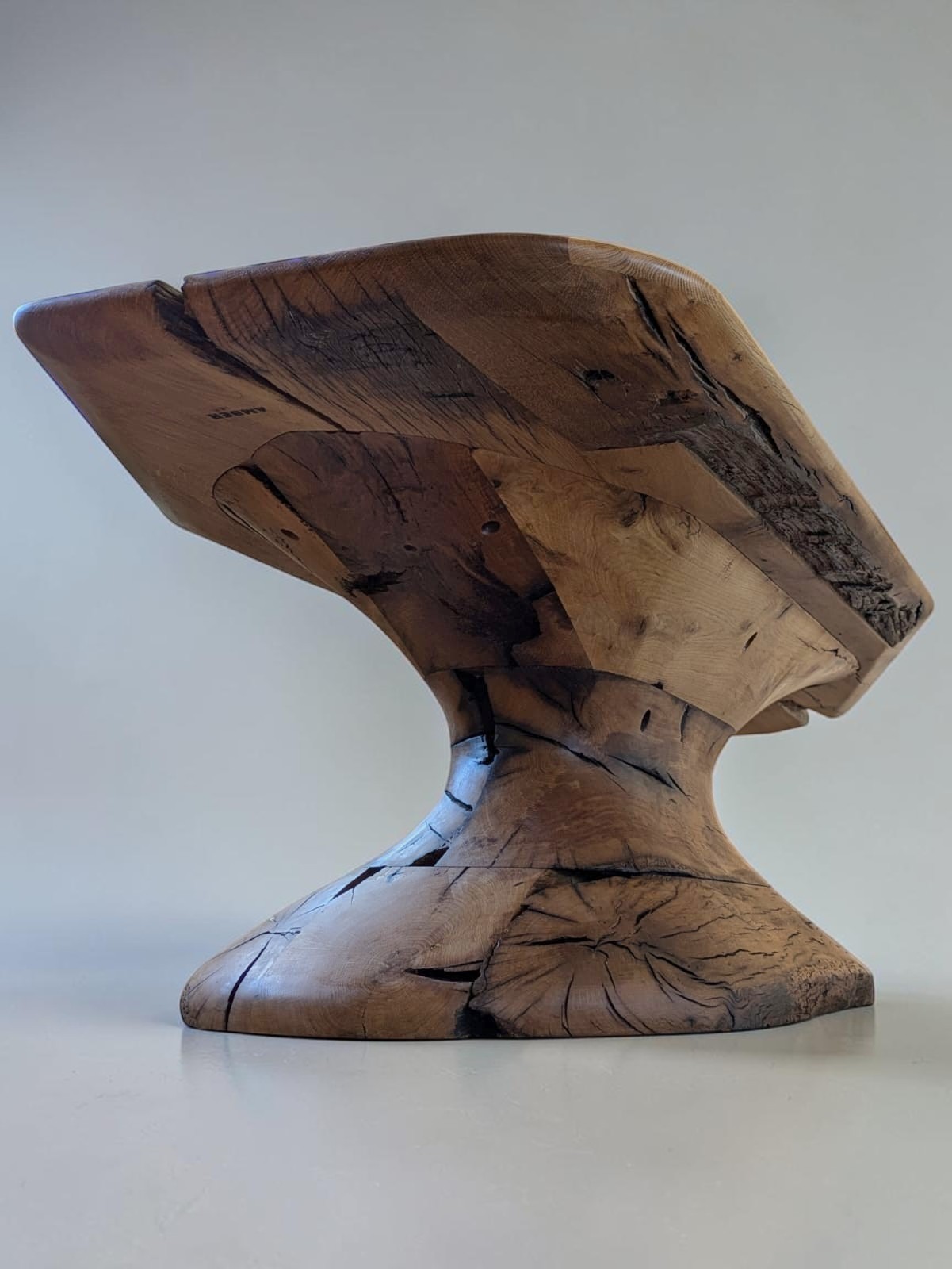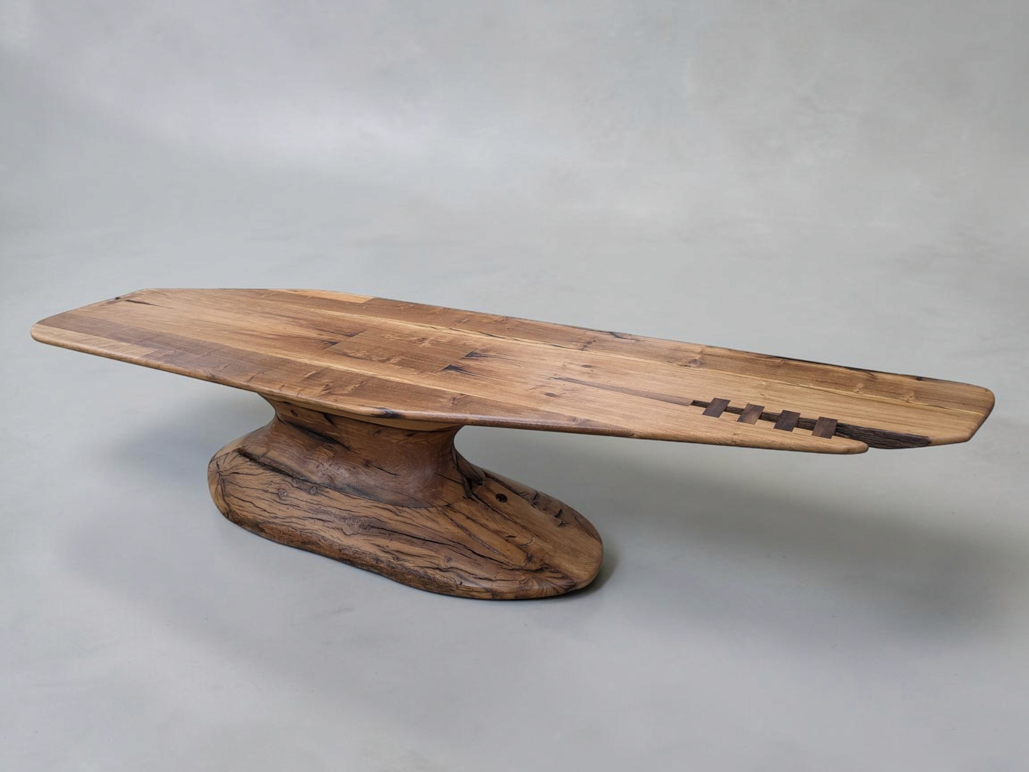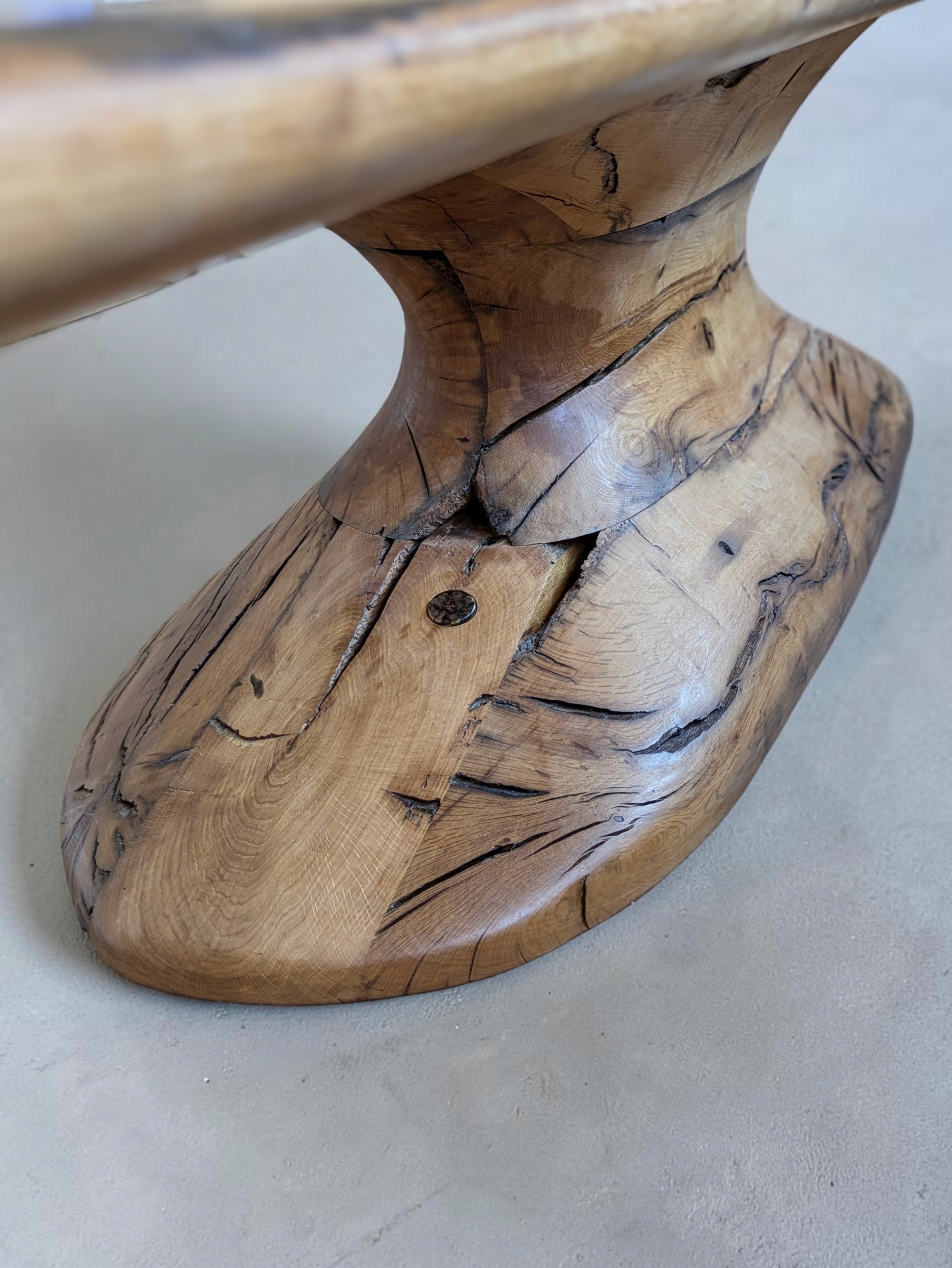 UC81 is a sculptural dining table with a solid central base, carved and shaped into a vortex form that progresses upward toward the top. The unavoidable age and scars of the wood meet a form of absolute contemporary ambition — one eye on a long history, the other firmly on the future. Exactly what the winery wanted to say.