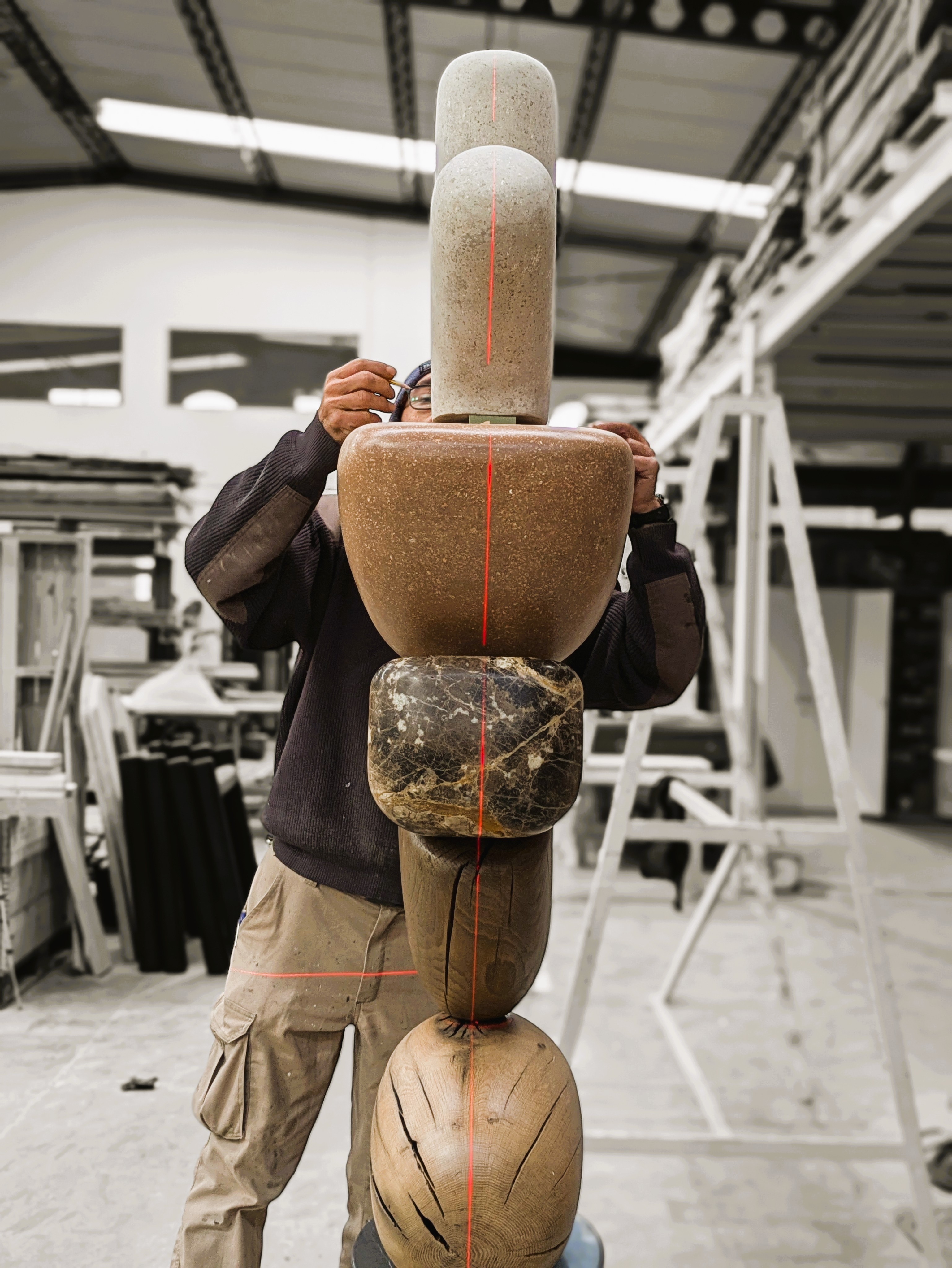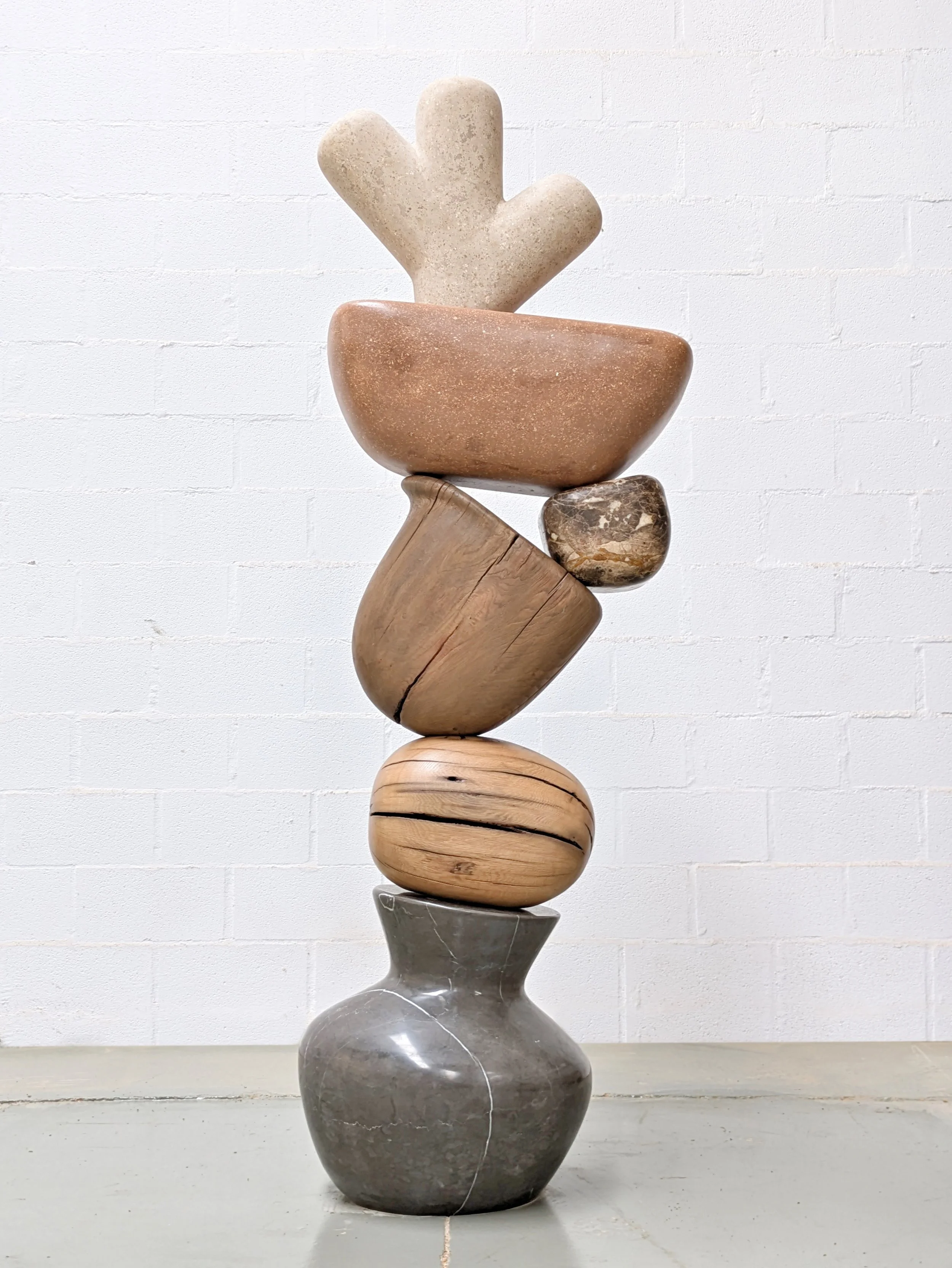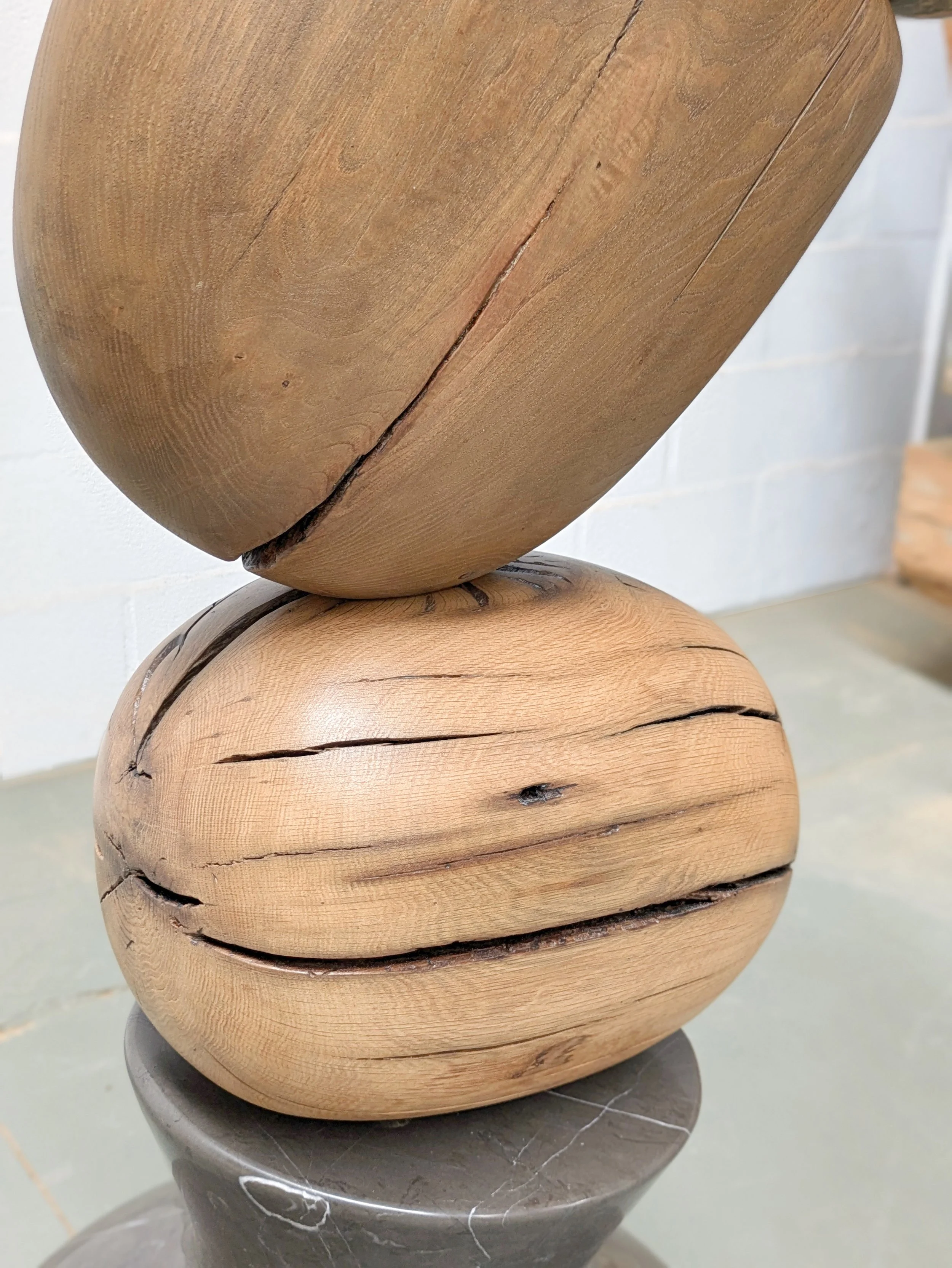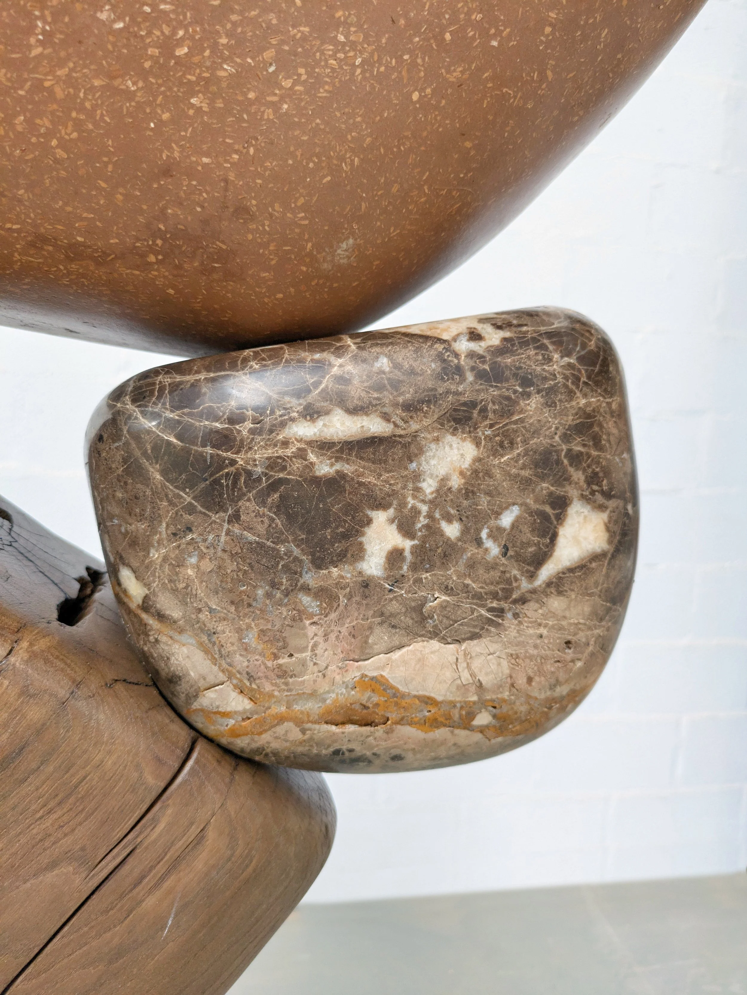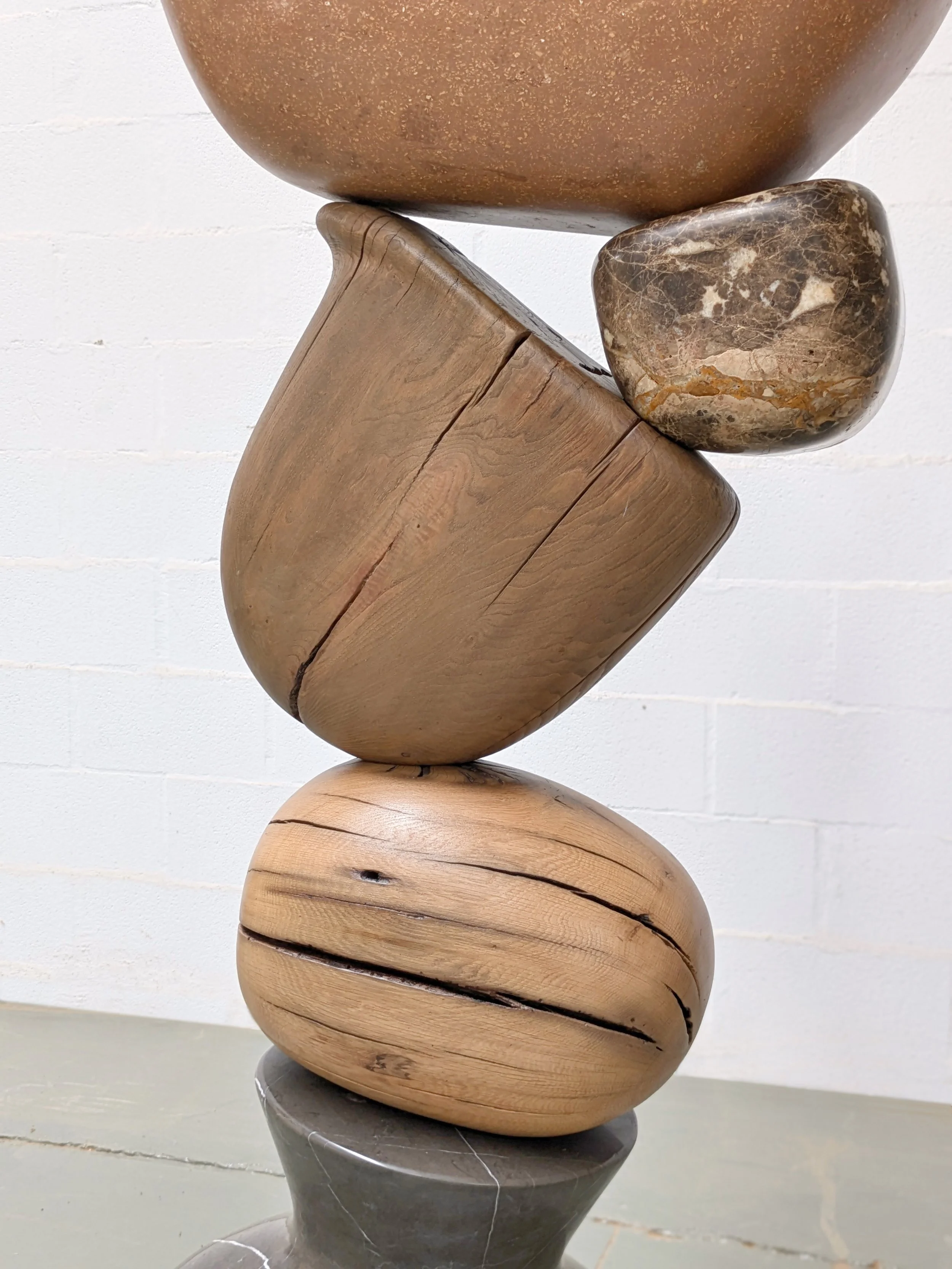 The sculpture is 200kg of Pietra grey marble, Emperador marble, recovered oak and chestnut, and Amberlite — a lightweight mortar of wood shavings and recycled cardboard that achieves a durable mineral surface on shaped forms. At two metres high, the upper pieces needed to be light. Amberlite was the answer.