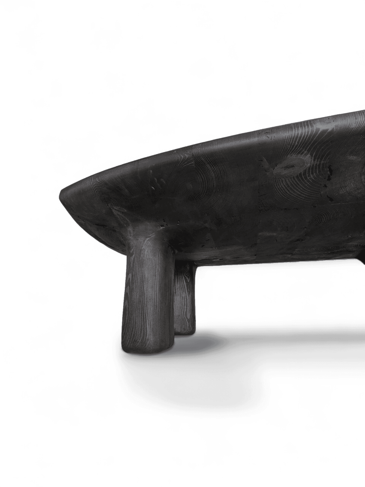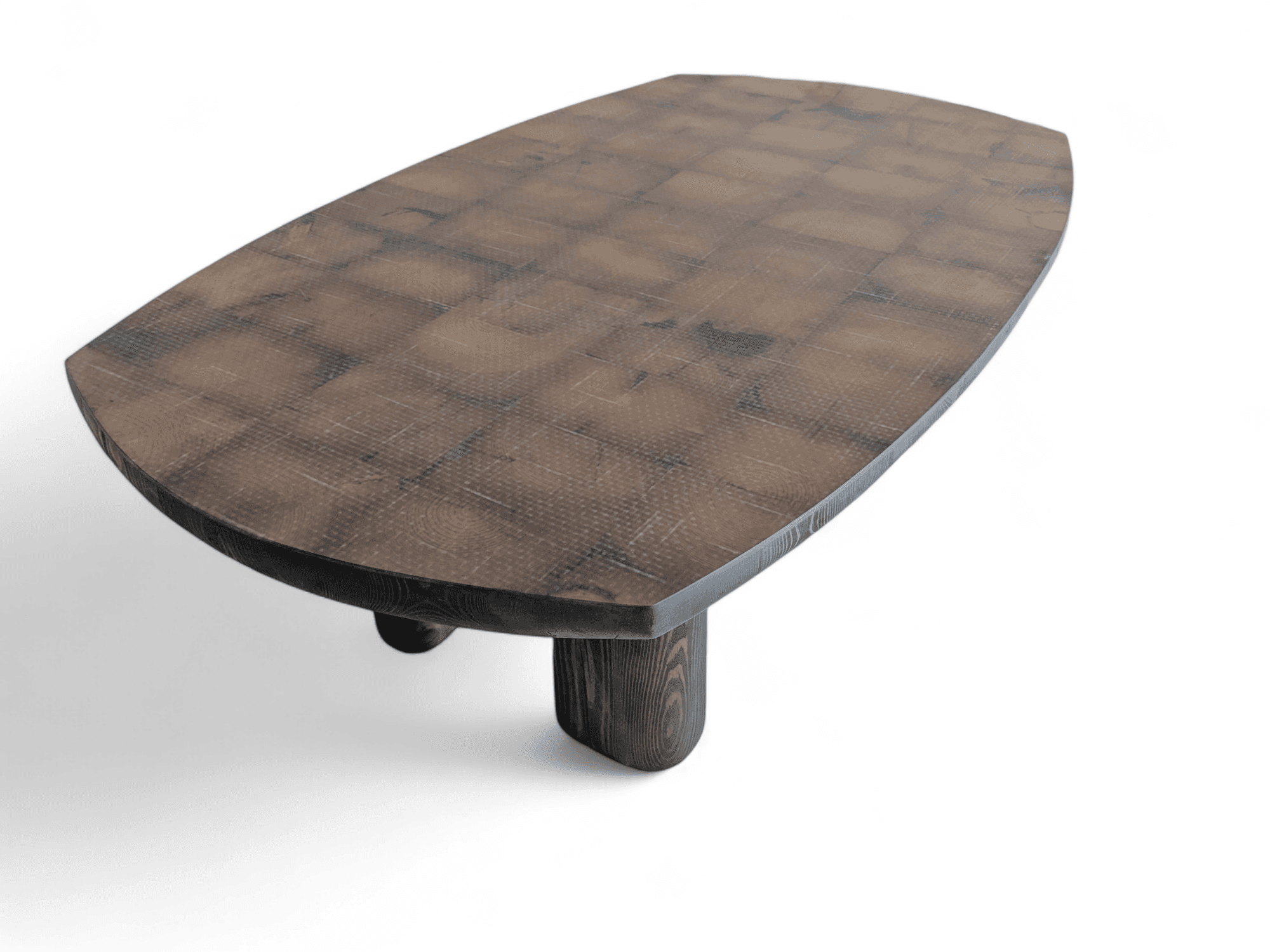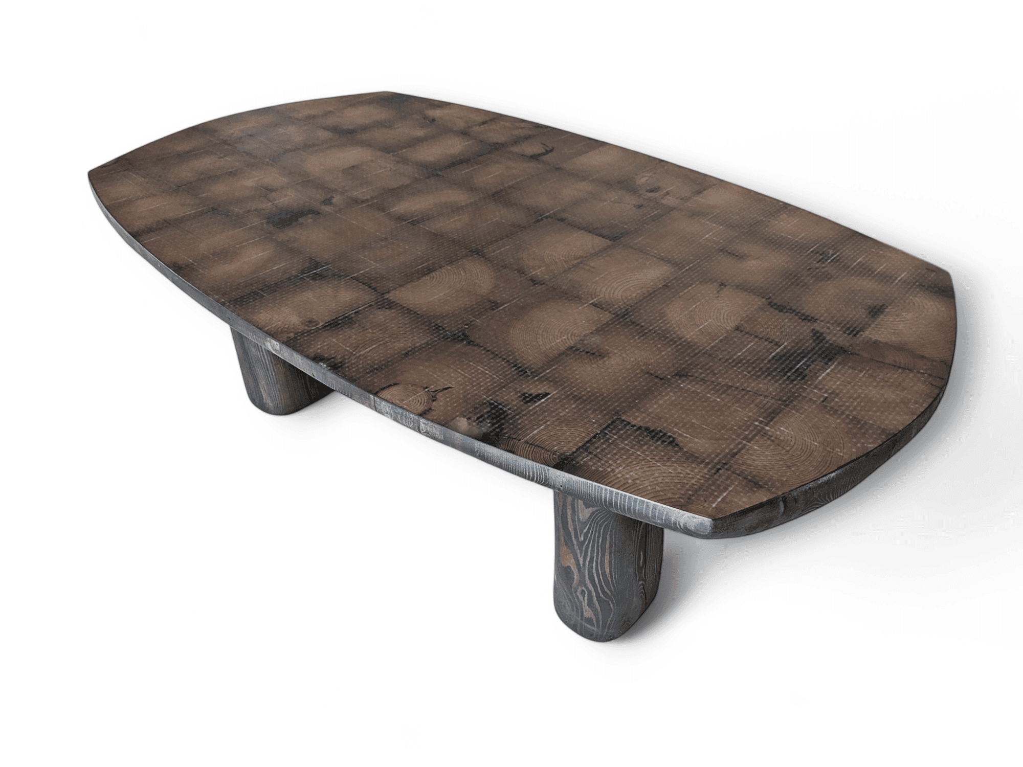 We saw a glimmer of beauty in that peculiar mark left by time. Once enough had accumulated, we brought them to a uniform cross-section, aligned them in a grid, and filled the gaps with resin. Fibreglass reinforcement beneath the surface allowed us to present them vertically — an unconventional orientation that transforms what was structural into something sculptural. Shaped into an organic, suggestive geometry and finished in black oil.