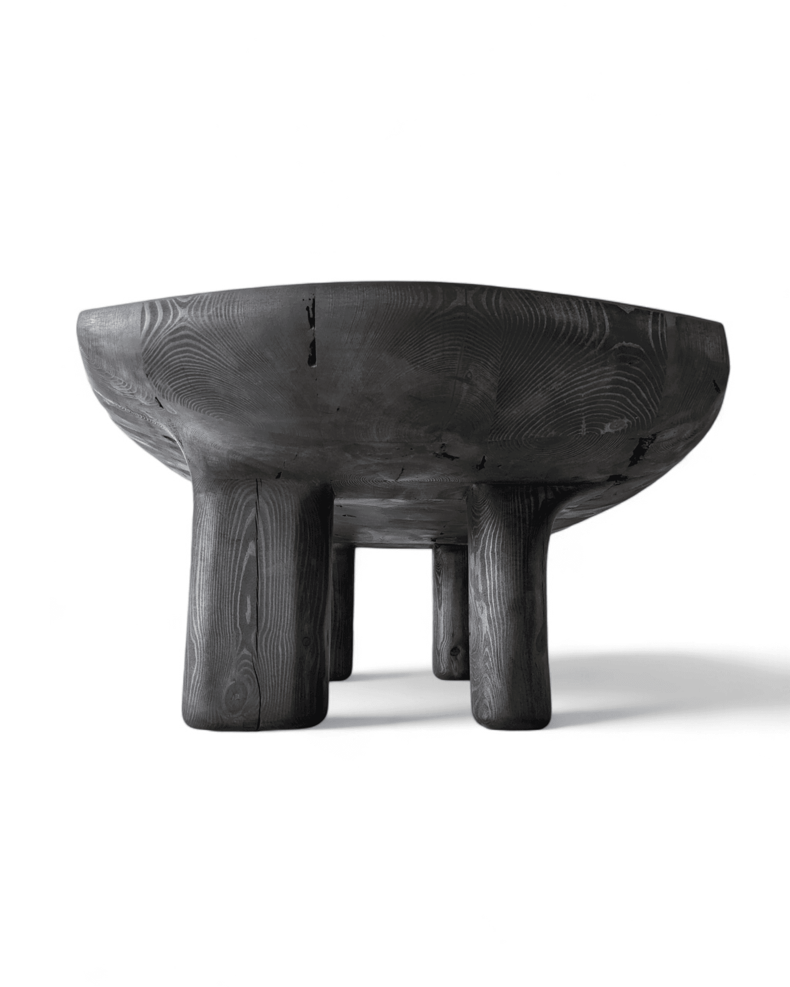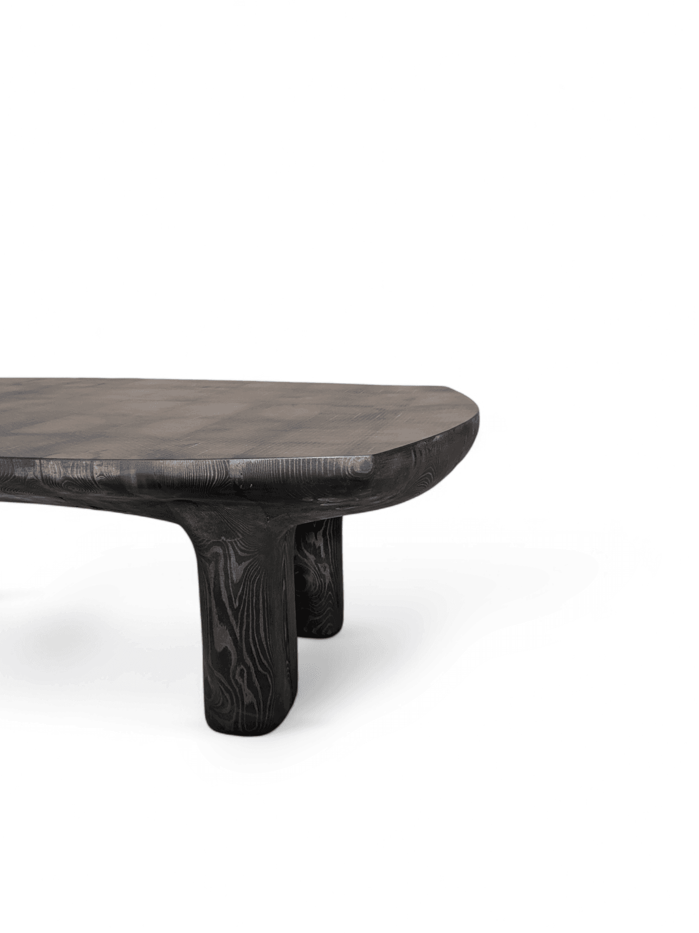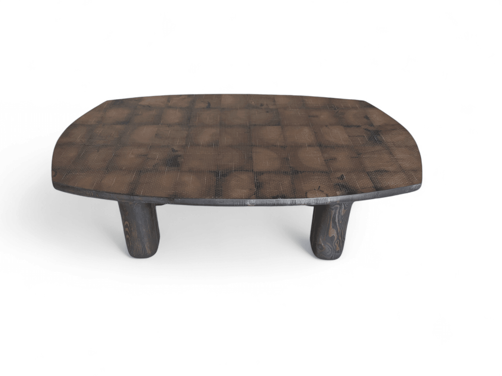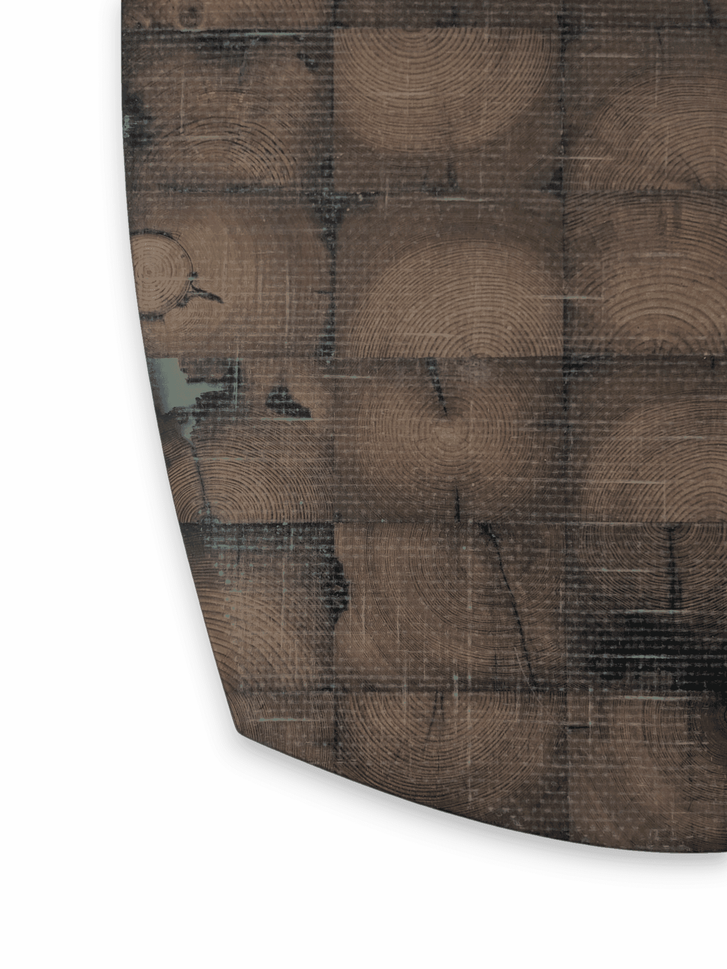We saw a glimmer of beauty in that peculiar mark left by time. Once enough had accumulated, we brought them to a uniform cross-section, aligned them in a grid, and filled the gaps with resin. Fibreglass reinforcement beneath the surface allowed us to present them vertically — an unconventional orientation that transforms what was structural into something sculptural. Shaped into an organic, suggestive geometry and finished in black oil.