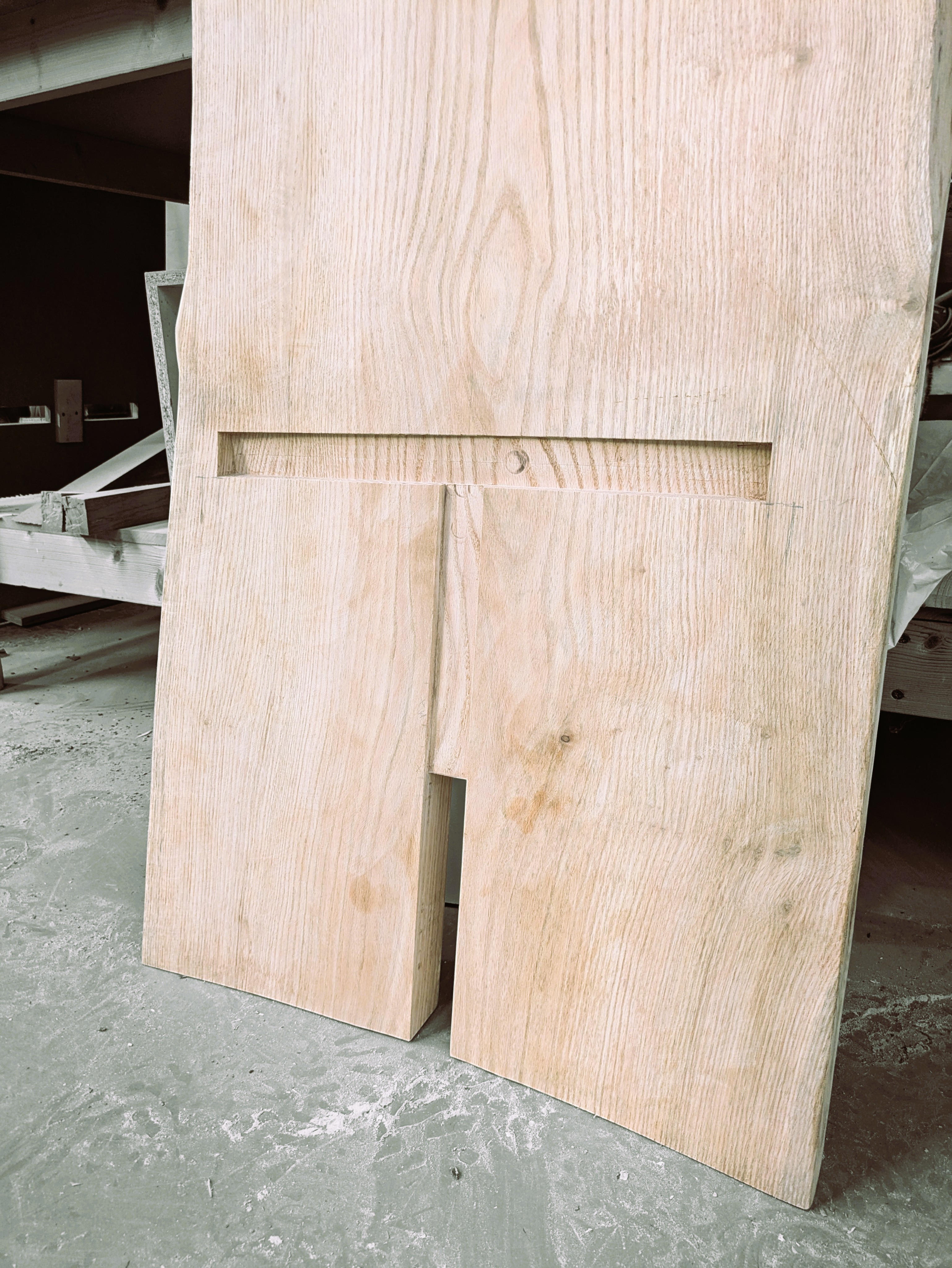 Someone offloaded a pair of wide French oak slabs — beautiful wood, but badly warped. Concave across their full width. The conventional approach would have been to flatten them, which would have consumed most of the thickness and left nothing worth working with.