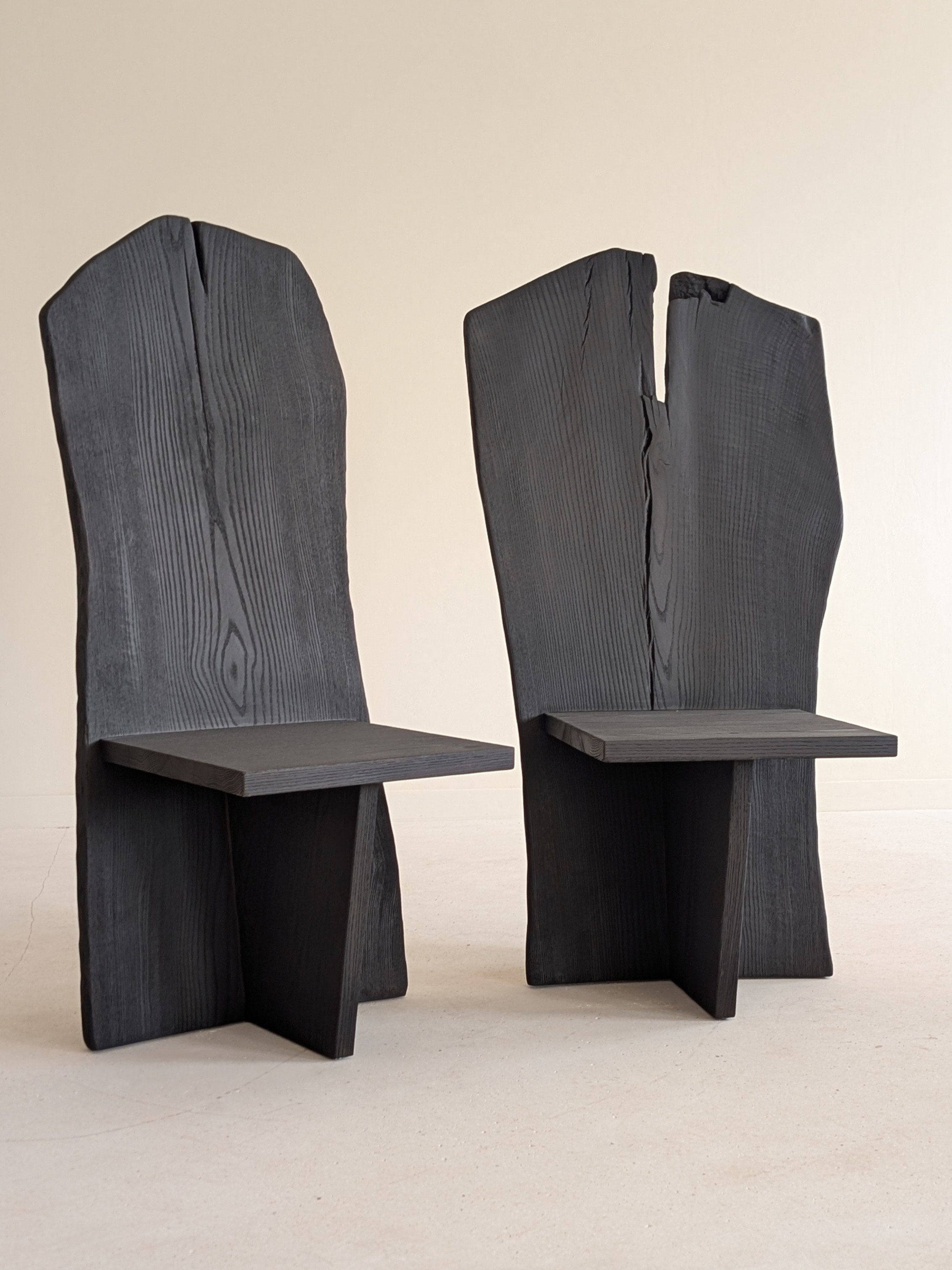 The result is a pair of throne-like seats: no armrests, no ornament, just a dramatically tall curved back and a base of two crossed rectangular planks. Minimal and physically imposing in the way that only large solid wood can be. Joining the crossed base to a concave surface required precise joinery on a curve — not a standard operation, but a satisfying one.