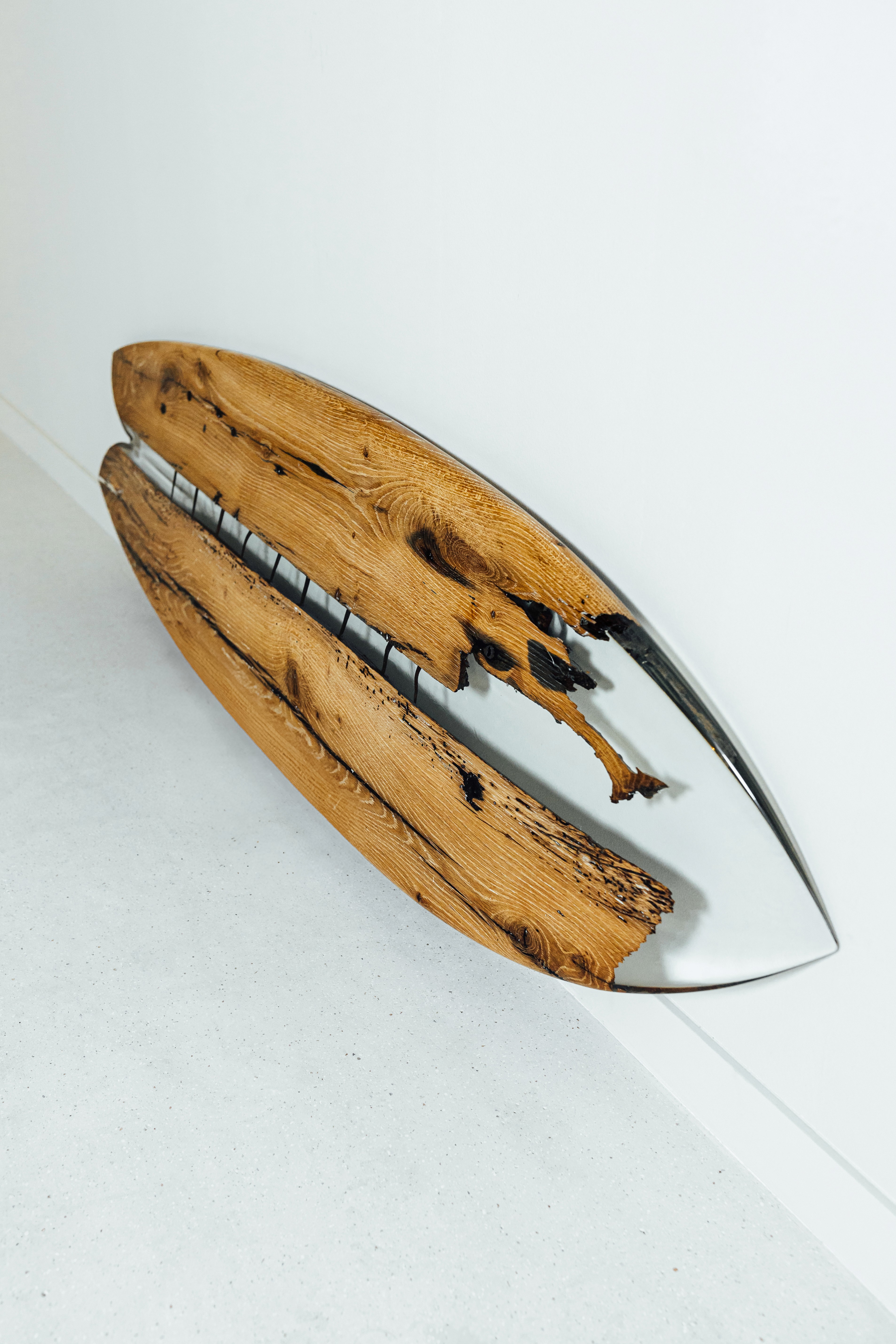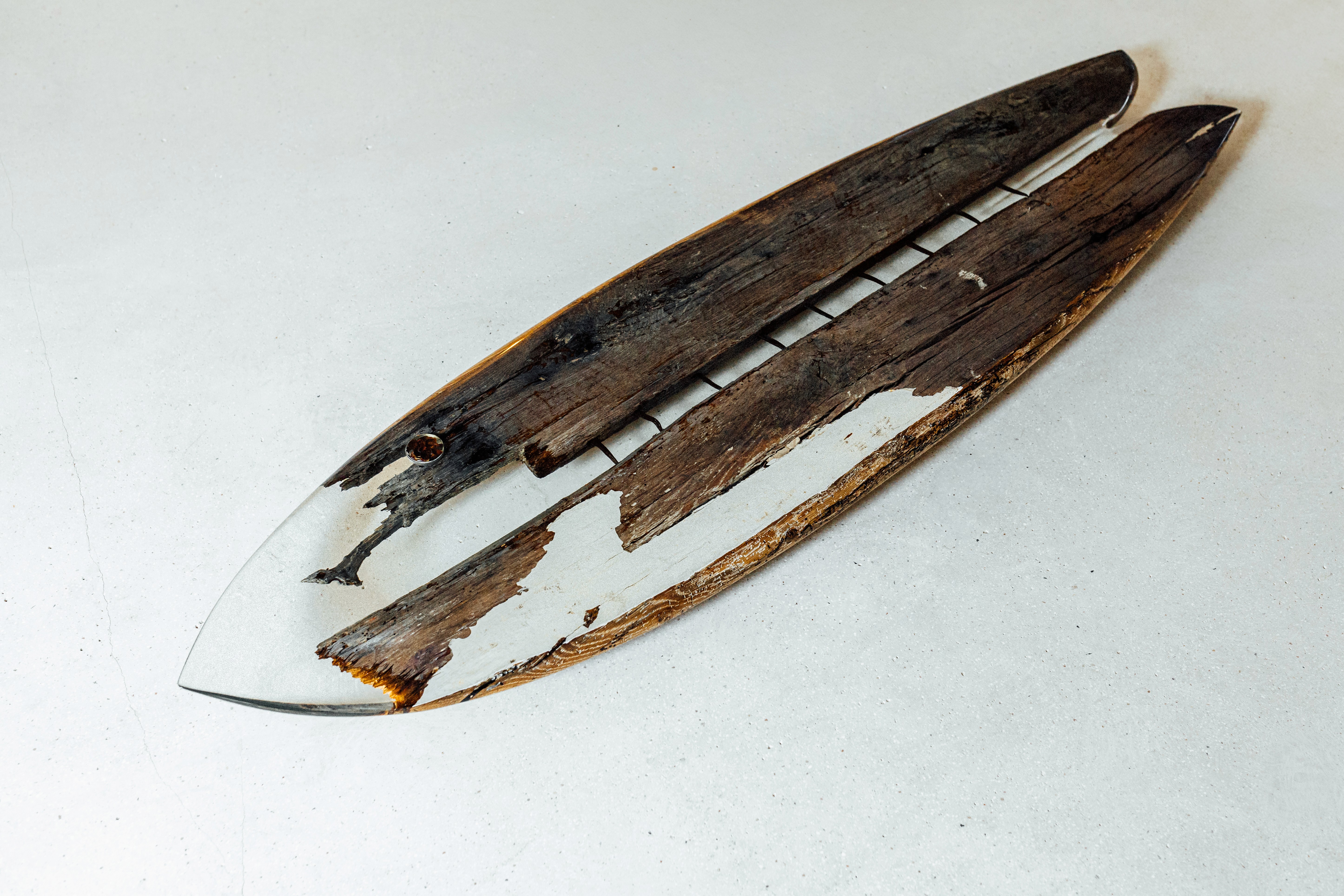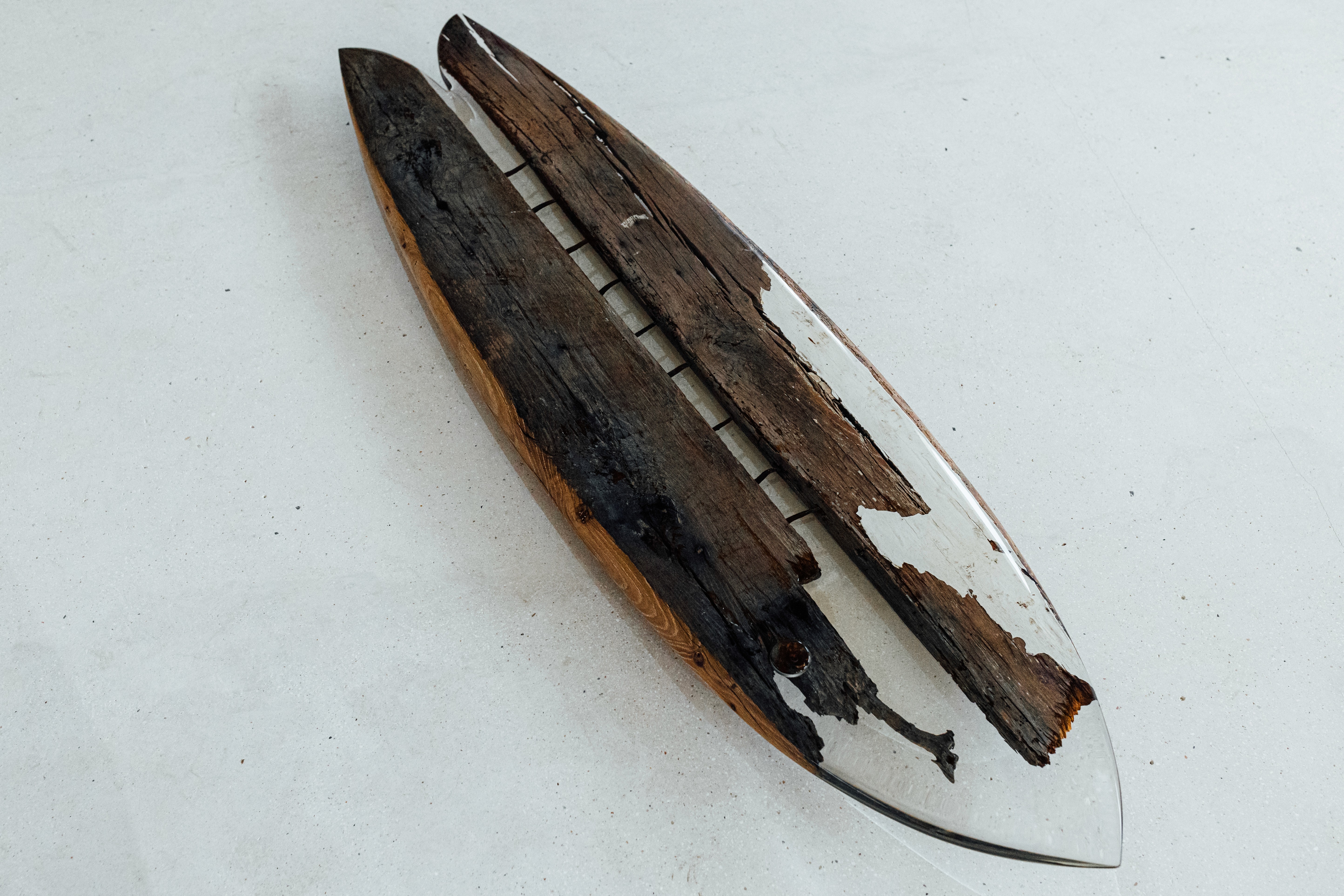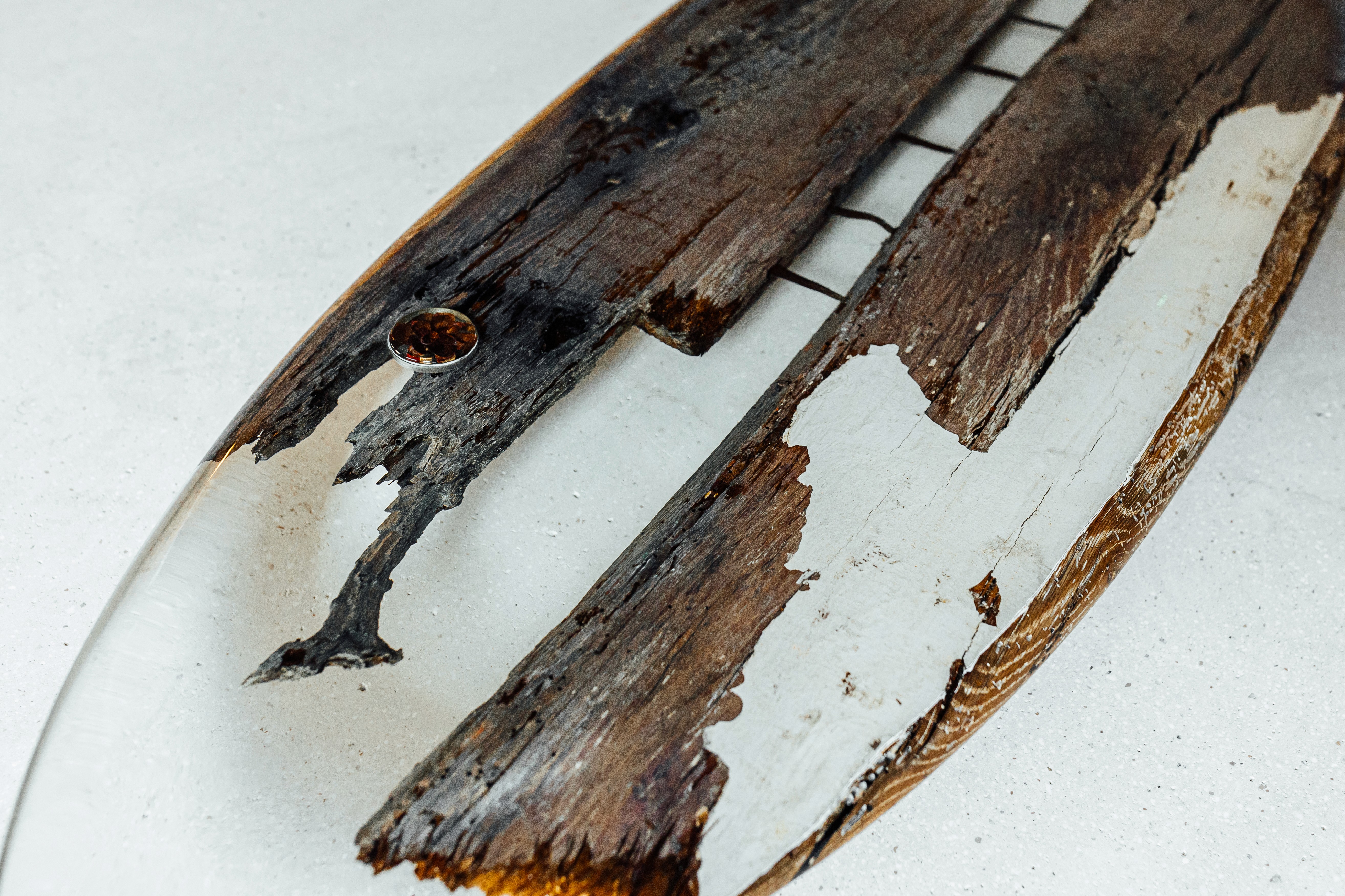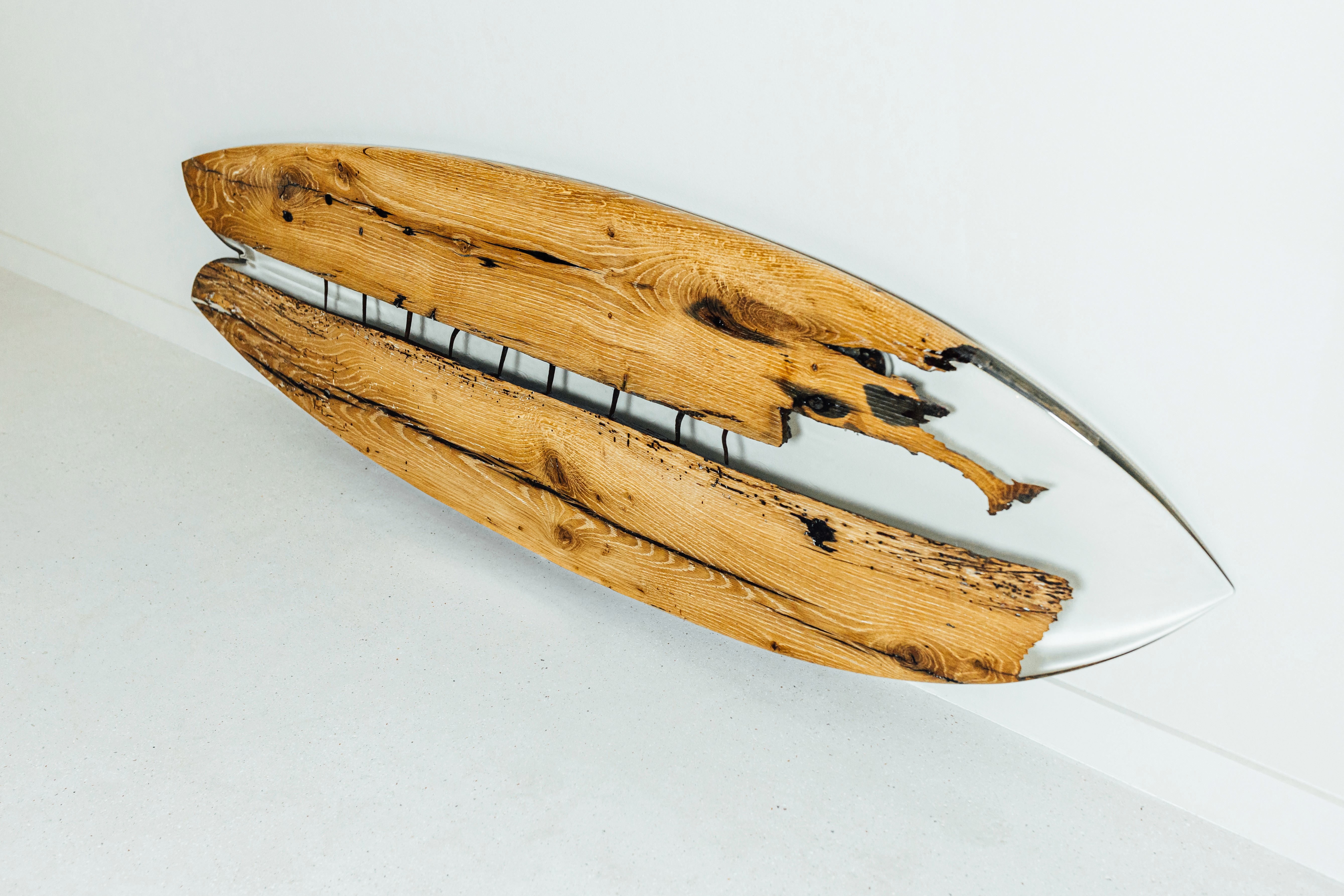 The material: a two-hundred-year-old beam, with its original traces of paint, plaster and nails still intact, encapsulated in resin. The finish was polished to a transparency that made the ancient wood visible as if behind perfect glass — every grain, every mark, every decade of its previous life preserved and legible.