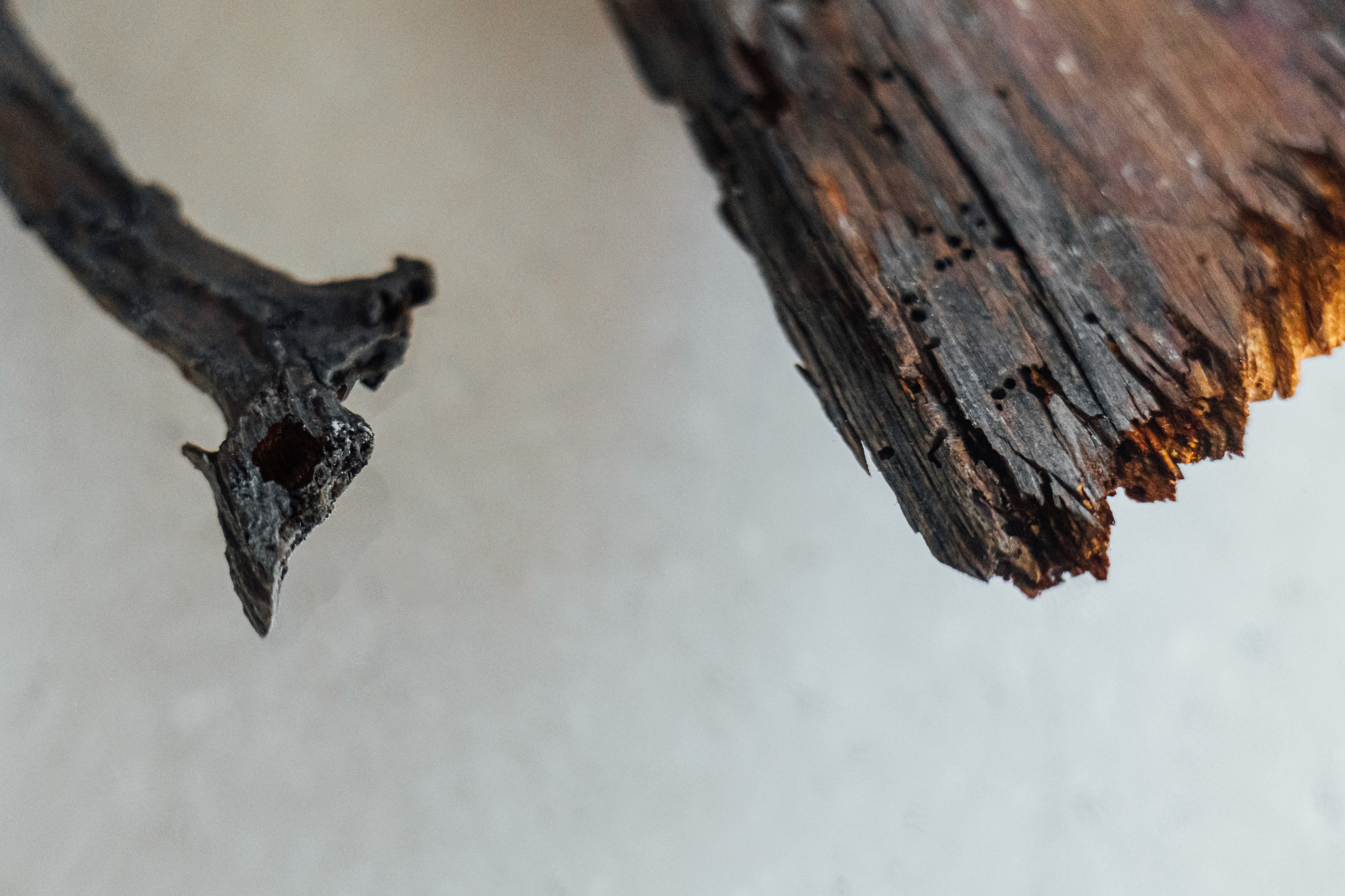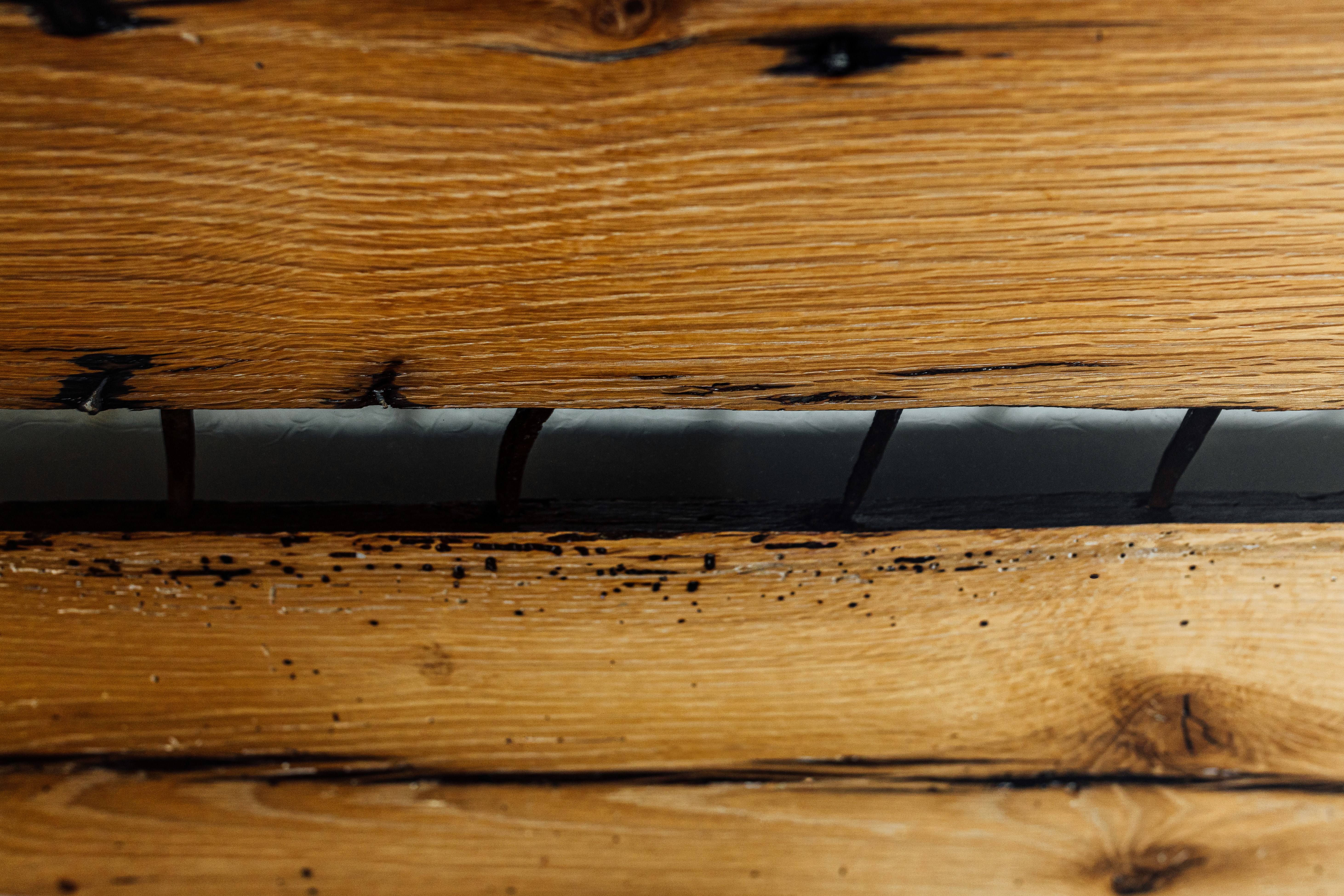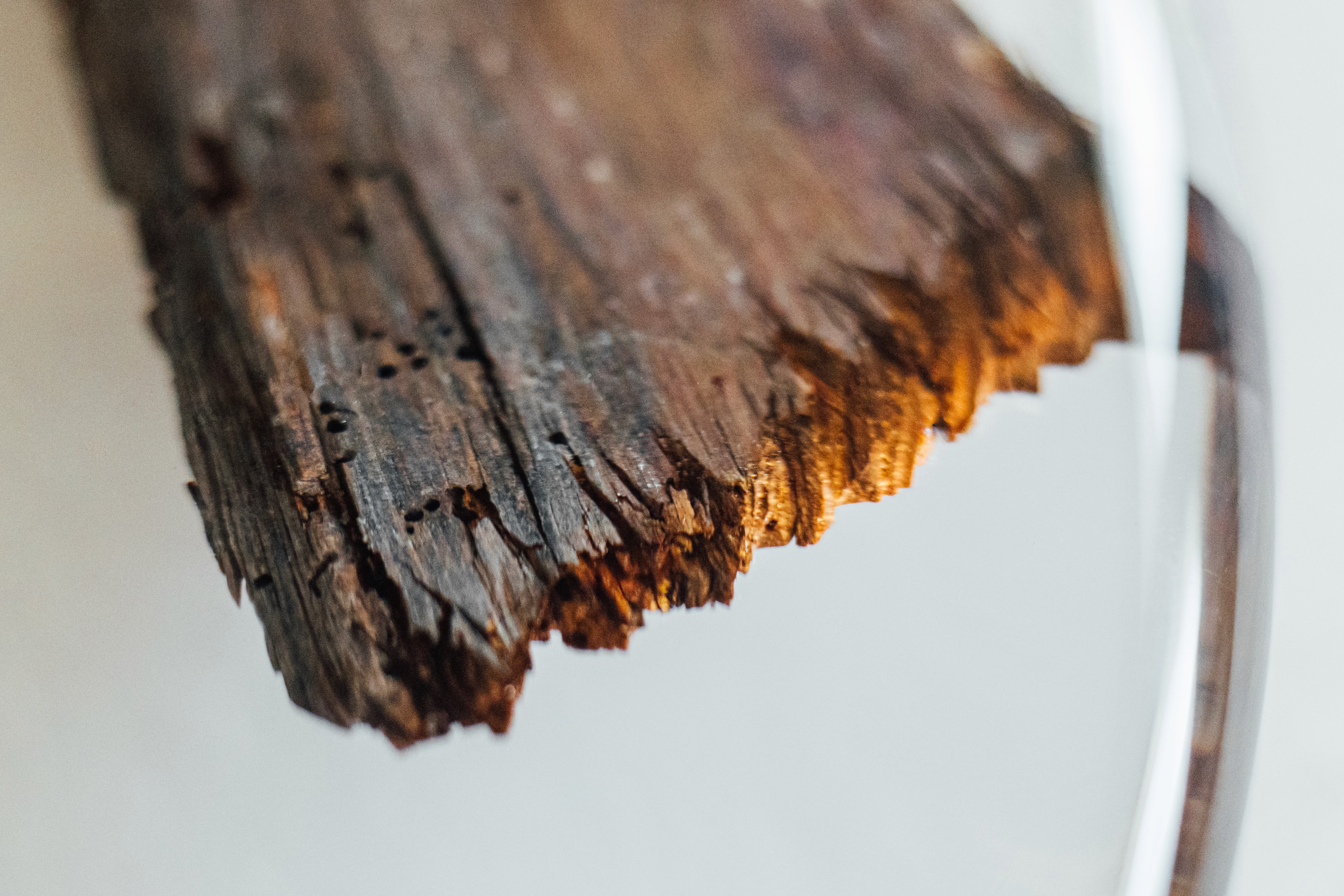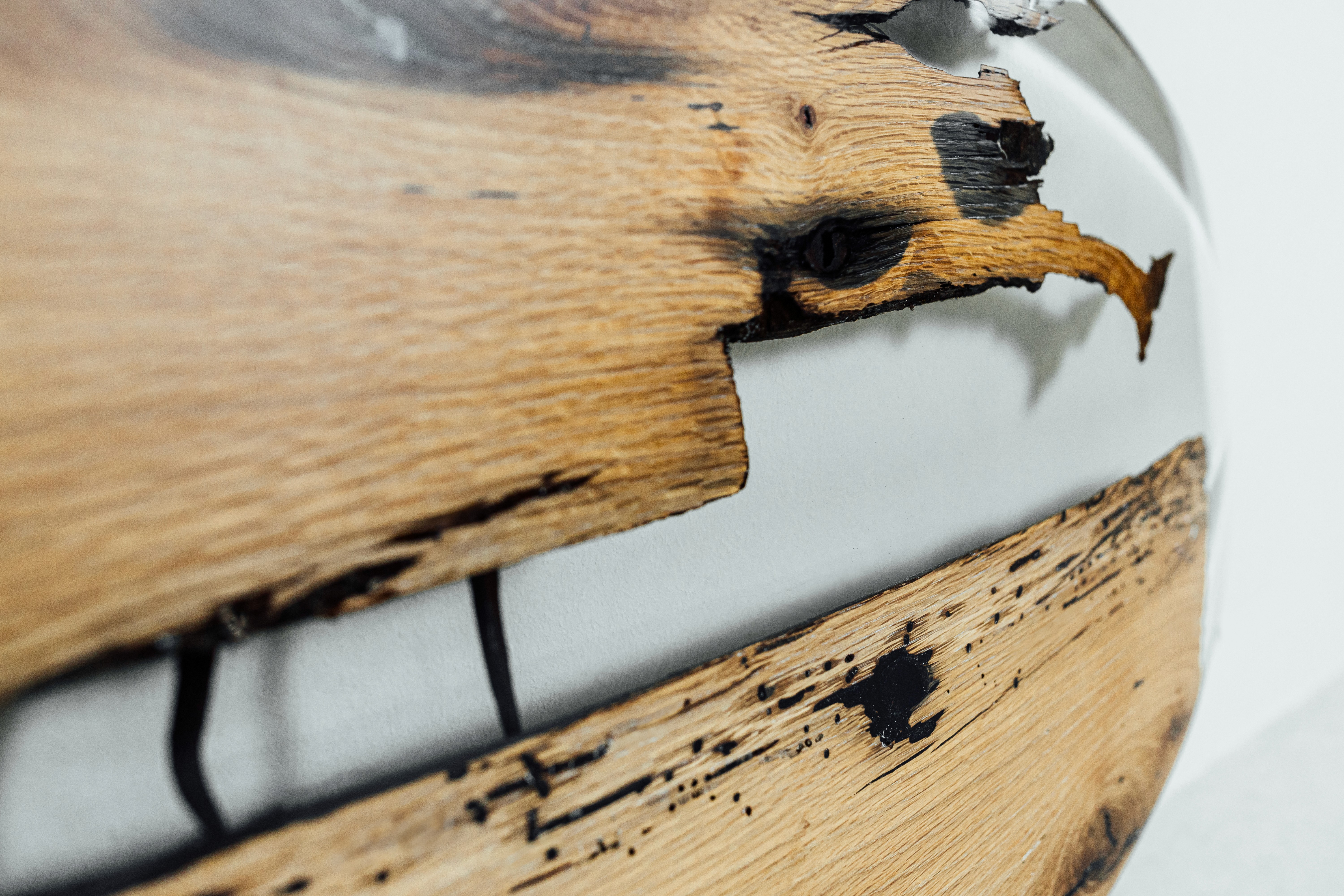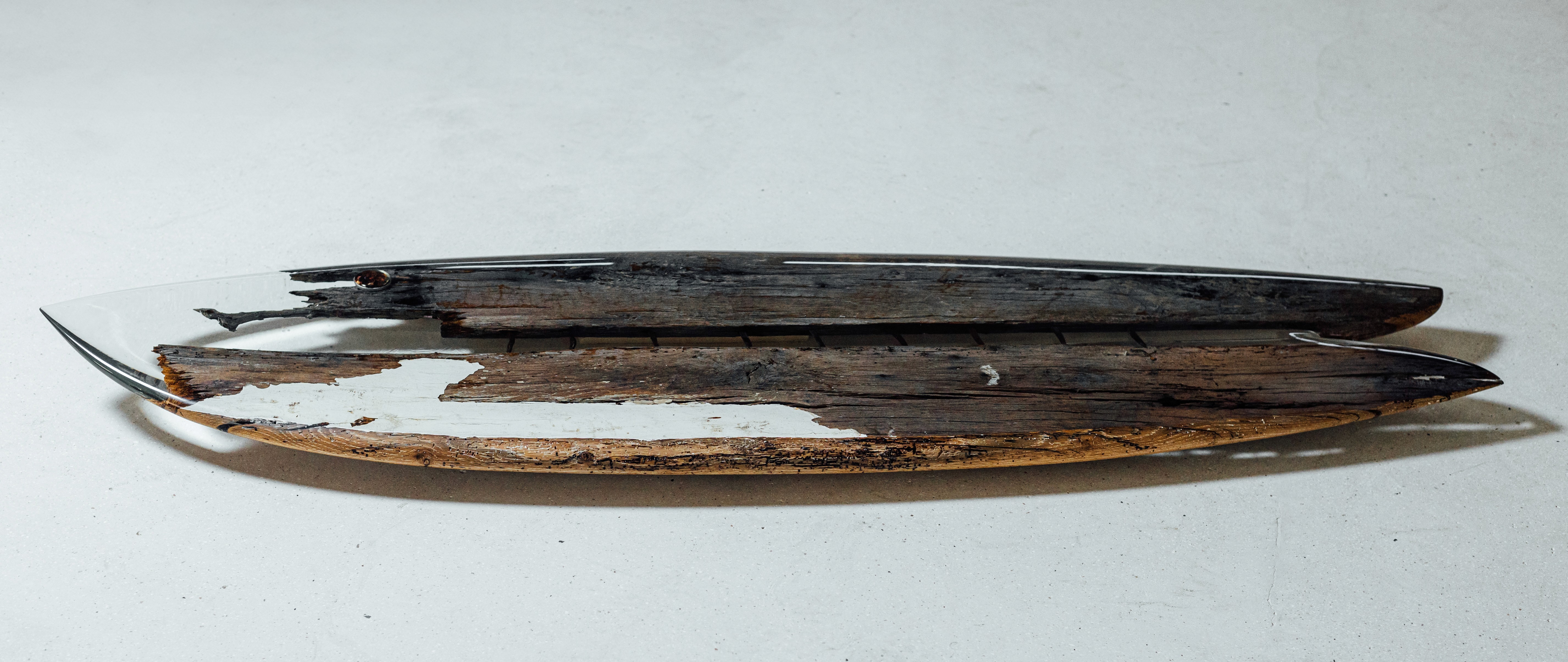 The material: a two-hundred-year-old beam, with its original traces of paint, plaster and nails still intact, encapsulated in resin. The finish was polished to a transparency that made the ancient wood visible as if behind perfect glass — every grain, every mark, every decade of its previous life preserved and legible.