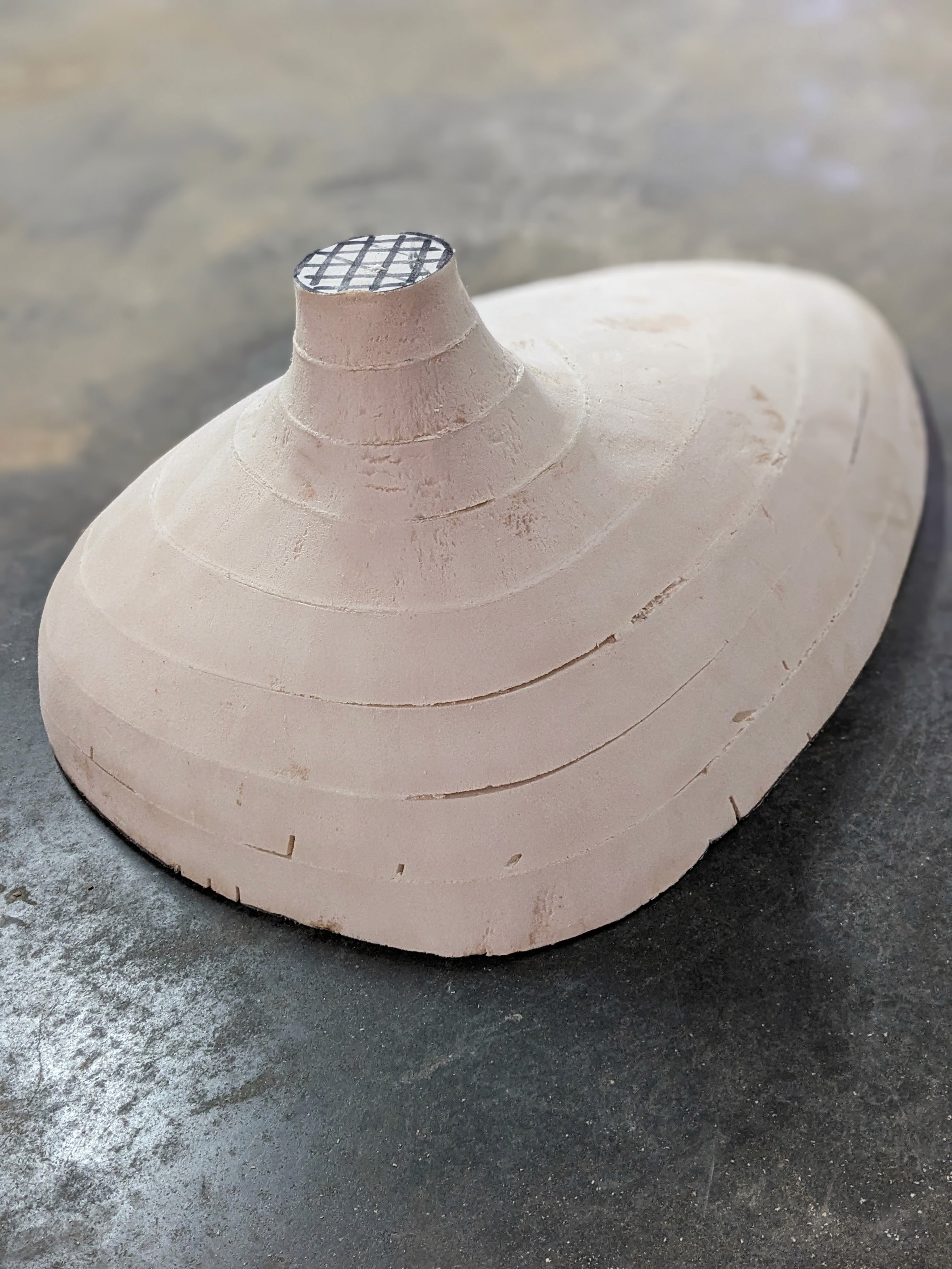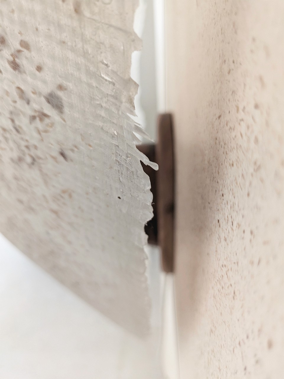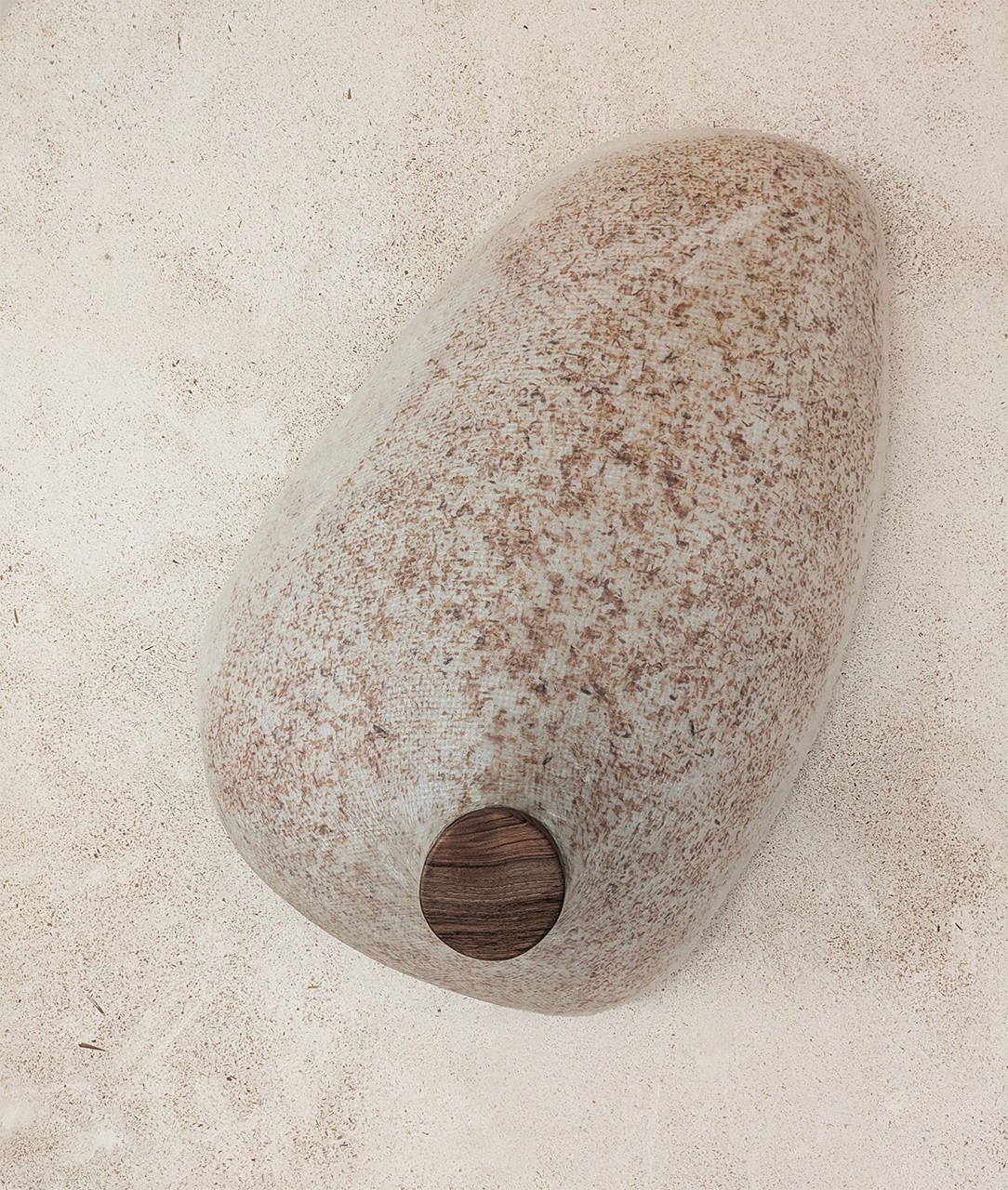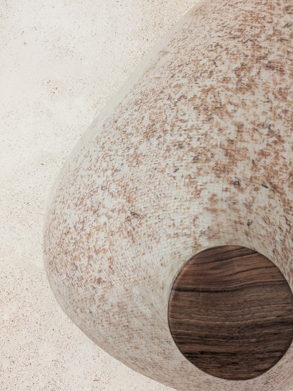 The answer was fibreglass — a shell built by hand, with wood shavings embedded as both structural reinforcement and visual texture. The same material logic as the mortar, expressed differently: not as a coating but as a skin, continuous and translucent, where the shavings are visible as shadows and layers beneath the surface. Getting there with the skills and materials available at the time was not straightforward. That is part of why the result was satisfying.