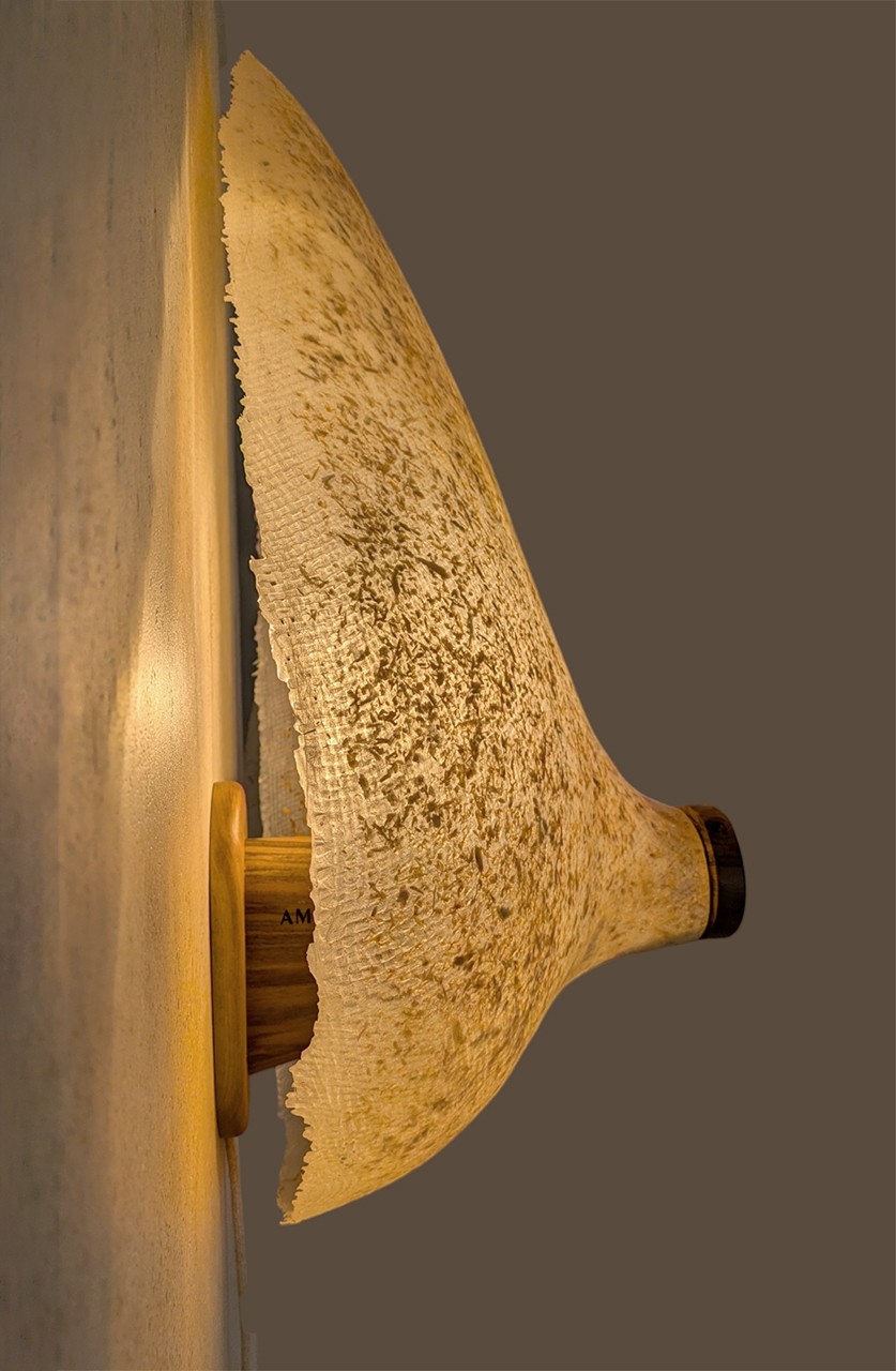 This time, two threads came together. The first was wood shavings — the offcuts from working with reclaimed beams, already repurposed once as a structural and aesthetic ingredient in AMBER's organic mortar. The second was a long-standing curiosity about lighting, and specifically about whether a translucent surface could carry warmth and material presence without resorting to conventional solutions.