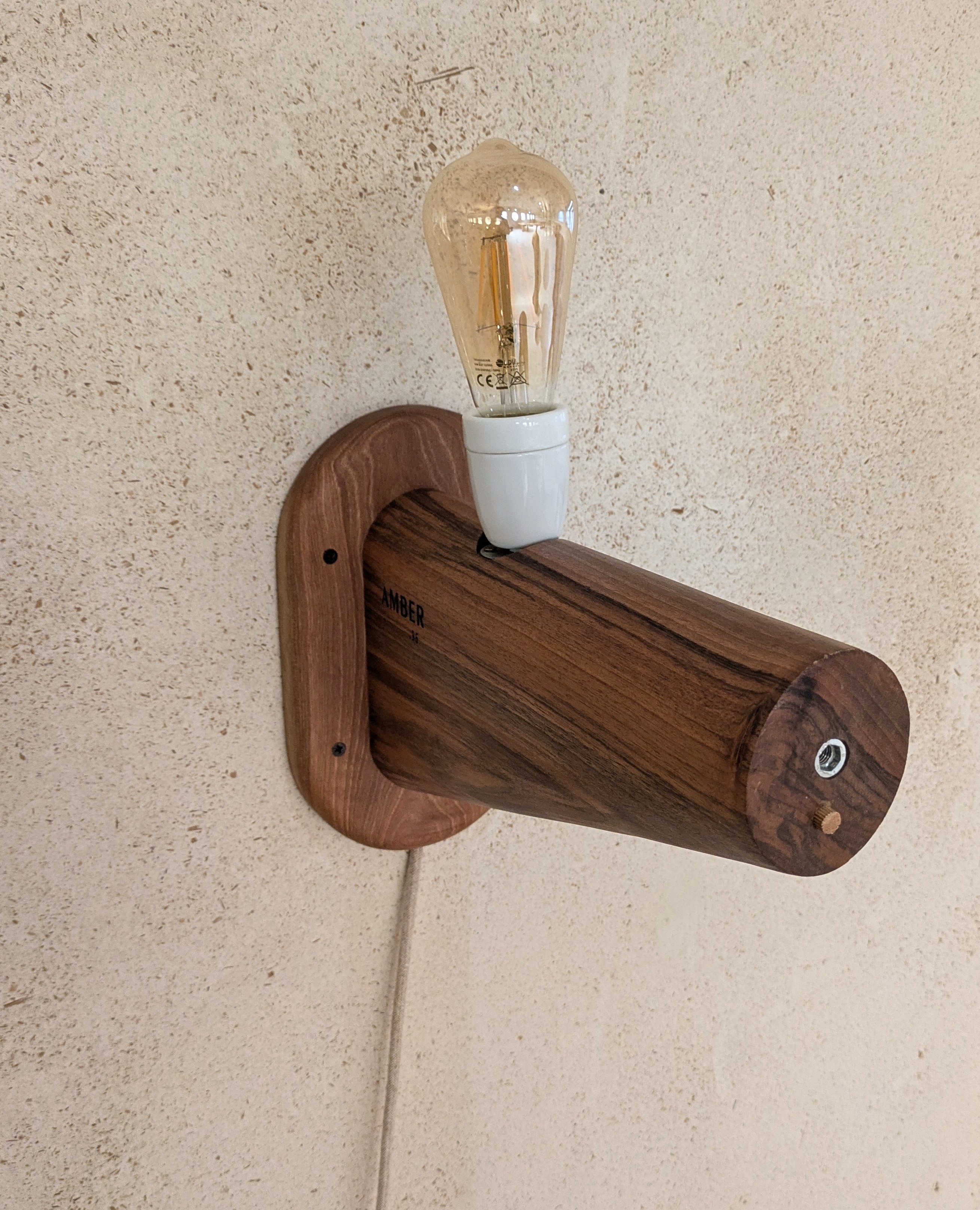 The wall mount is carved from Béjar walnut — a simple wooden arm that anchors to the wall, houses the bulb, and receives the fibreglass shade through a disc of the same wood. Robust, considered, and beautiful in the way that things are beautiful when every decision has a reason.